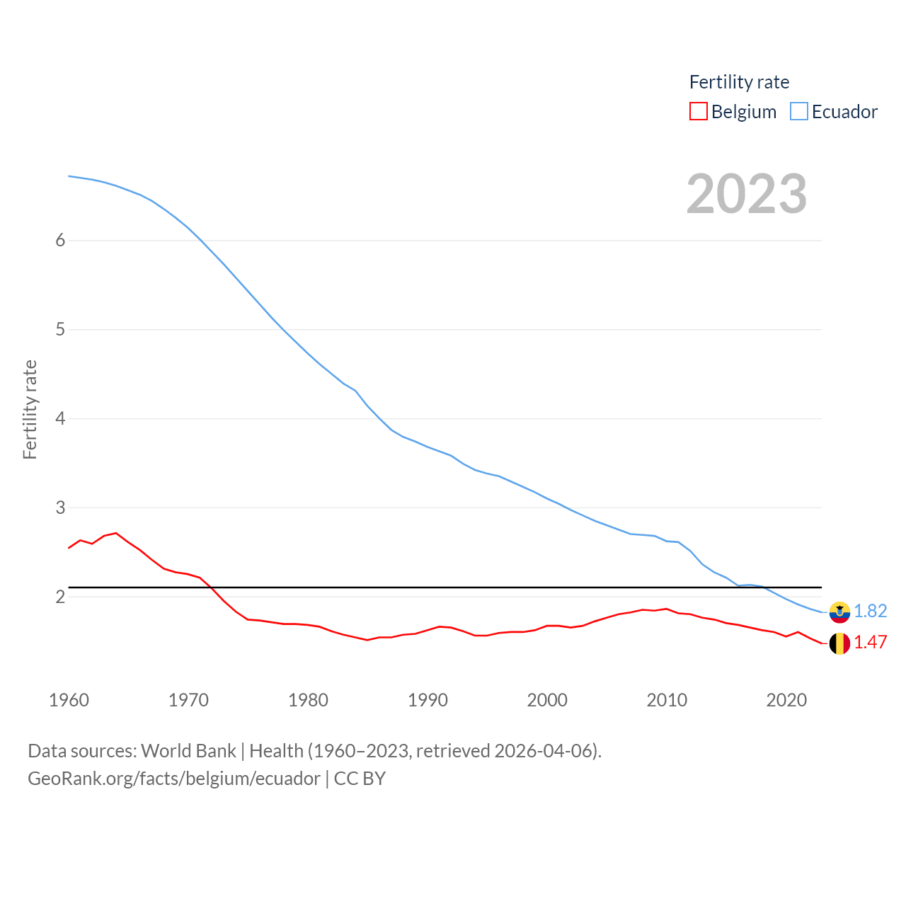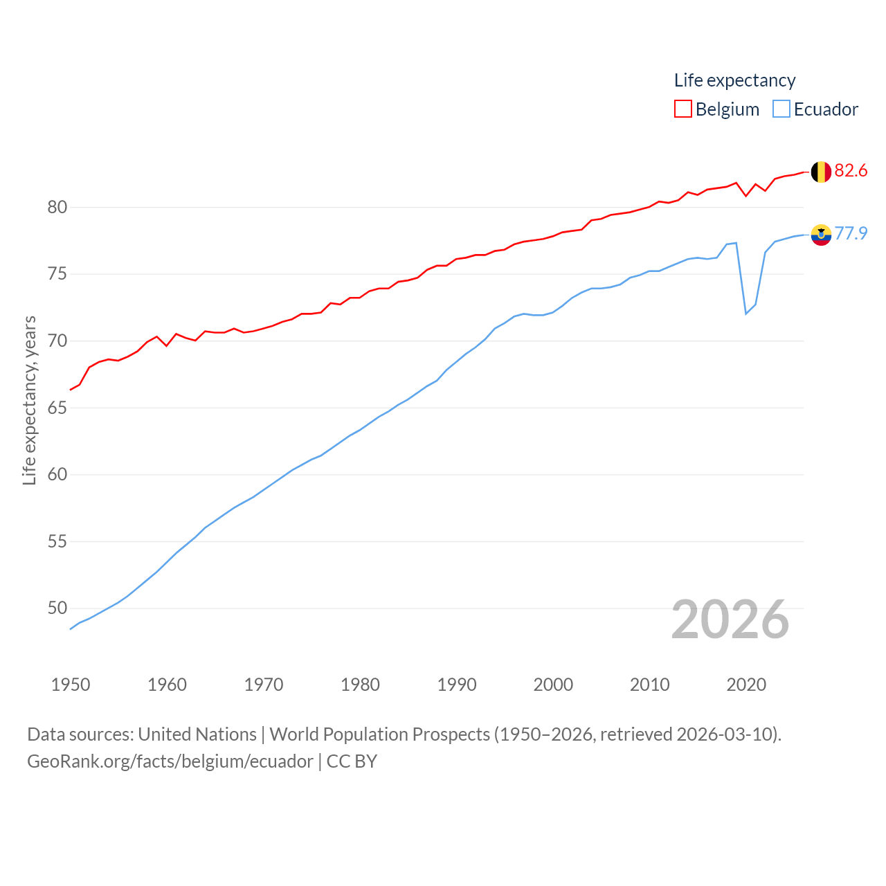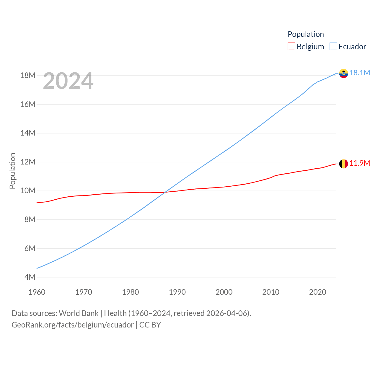 Belgium has a population of 11.9M (ranked 82/197), compared with 18.1M in Ecuador (ranked 71/197). Belgium's land area is 11,774 sq mi versus 95,892 sq mi for Ecuador (ranked 136th vs. 76th).