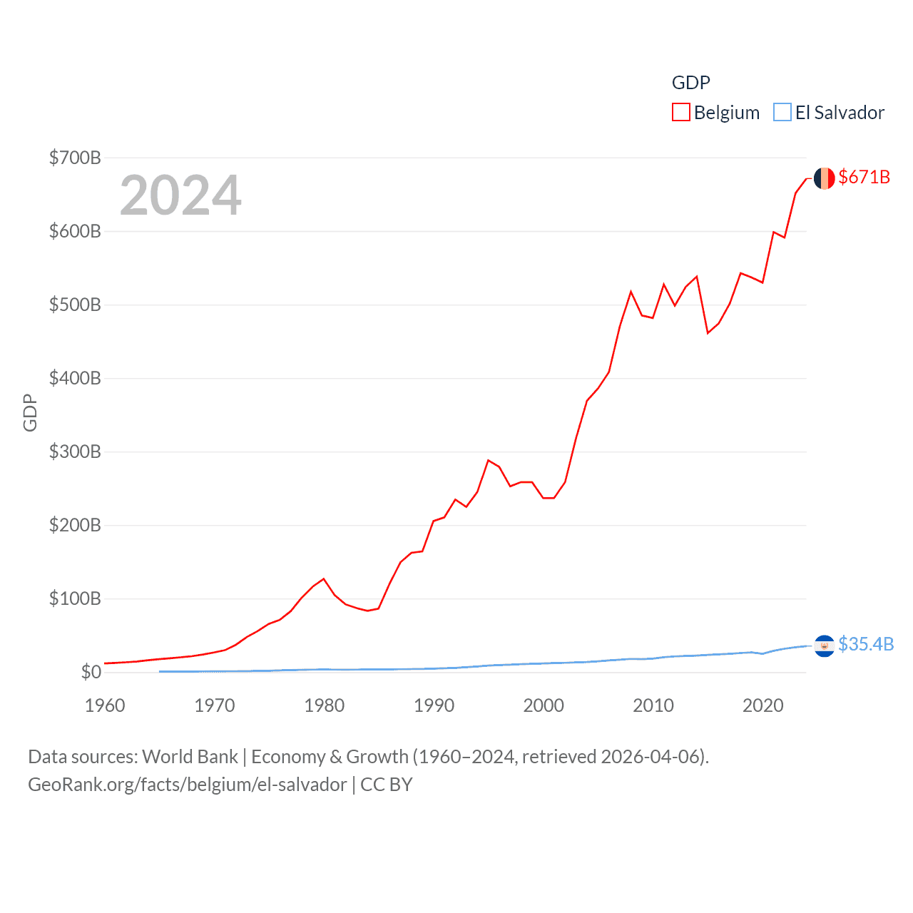 By GDP, Belgium ranks 23/197 ($671B) and El Salvador ranks 105/197 ($35.4B). By GDP per capita, Belgium ranks 18/197 ($56,615), while El Salvador ranks 116/197 ($5,580).