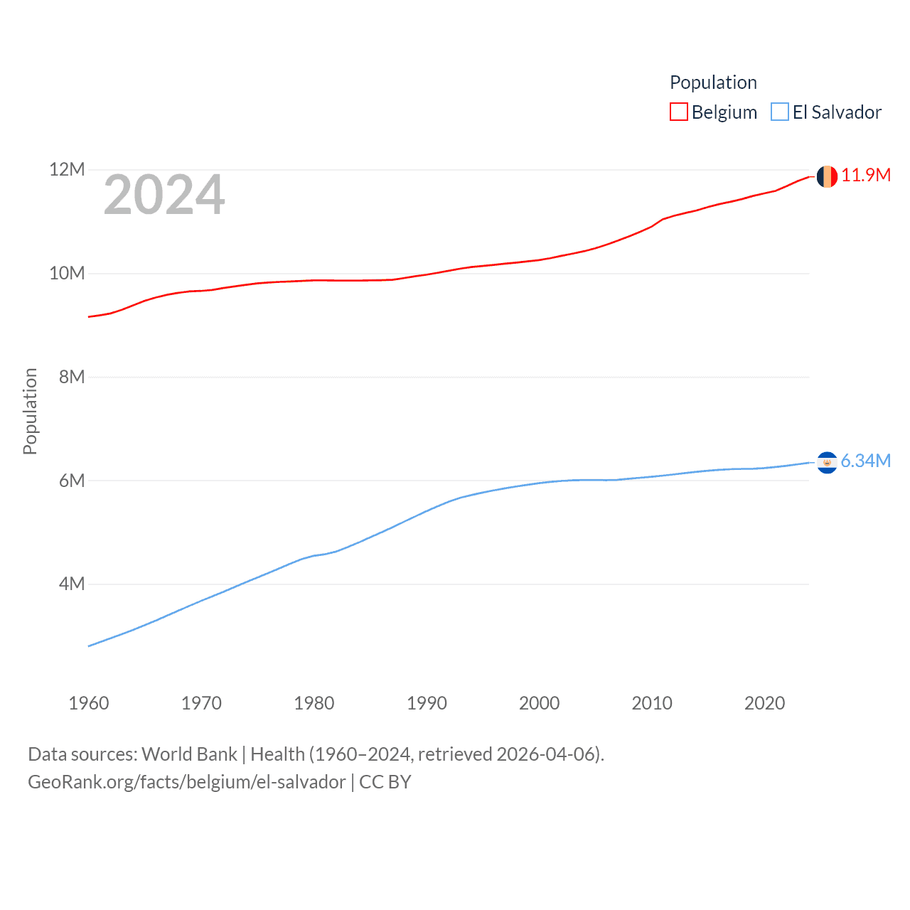 Belgium has a population of 11.9M (ranked 82/197), compared with 6.34M in El Salvador (ranked 111/197). Belgium's land area is 11,774 sq mi versus 8,000 sq mi for El Salvador (ranked 136th vs. 150th).
