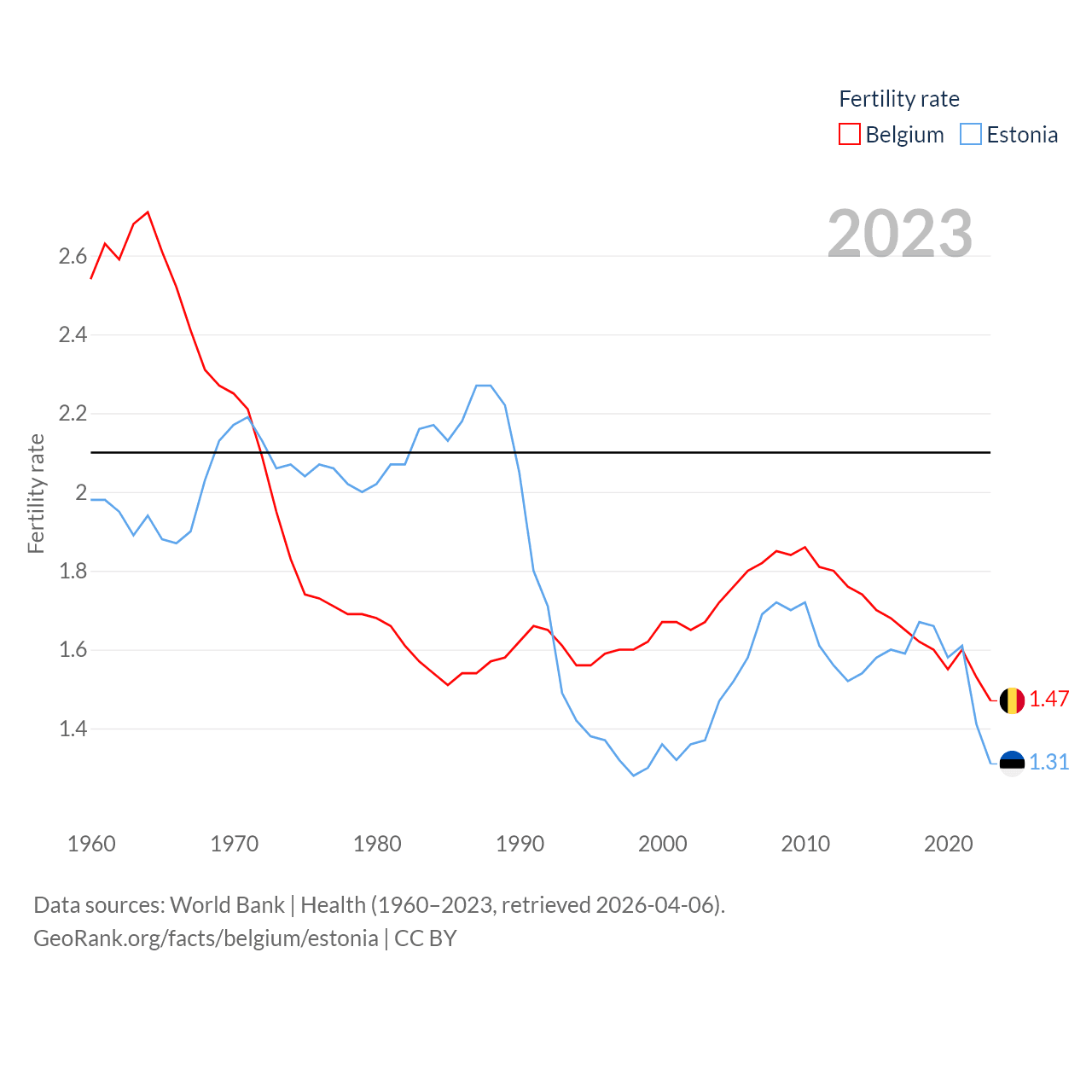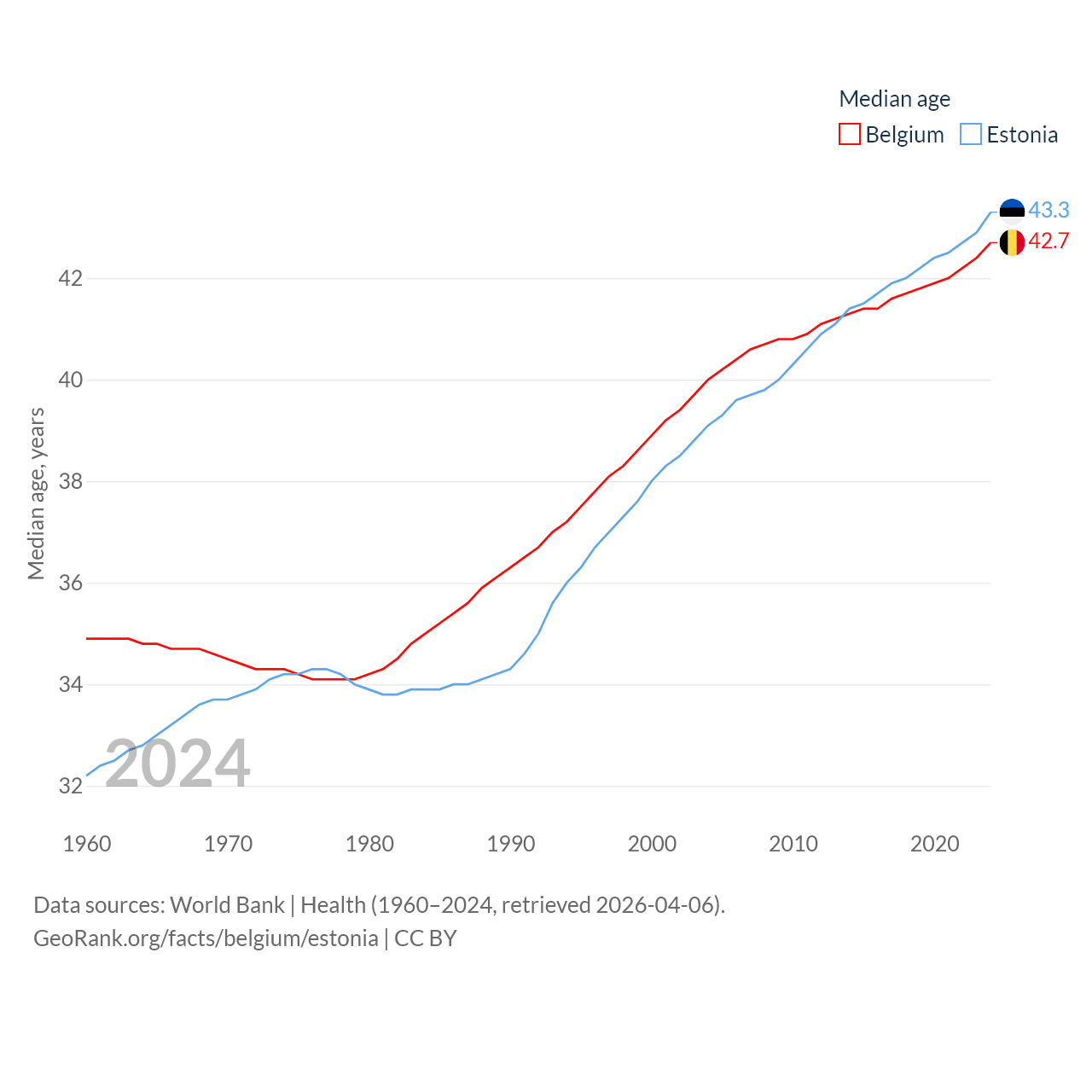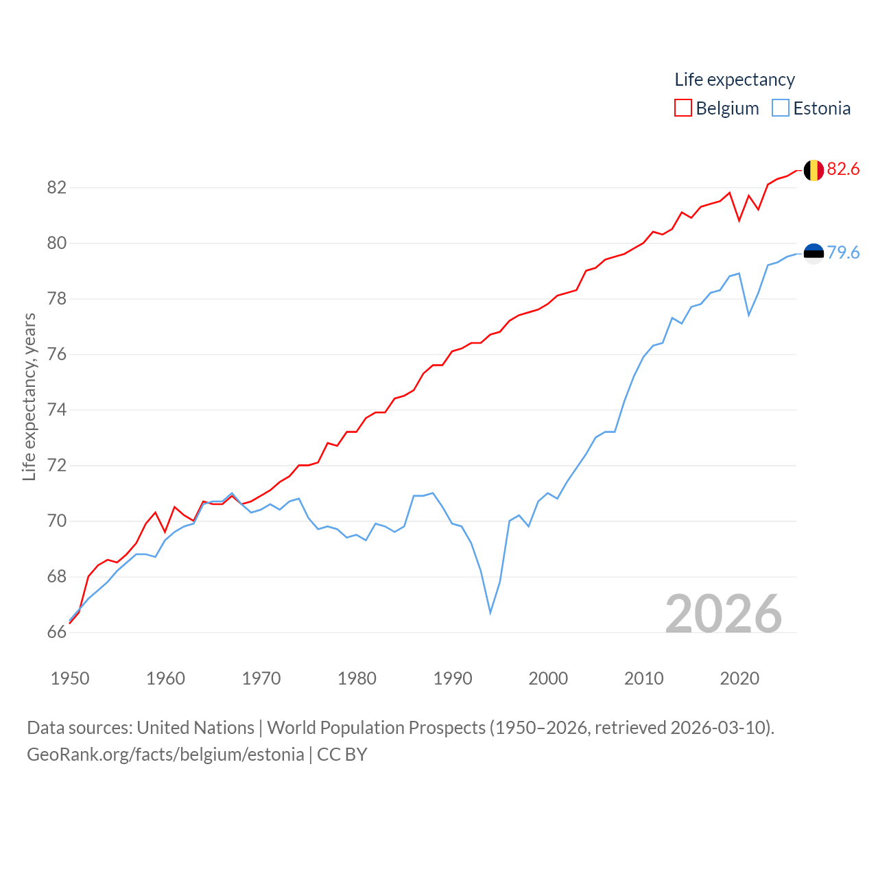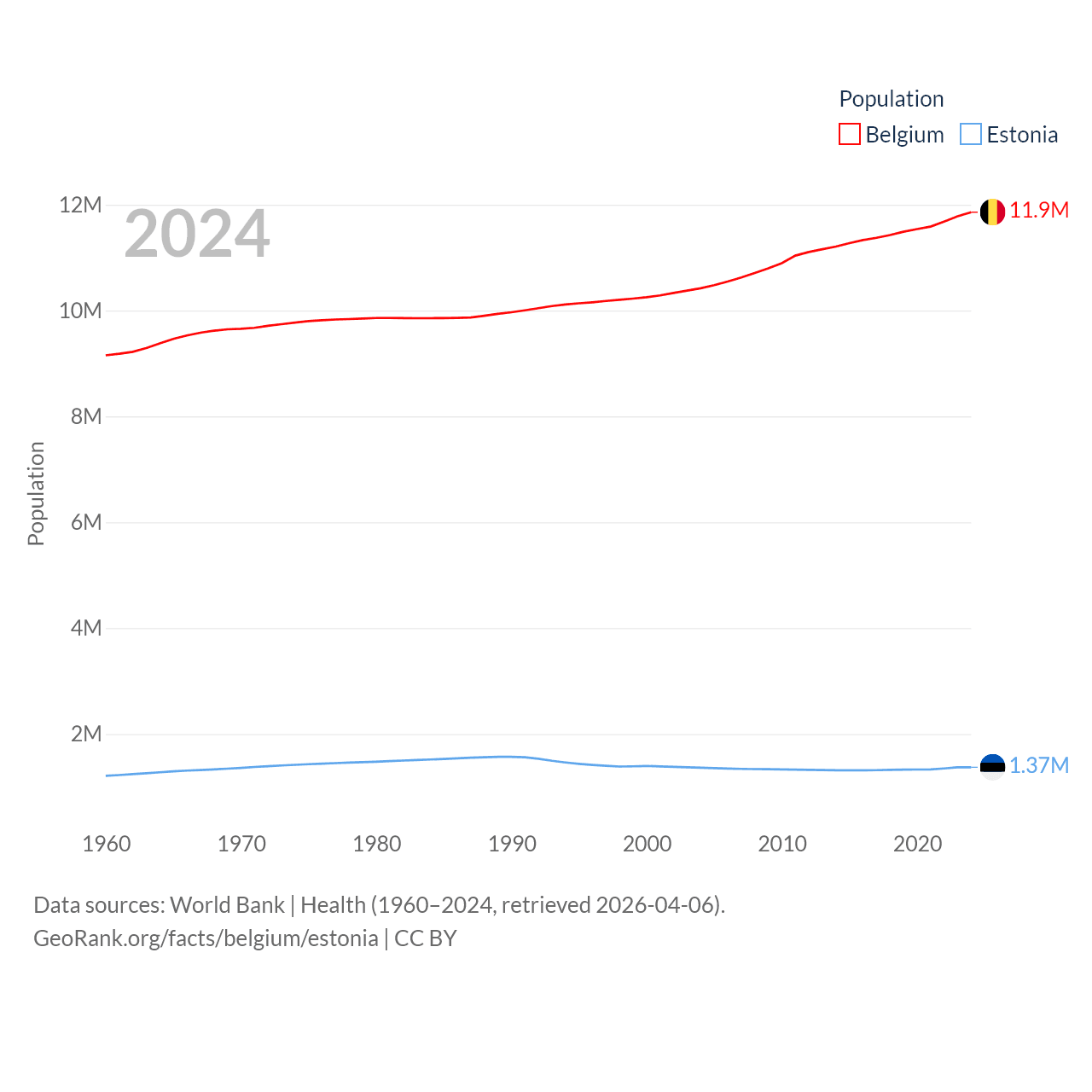 Belgium has a population of 11.9M (ranked 82/197), compared with 1.37M in Estonia (ranked 153/197). Belgium's land area is 11,774 sq mi versus 16,498 sq mi for Estonia (ranked 136th vs. 129th).