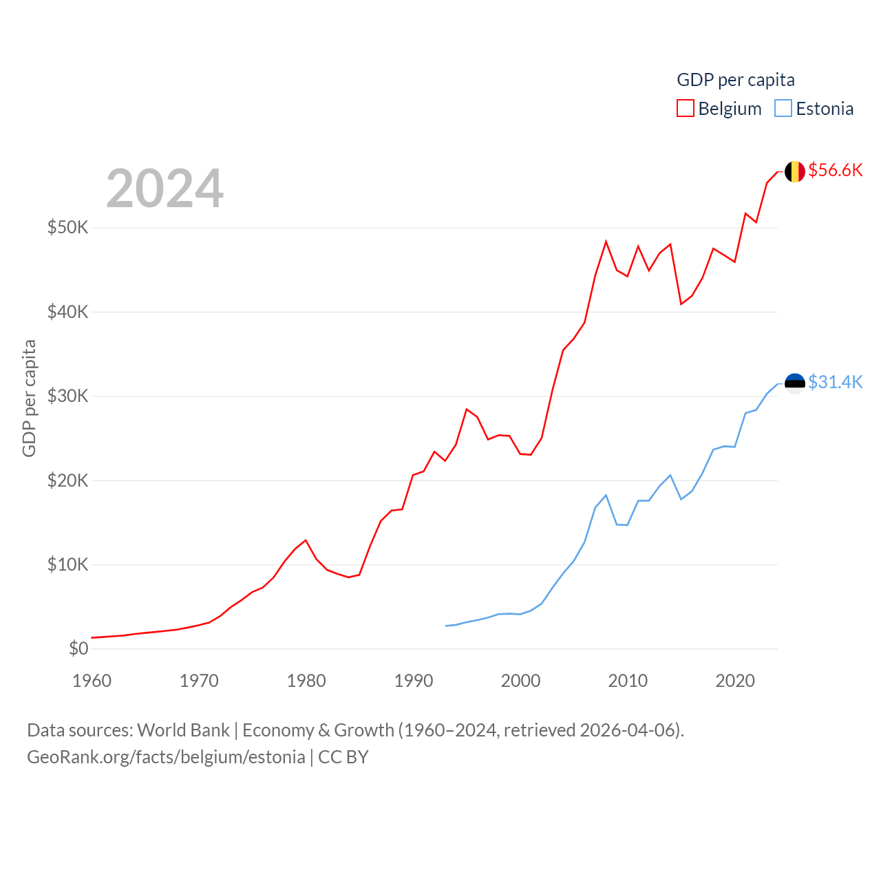 By GDP, Belgium ranks 23/197 ($671B) and Estonia ranks 100/197 ($43.1B). By GDP per capita, Belgium ranks 18/197 ($56,615), while Estonia ranks 40/197 ($31,428).