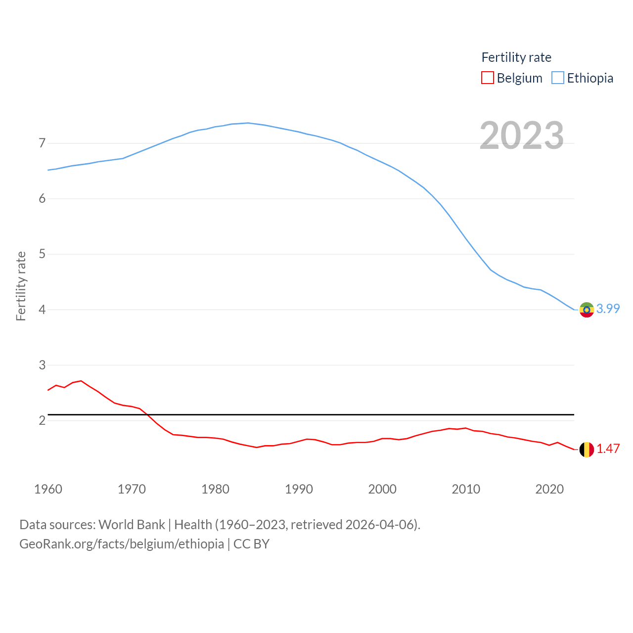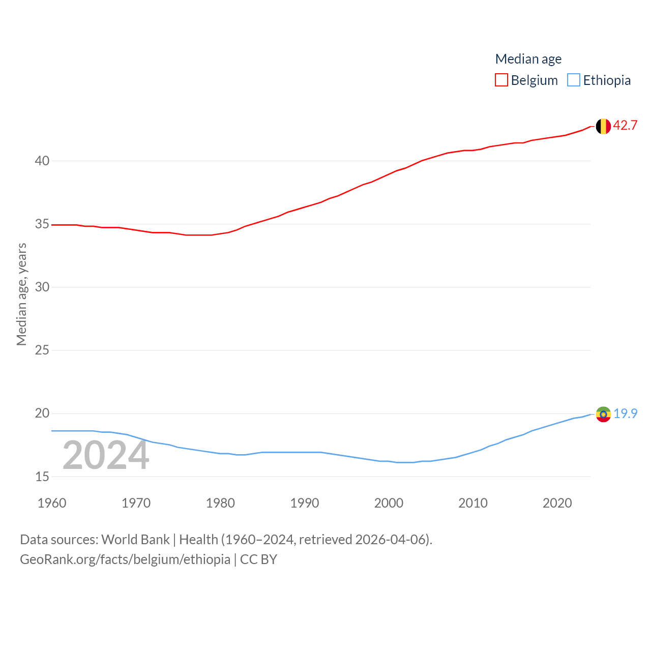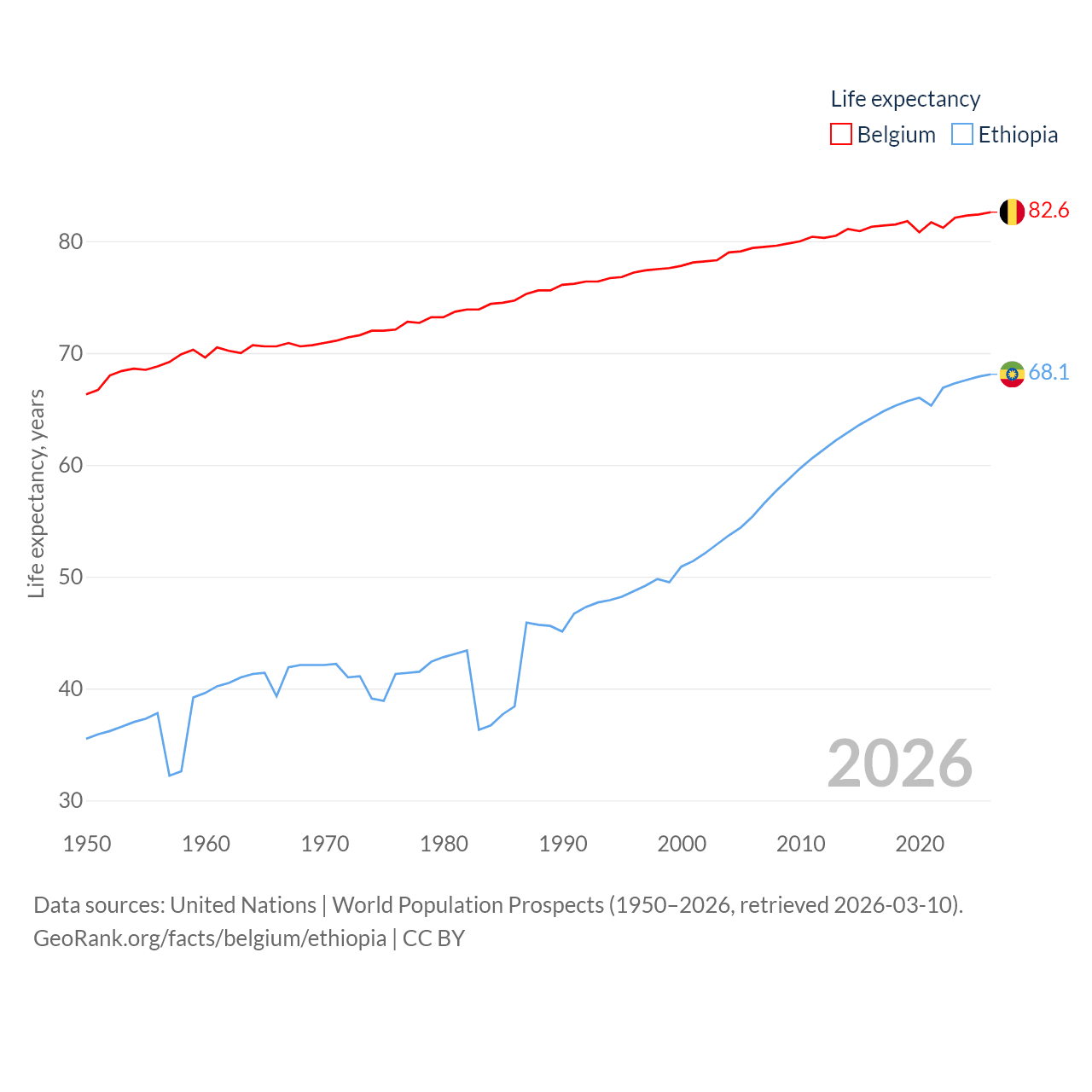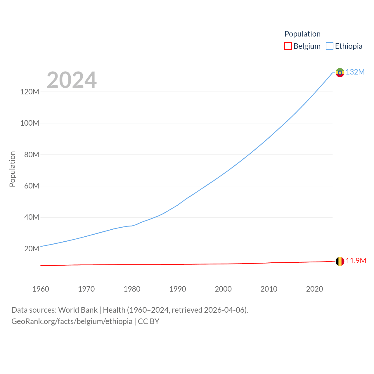 Belgium has a population of 11.9M (ranked 82/197), compared with 132M in Ethiopia (ranked 10/197). Belgium's land area is 11,774 sq mi versus 435,716 sq mi for Ethiopia (ranked 136th vs. 25th).