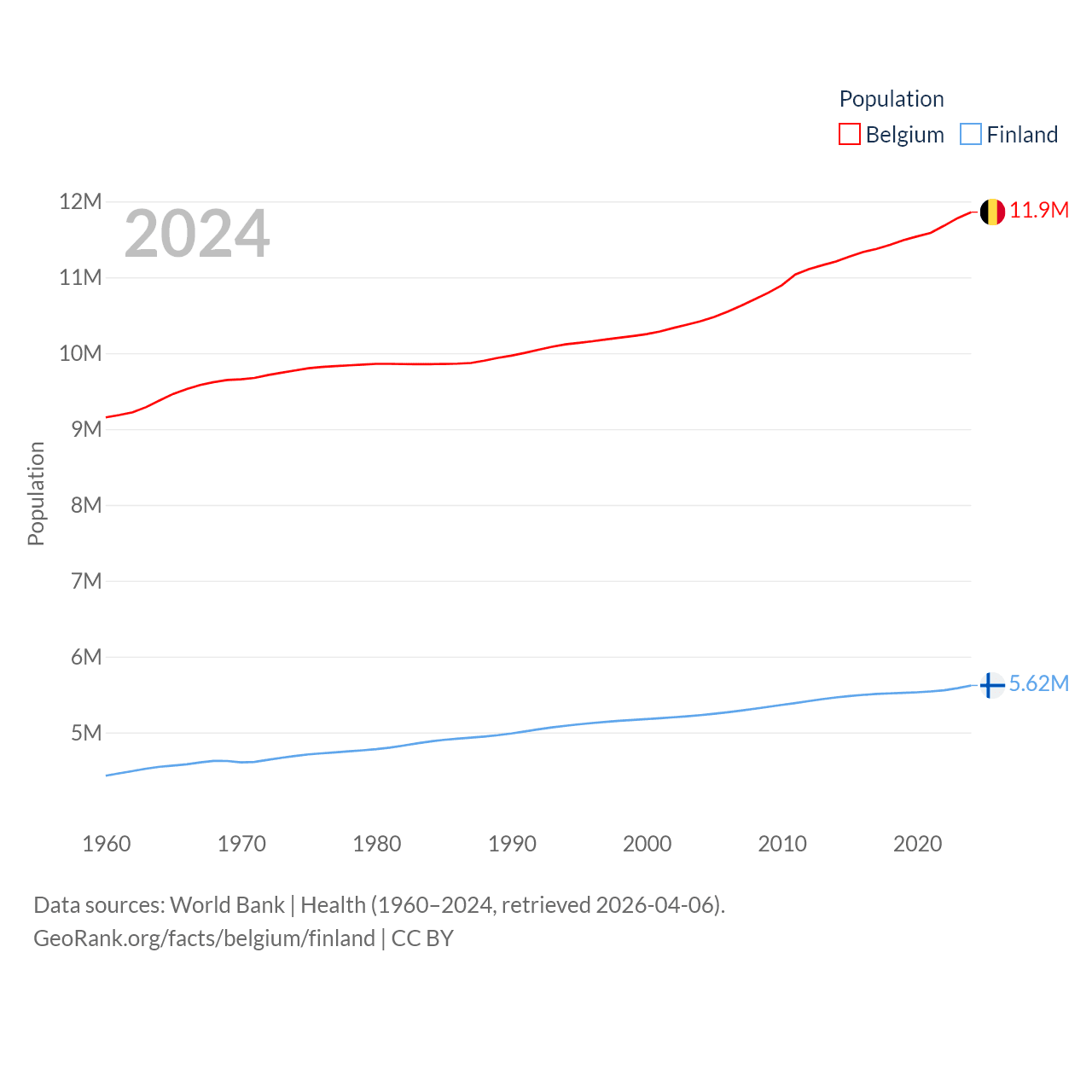 Belgium has a population of 11.9M (ranked 82/197), compared with 5.62M in Finland (ranked 116/197). Belgium's land area is 11,774 sq mi versus 117,360 sq mi for Finland (ranked 136th vs. 70th).
