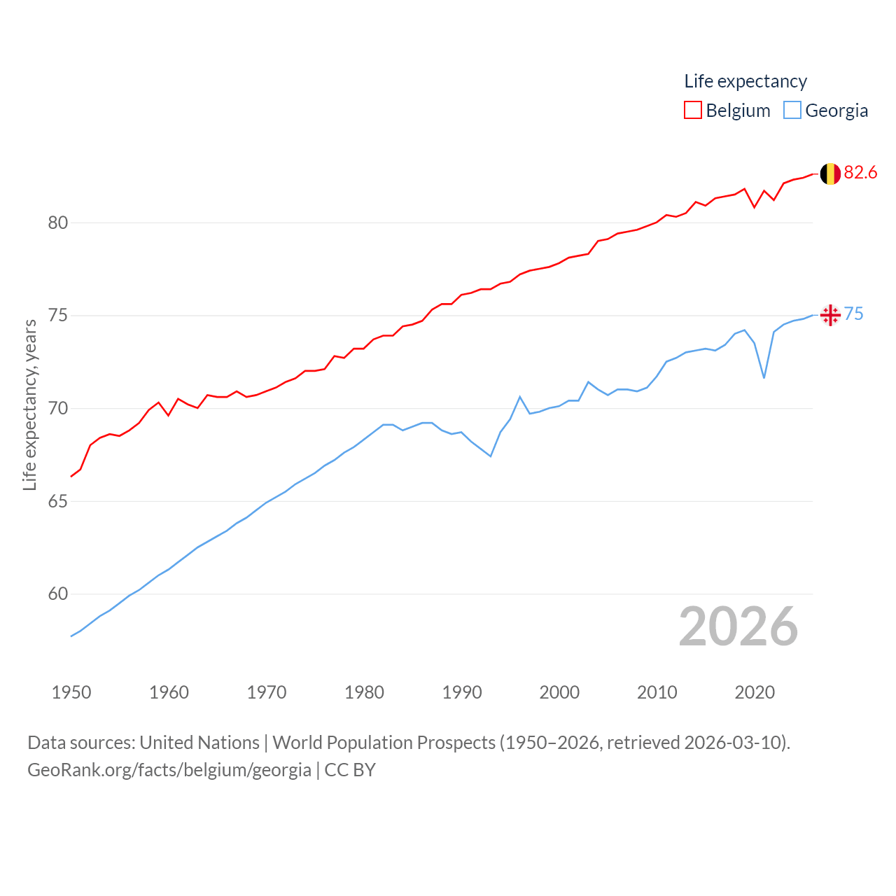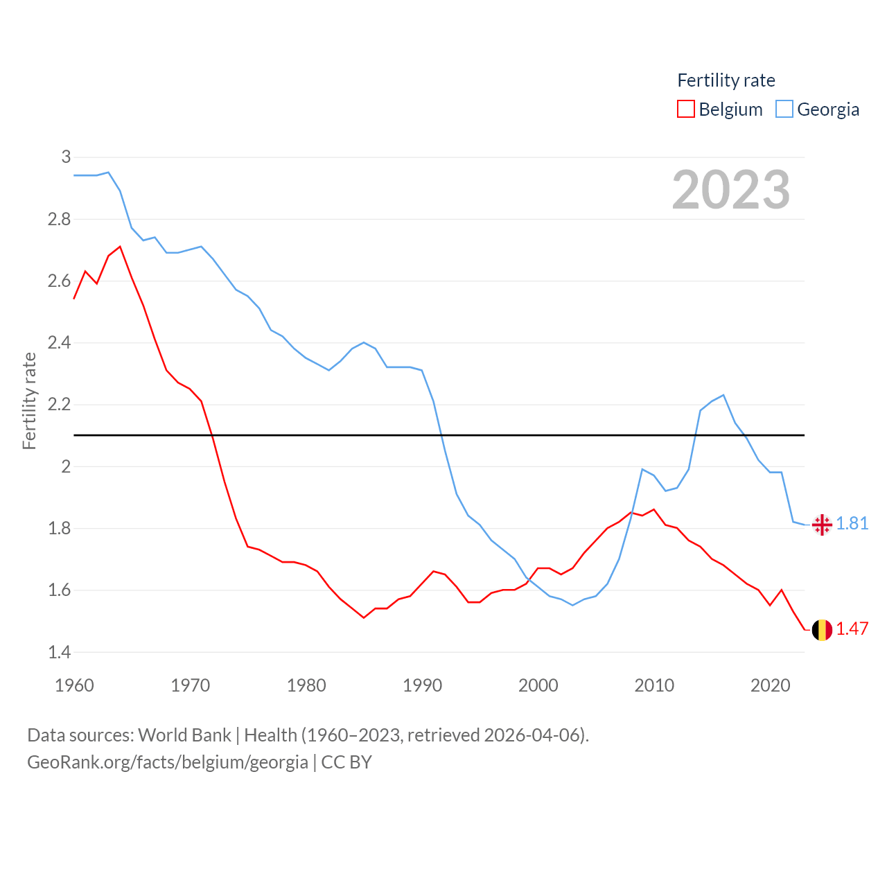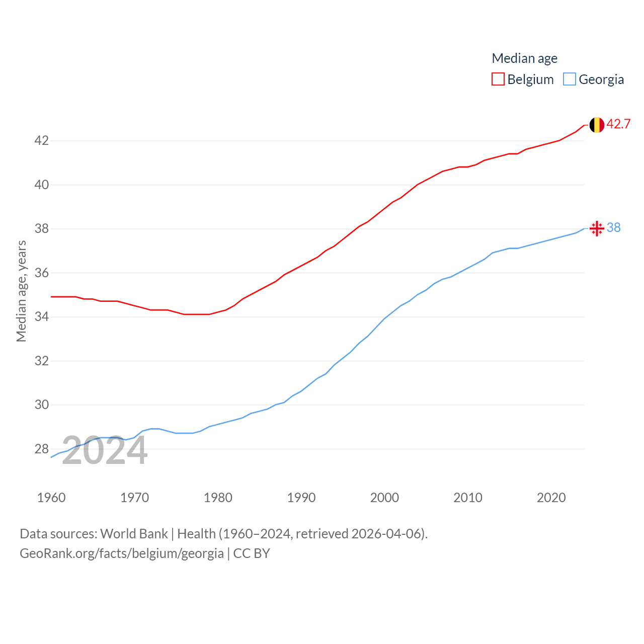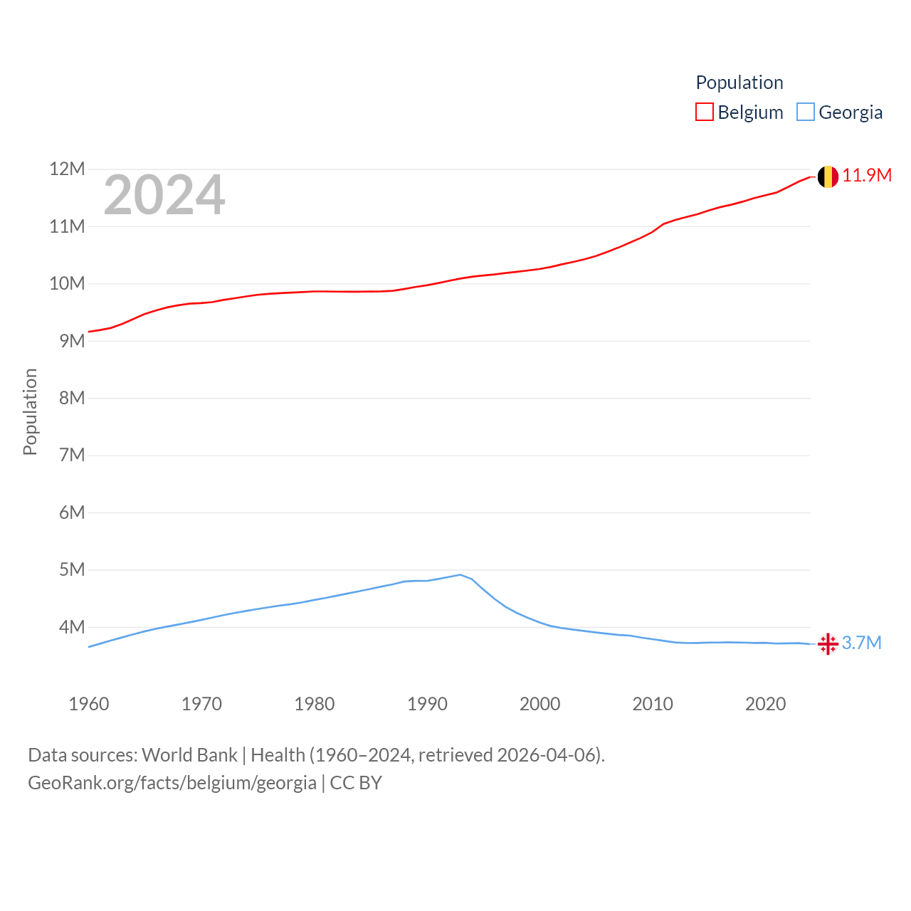 Belgium has a population of 11.9M (ranked 82/197), compared with 3.7M in Georgia (ranked 130/197). Belgium's land area is 11,774 sq mi versus 26,830 sq mi for Georgia (ranked 136th vs. 118th).