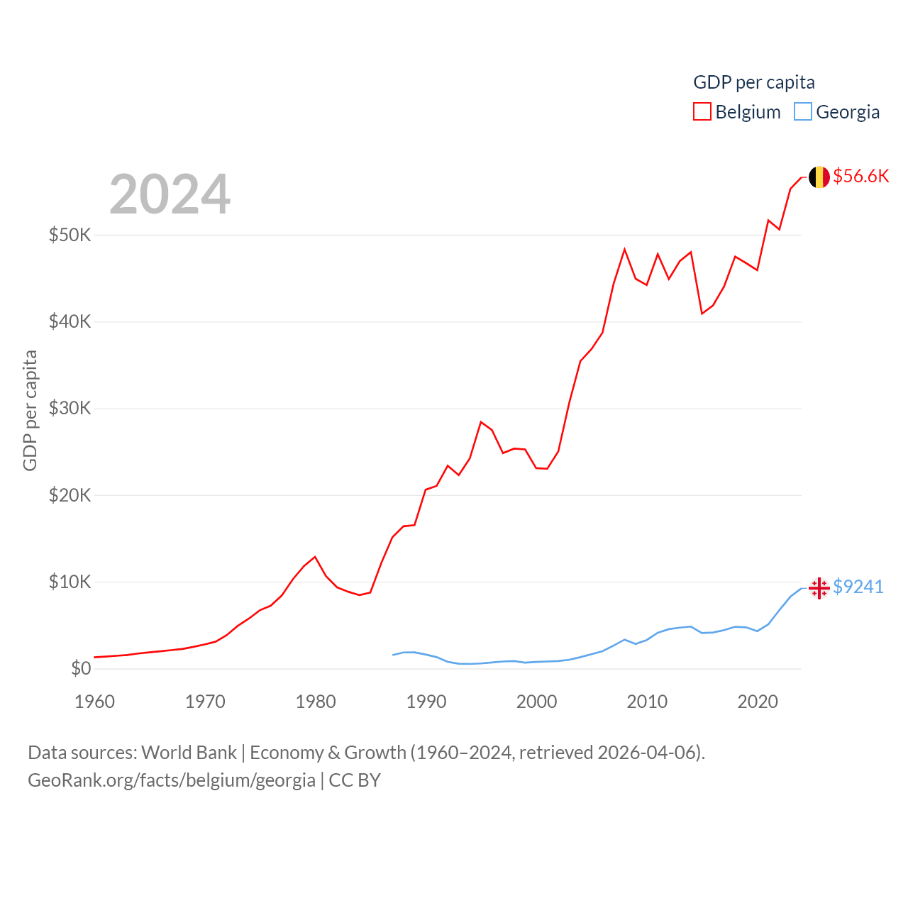 By GDP, Belgium ranks 23/197 ($671B) and Georgia ranks 107/197 ($34.2B). By GDP per capita, Belgium ranks 18/197 ($56,615), while Georgia ranks 89/197 ($9,241).