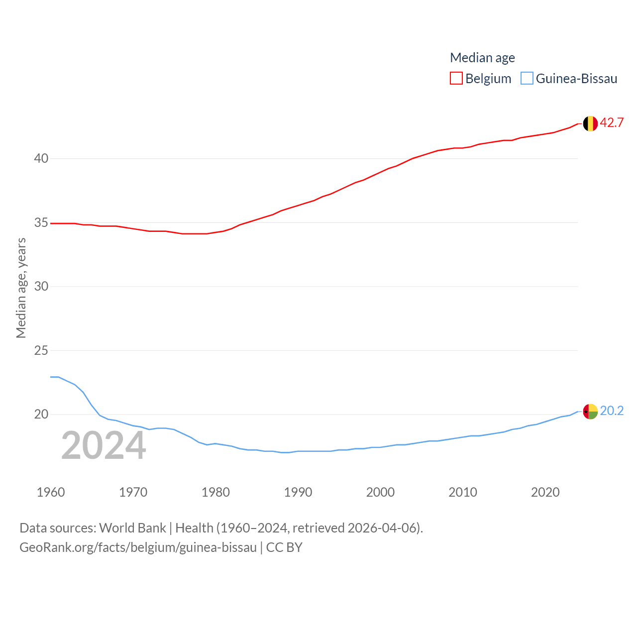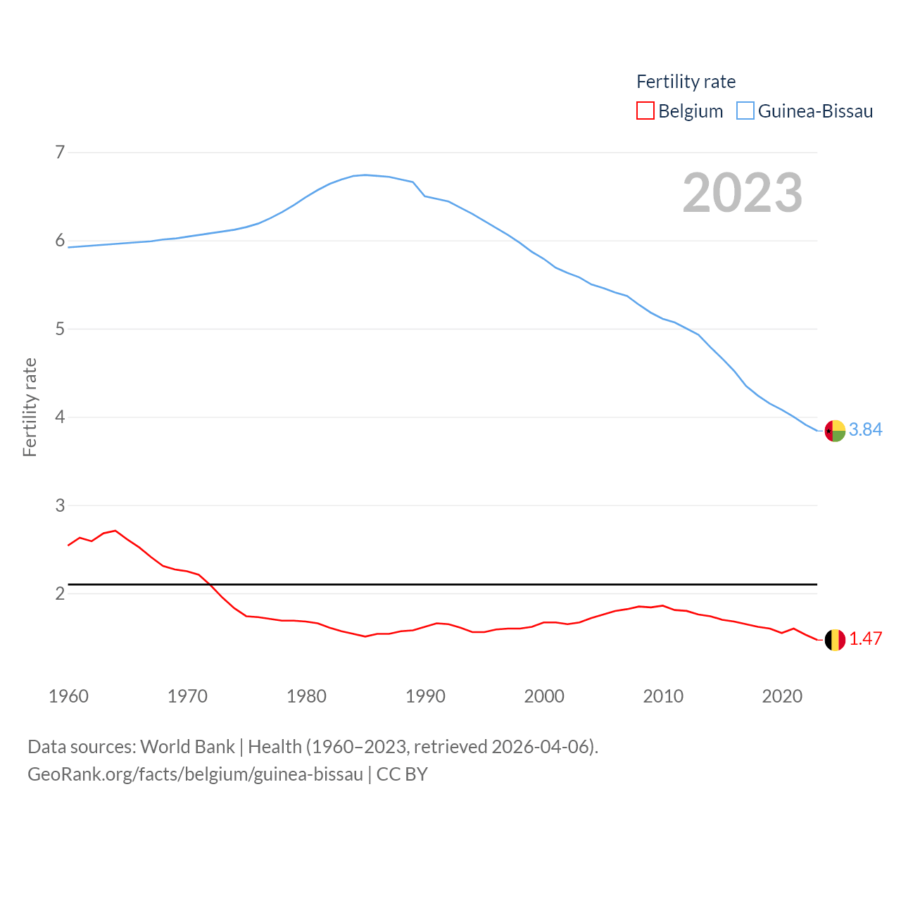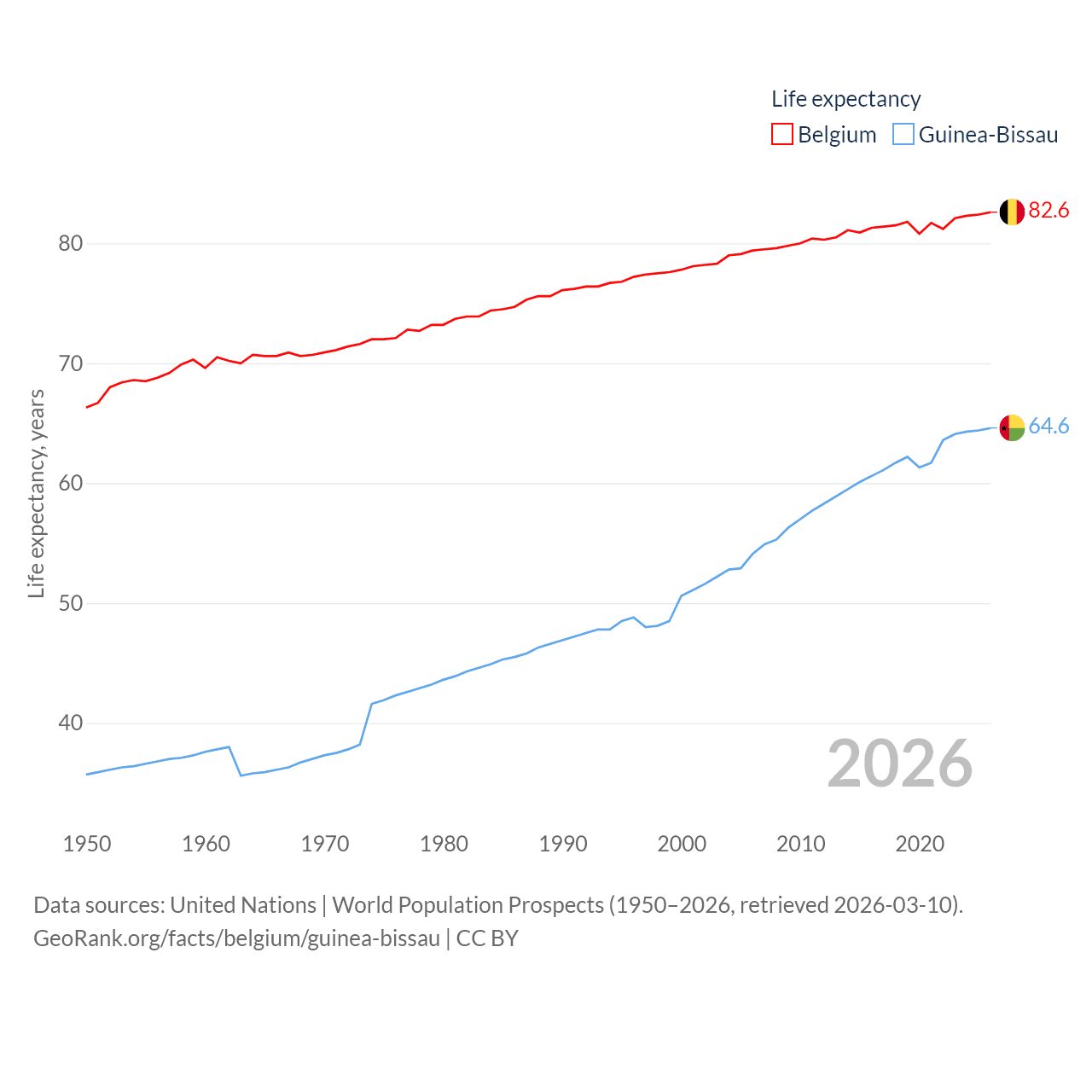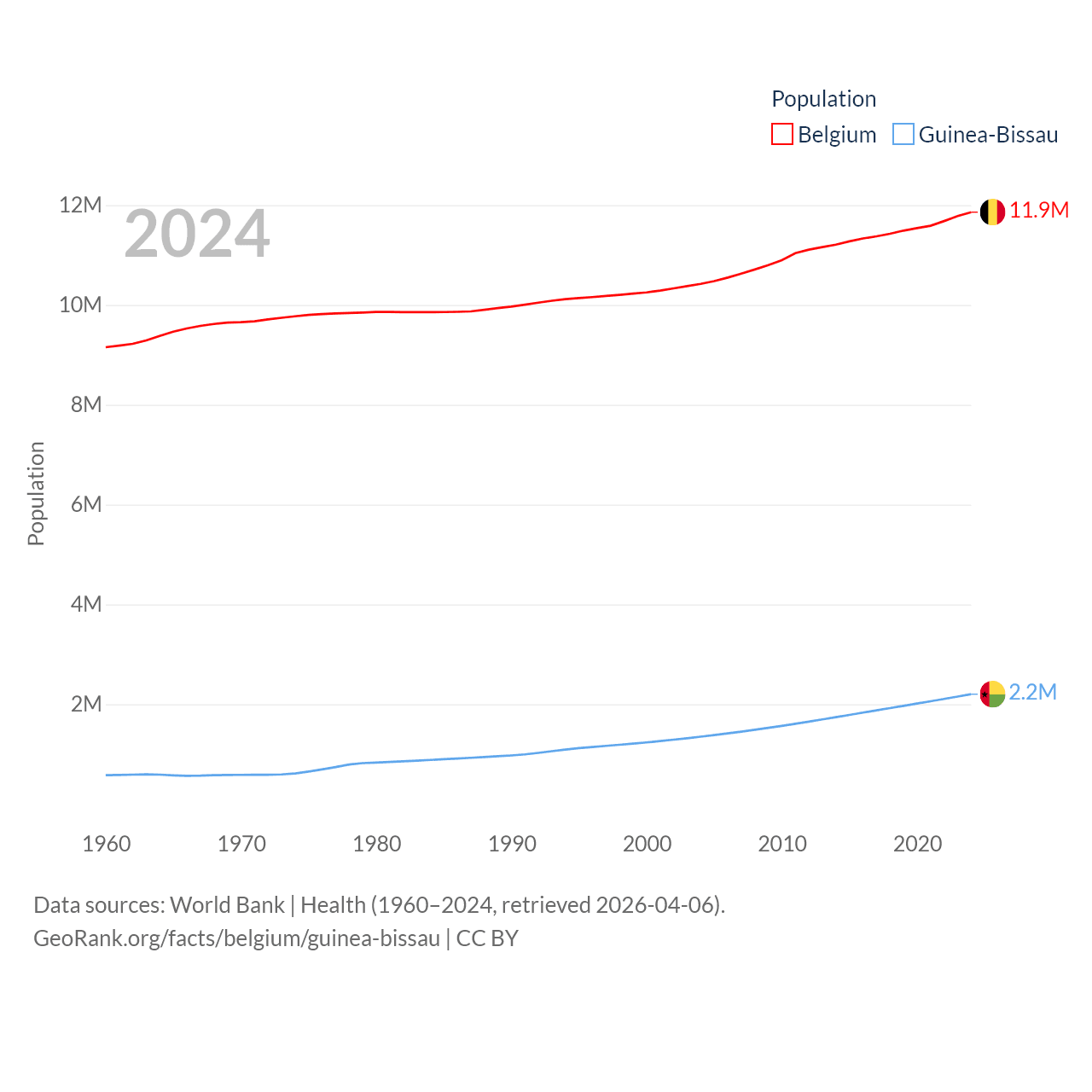 Belgium has a population of 11.9M (ranked 82/197), compared with 2.2M in Guinea-Bissau (ranked 146/197). Belgium's land area is 11,774 sq mi versus 10,857 sq mi for Guinea-Bissau (ranked 136th vs. 139th).