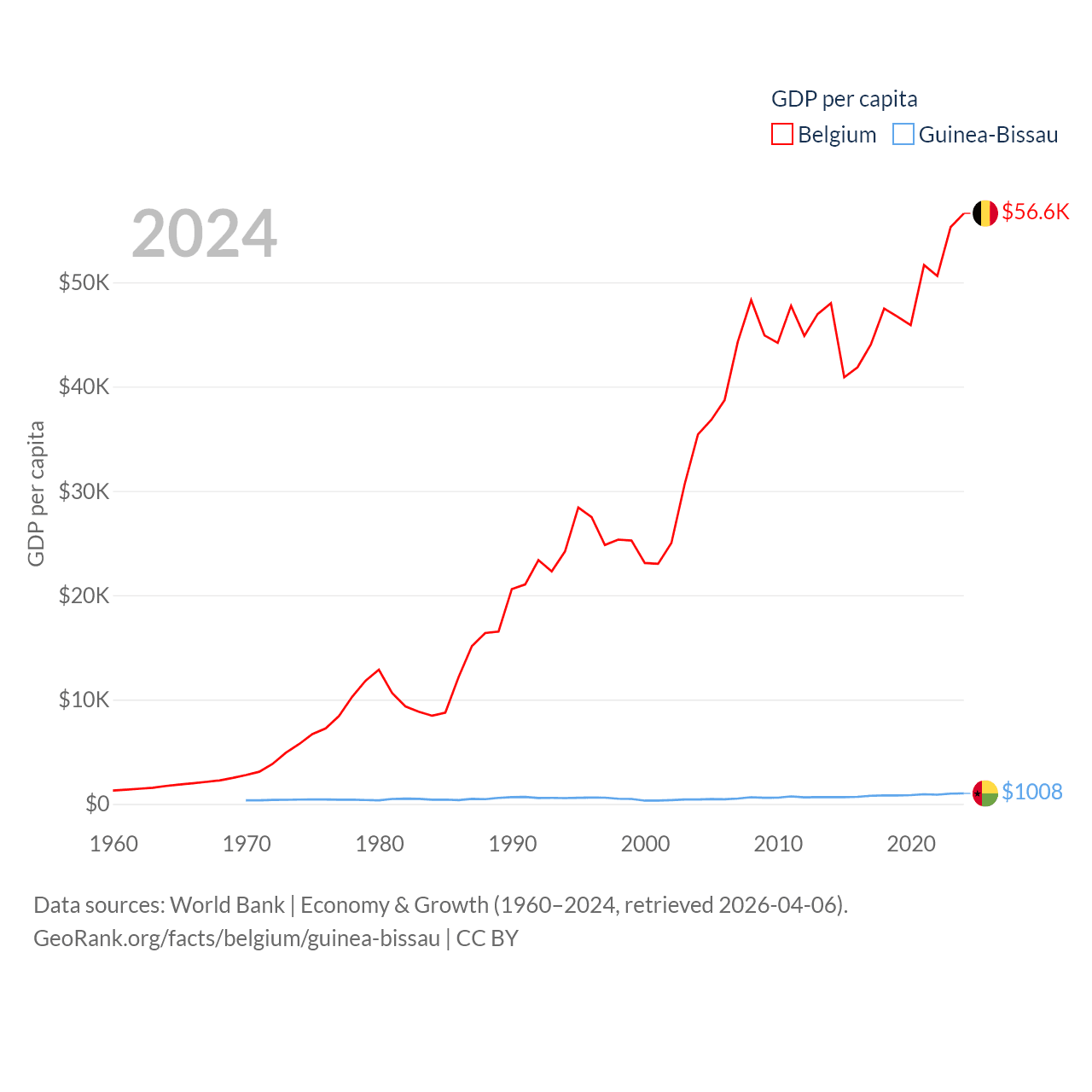 By GDP, Belgium ranks 23/197 ($671B) and Guinea-Bissau ranks 176/197 ($2.22B). By GDP per capita, Belgium ranks 18/197 ($56,615), while Guinea-Bissau ranks 177/197 ($1,008).