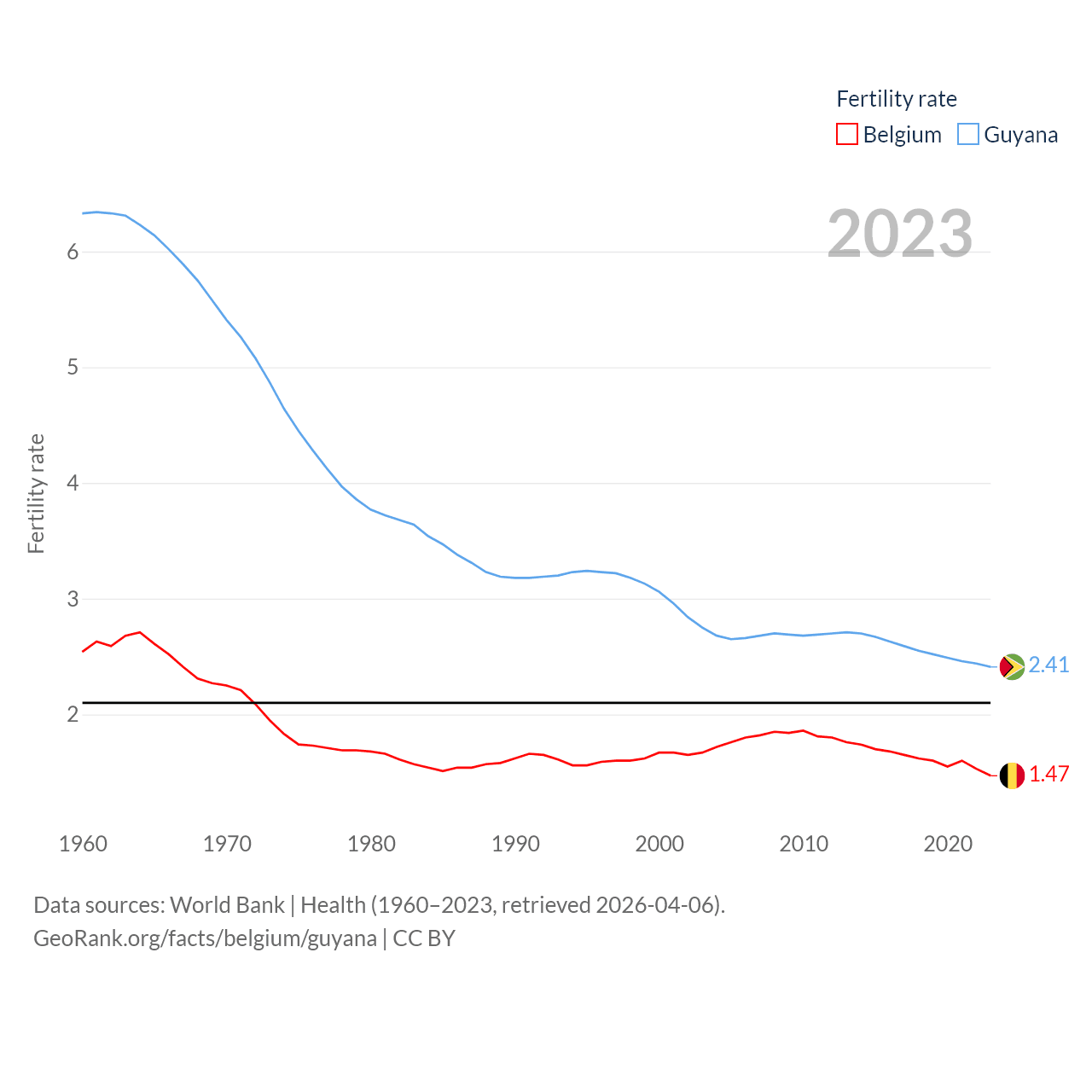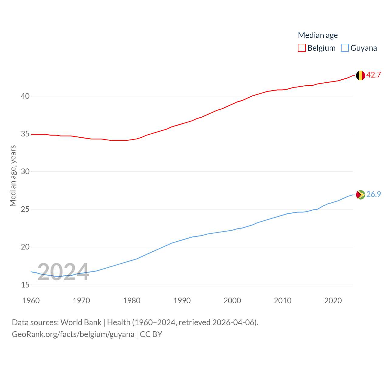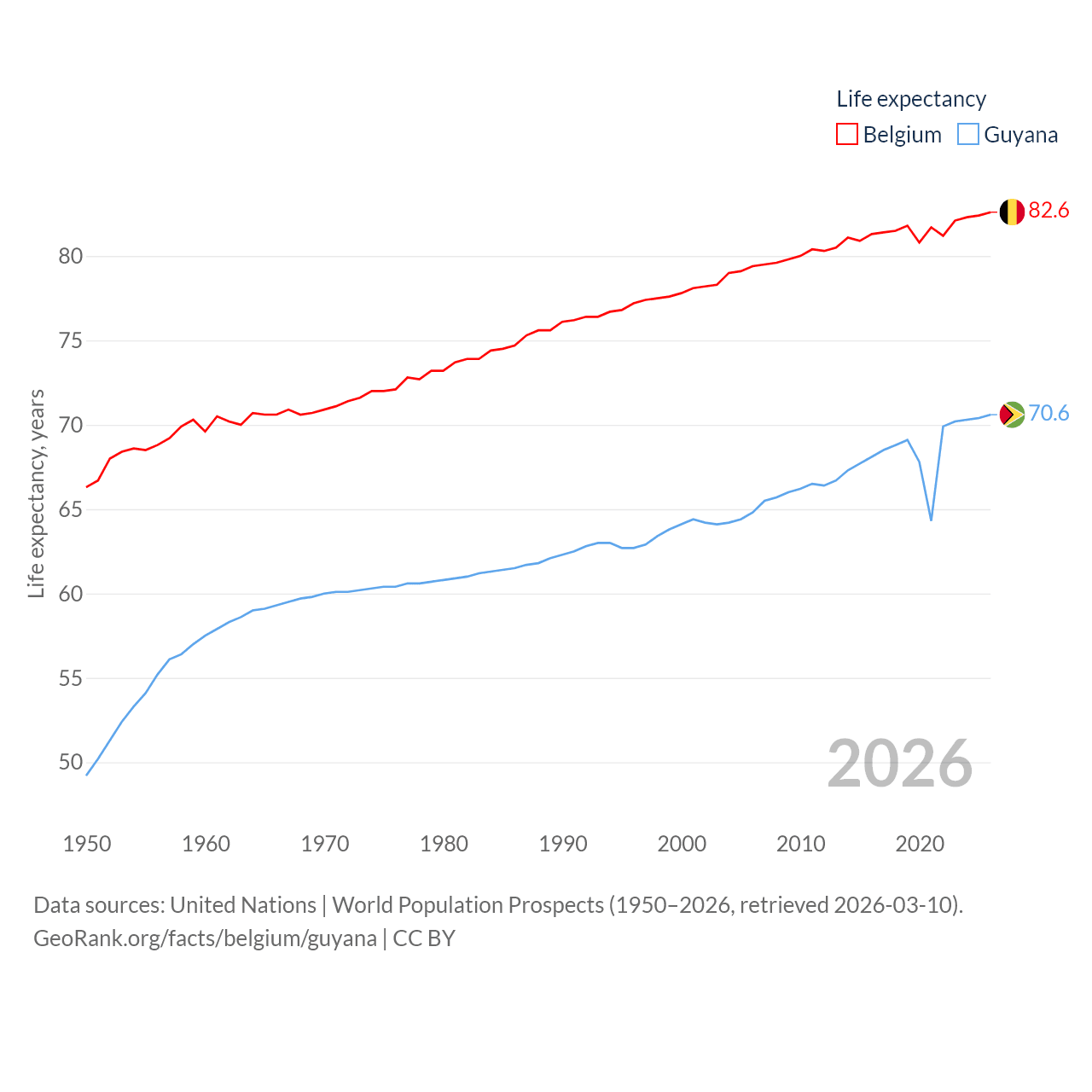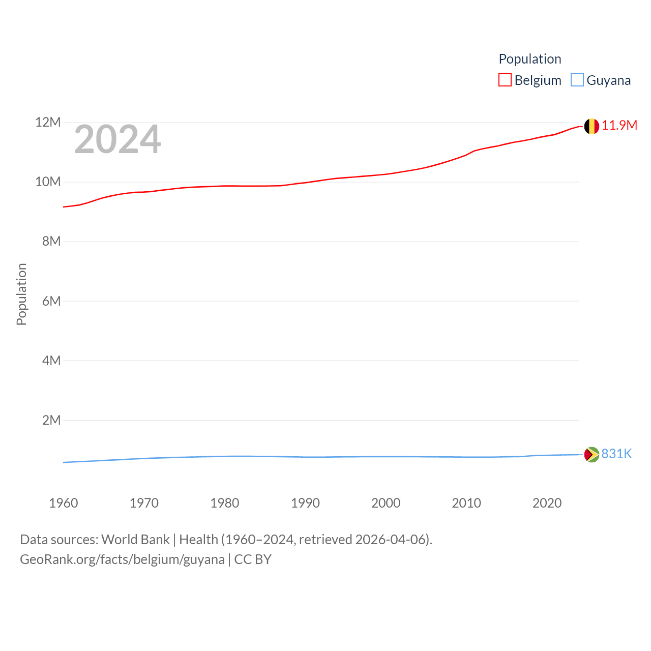 Belgium has a population of 11.9M (ranked 82/197), compared with 831K in Guyana (ranked 161/197). Belgium's land area is 11,774 sq mi versus 81,522 sq mi for Guyana (ranked 136th vs. 82nd).