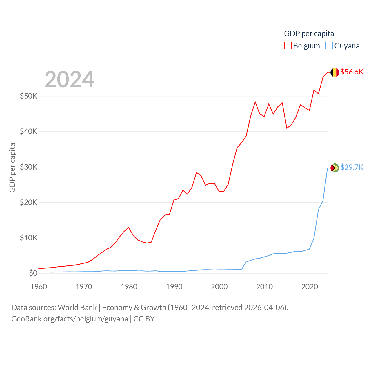 By GDP, Belgium ranks 23/197 ($671B) and Guyana ranks 120/197 ($24.7B). By GDP per capita, Belgium ranks 18/197 ($56,615), while Guyana ranks 41/197 ($29,675).
