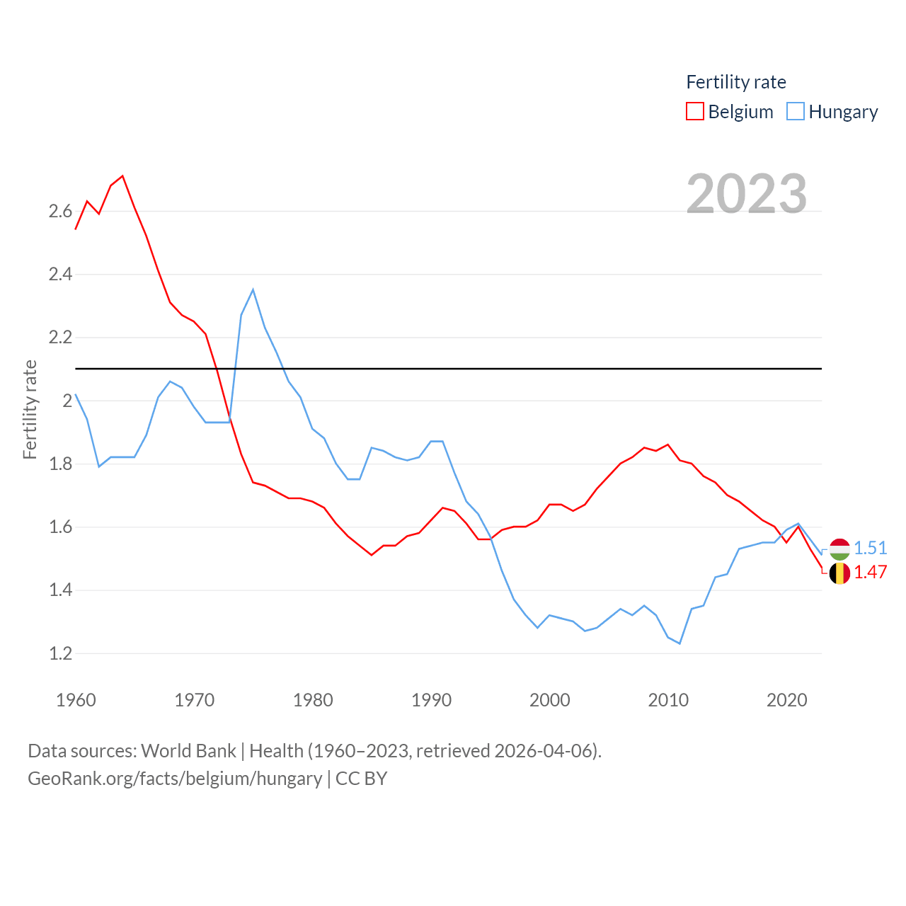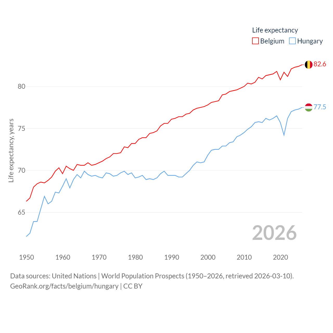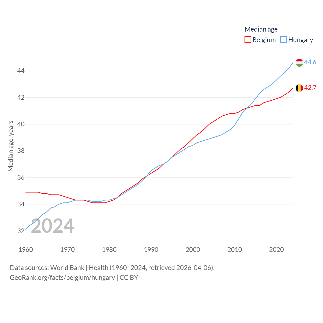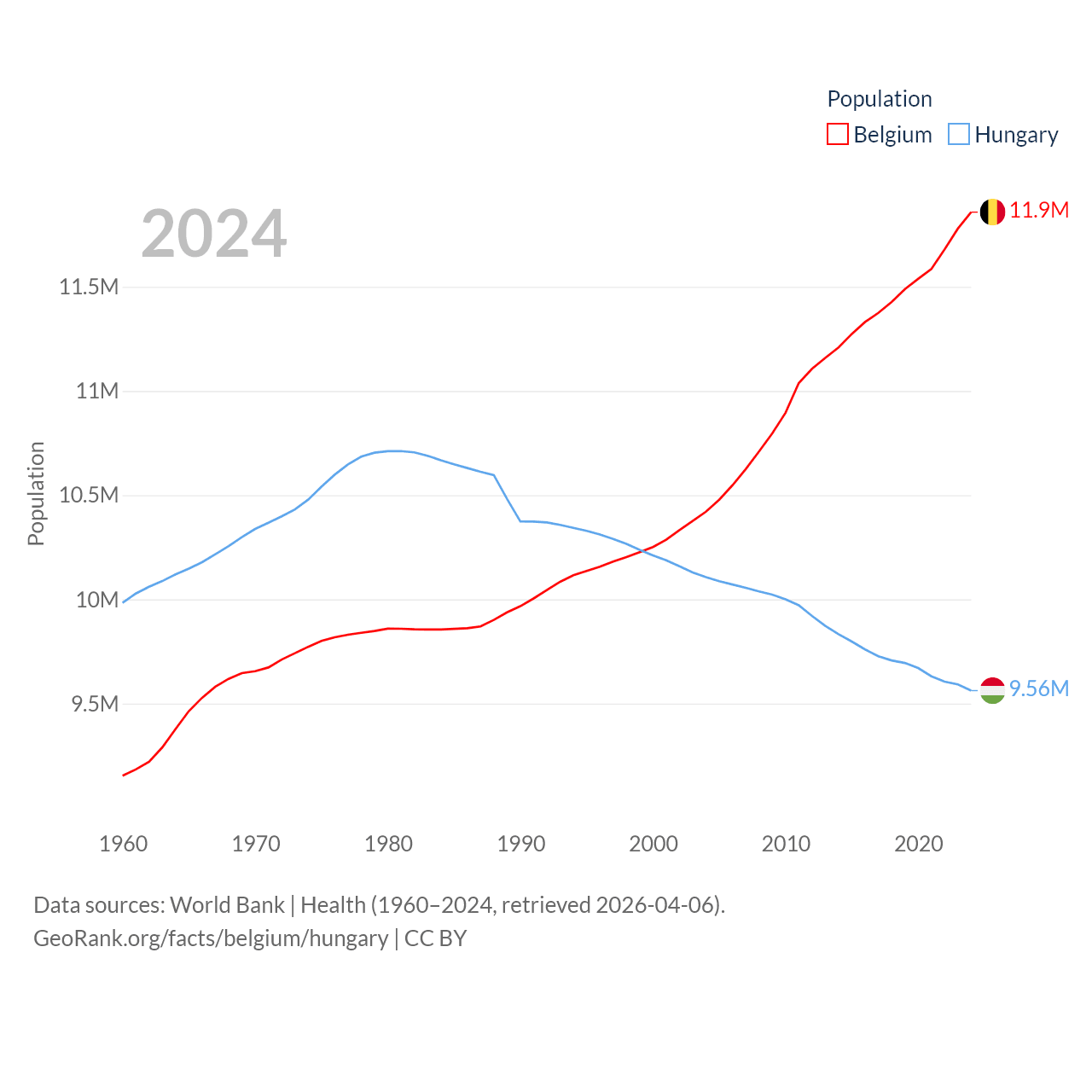 Belgium has a population of 11.9M (ranked 82/197), compared with 9.56M in Hungary (ranked 97/197). Belgium's land area is 11,774 sq mi versus 35,236 sq mi for Hungary (ranked 136th vs. 109th).