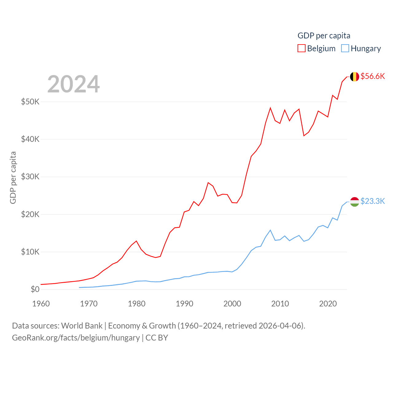 By GDP, Belgium ranks 23/197 ($671B) and Hungary ranks 55/197 ($223B). By GDP per capita, Belgium ranks 18/197 ($56,615), while Hungary ranks 55/197 ($23,292).