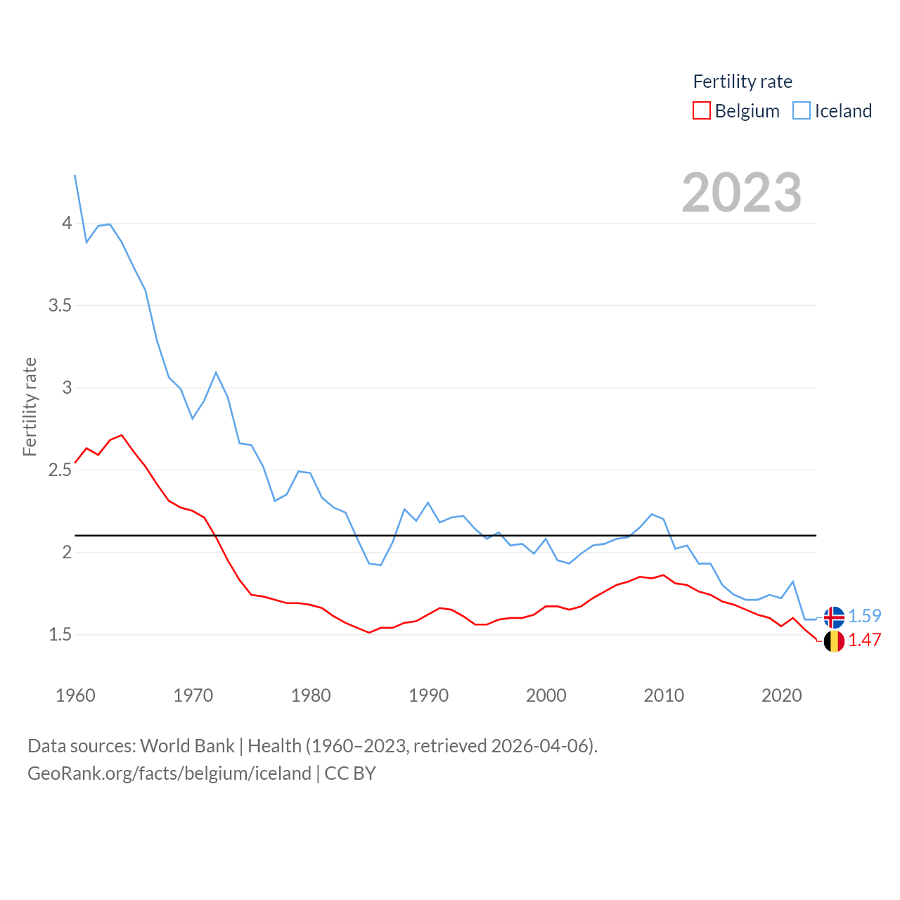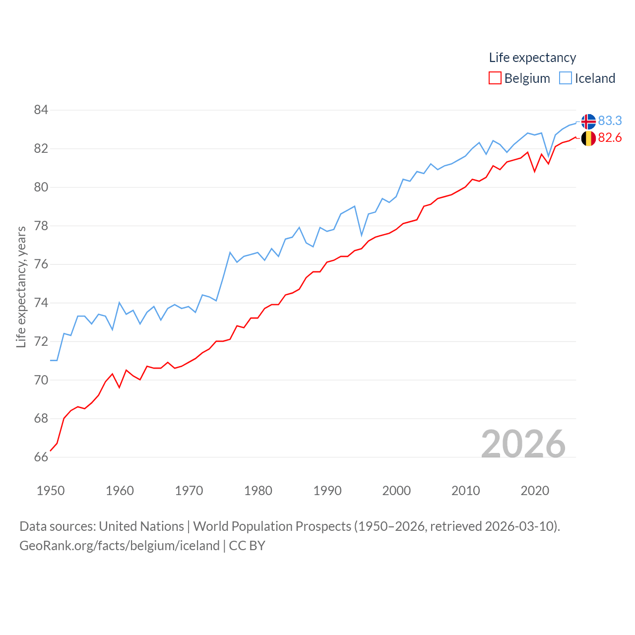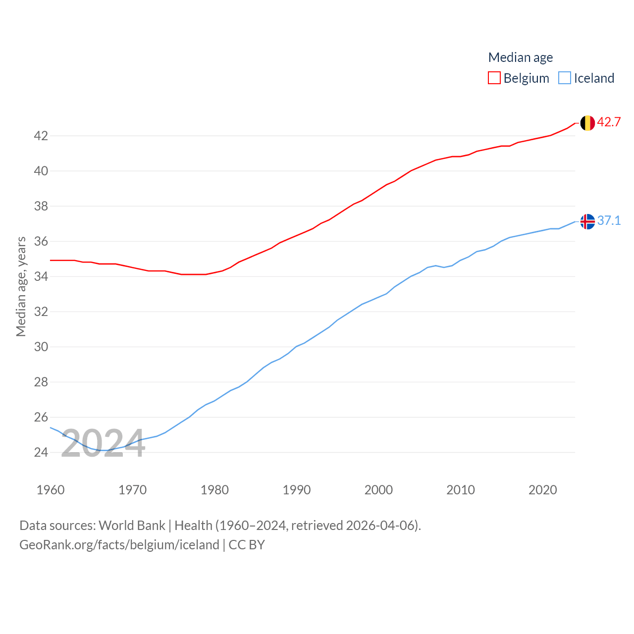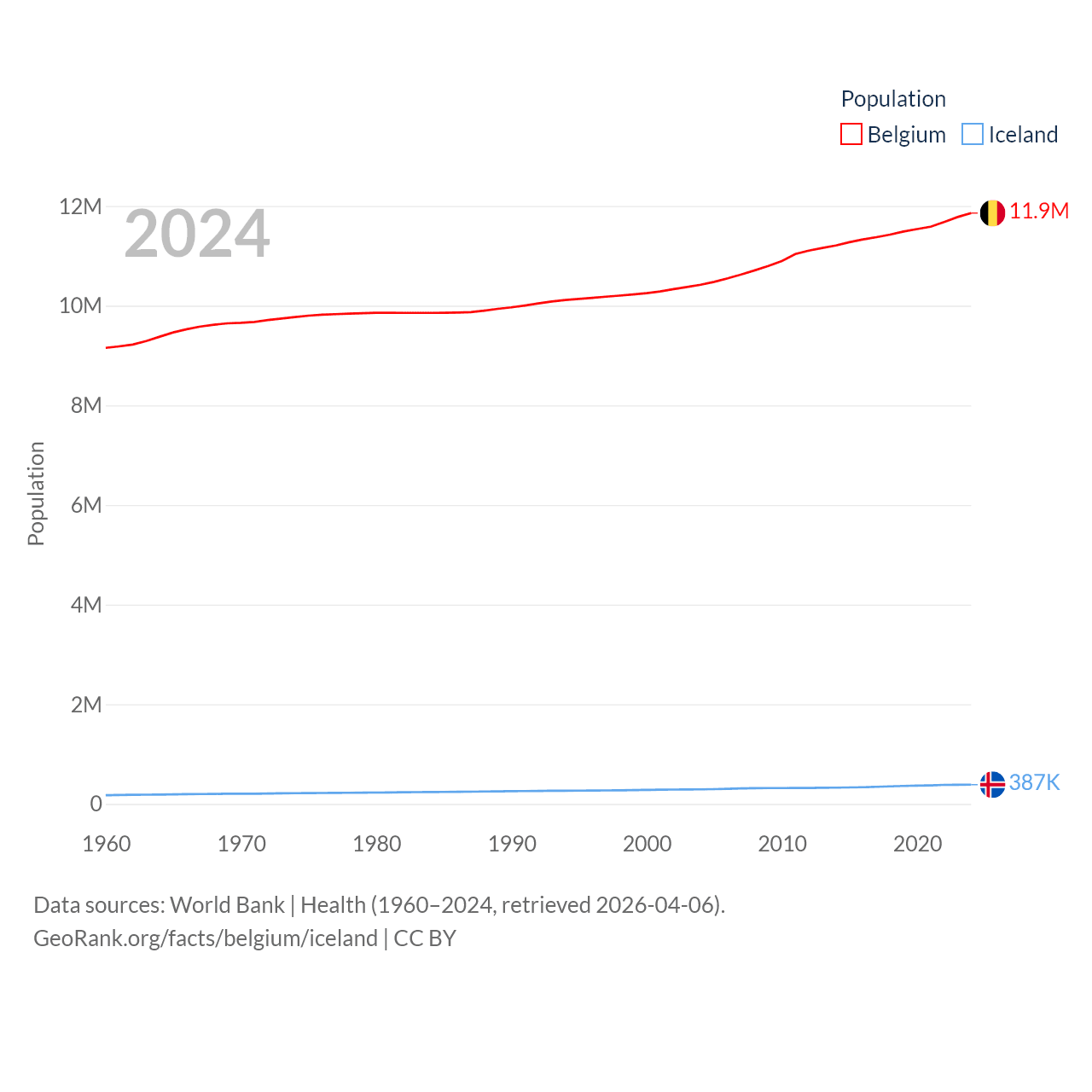 Belgium has a population of 11.9M (ranked 82/197), compared with 387K in Iceland (ranked 173/197). Belgium's land area is 11,774 sq mi versus 38,931 sq mi for Iceland (ranked 136th vs. 104th).