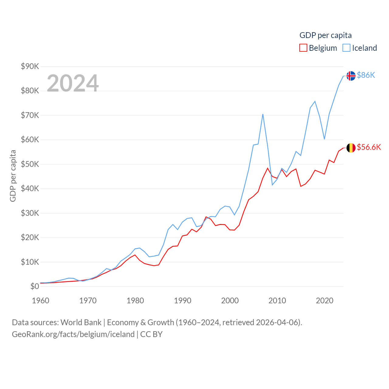 By GDP, Belgium ranks 23/197 ($671B) and Iceland ranks 108/197 ($33.3B). By GDP per capita, Belgium ranks 18/197 ($56,615), while Iceland ranks 9/197 ($86,041).