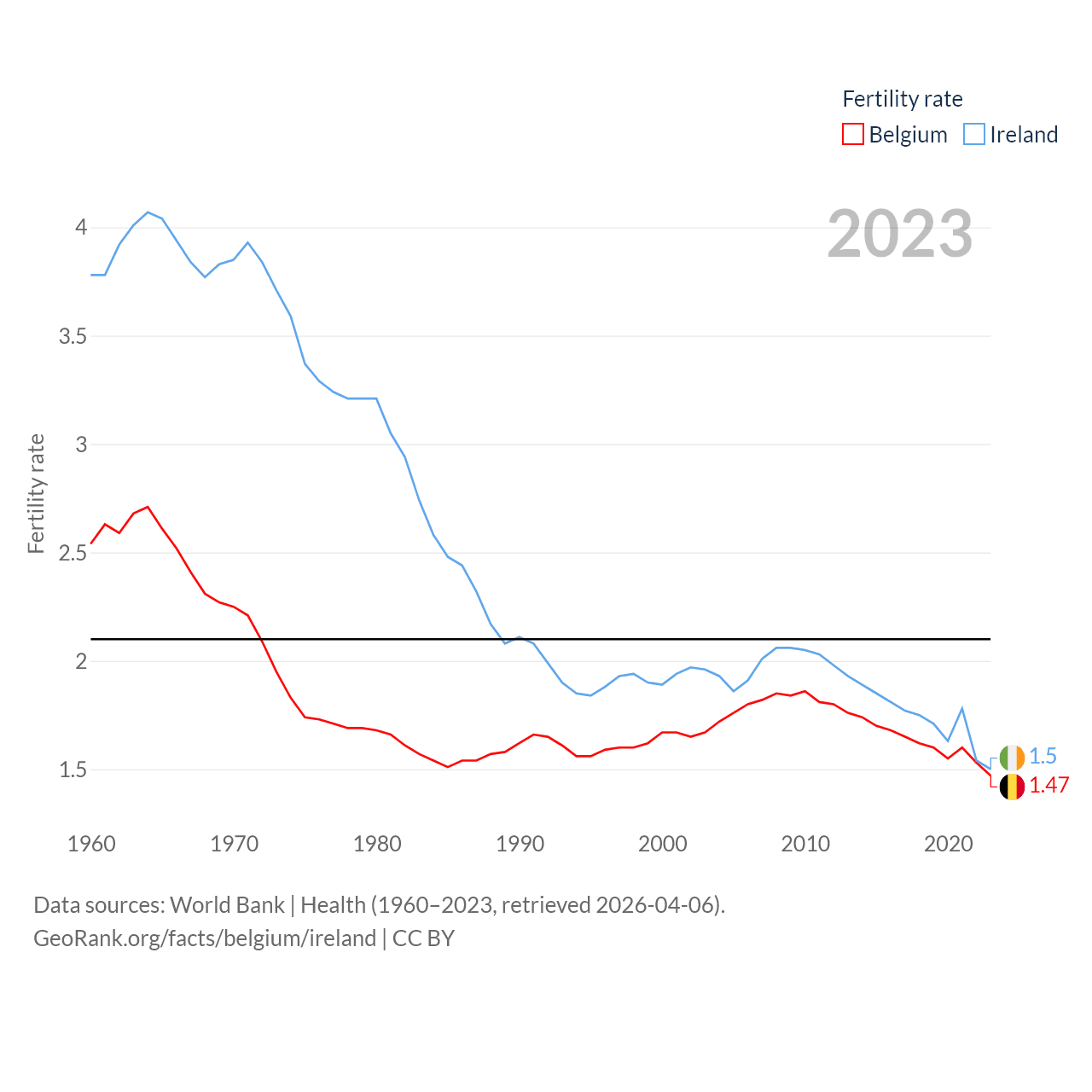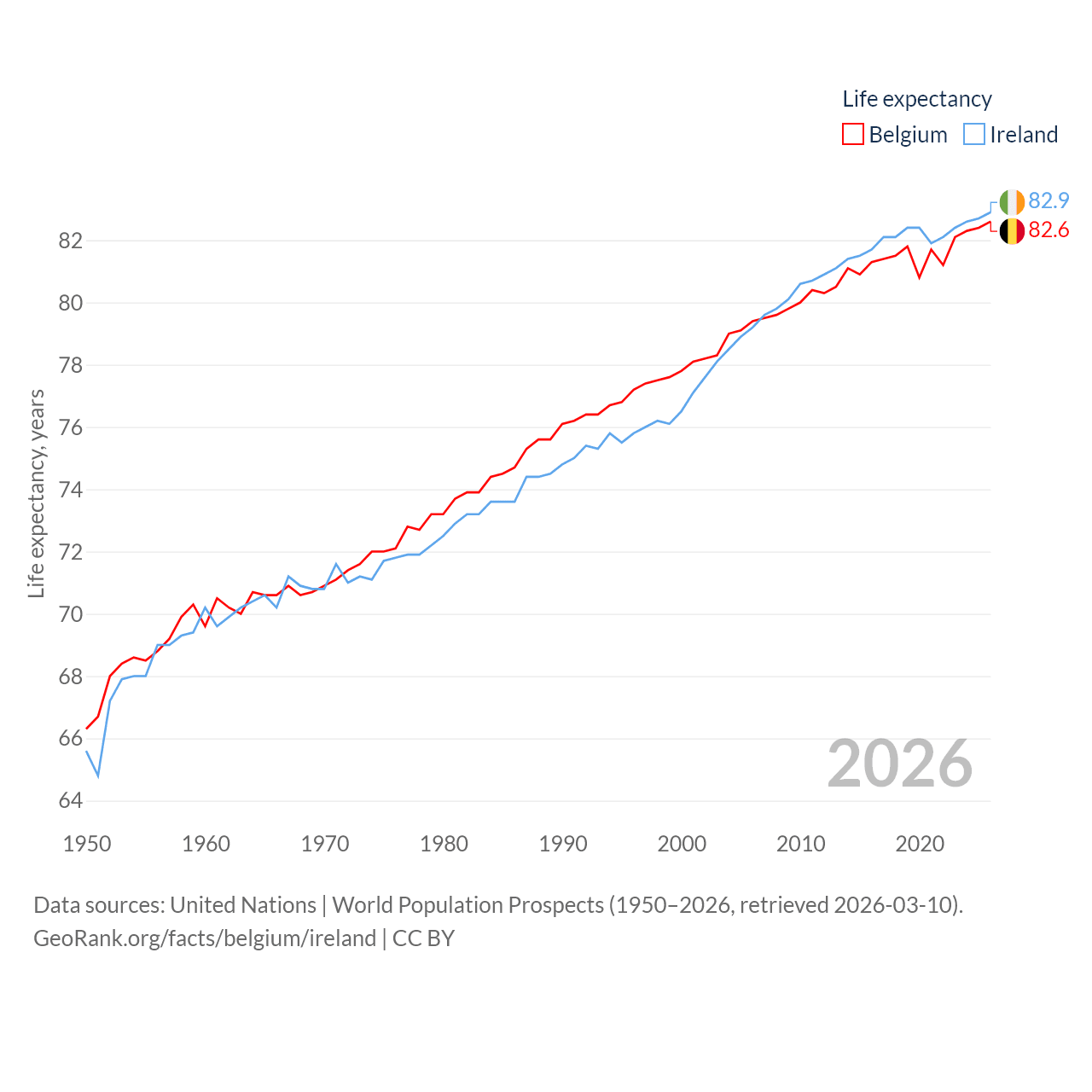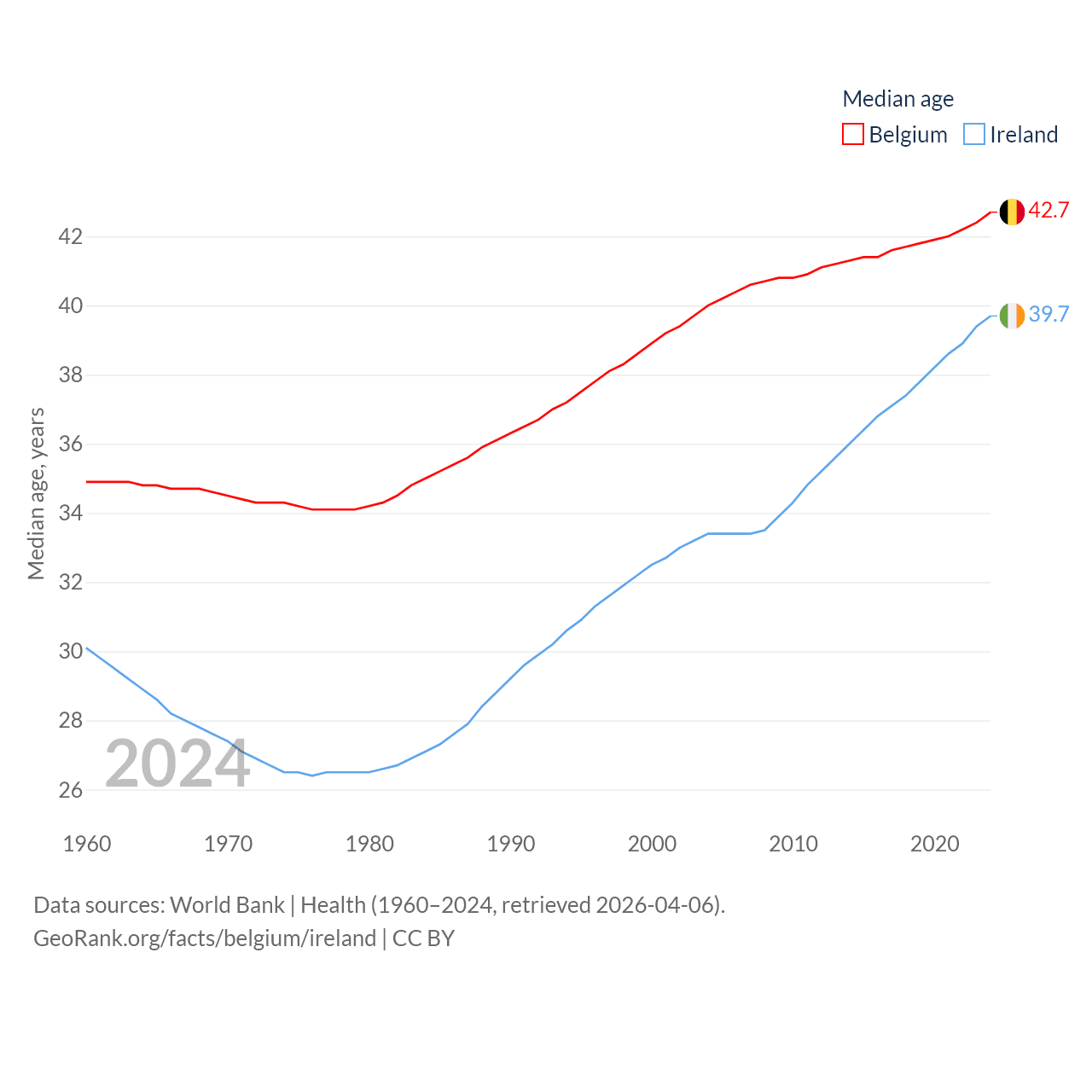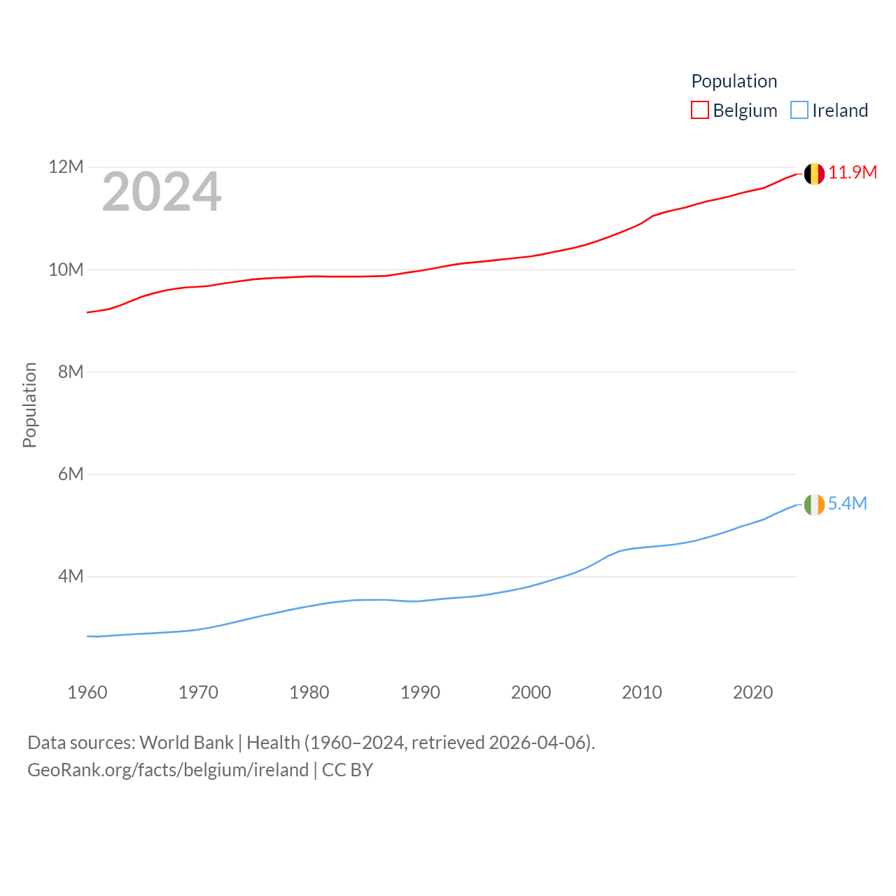 Belgium has a population of 11.9M (ranked 82/197), compared with 5.4M in Ireland (ranked 120/197). Belgium's land area is 11,774 sq mi versus 26,599 sq mi for Ireland (ranked 136th vs. 119th).