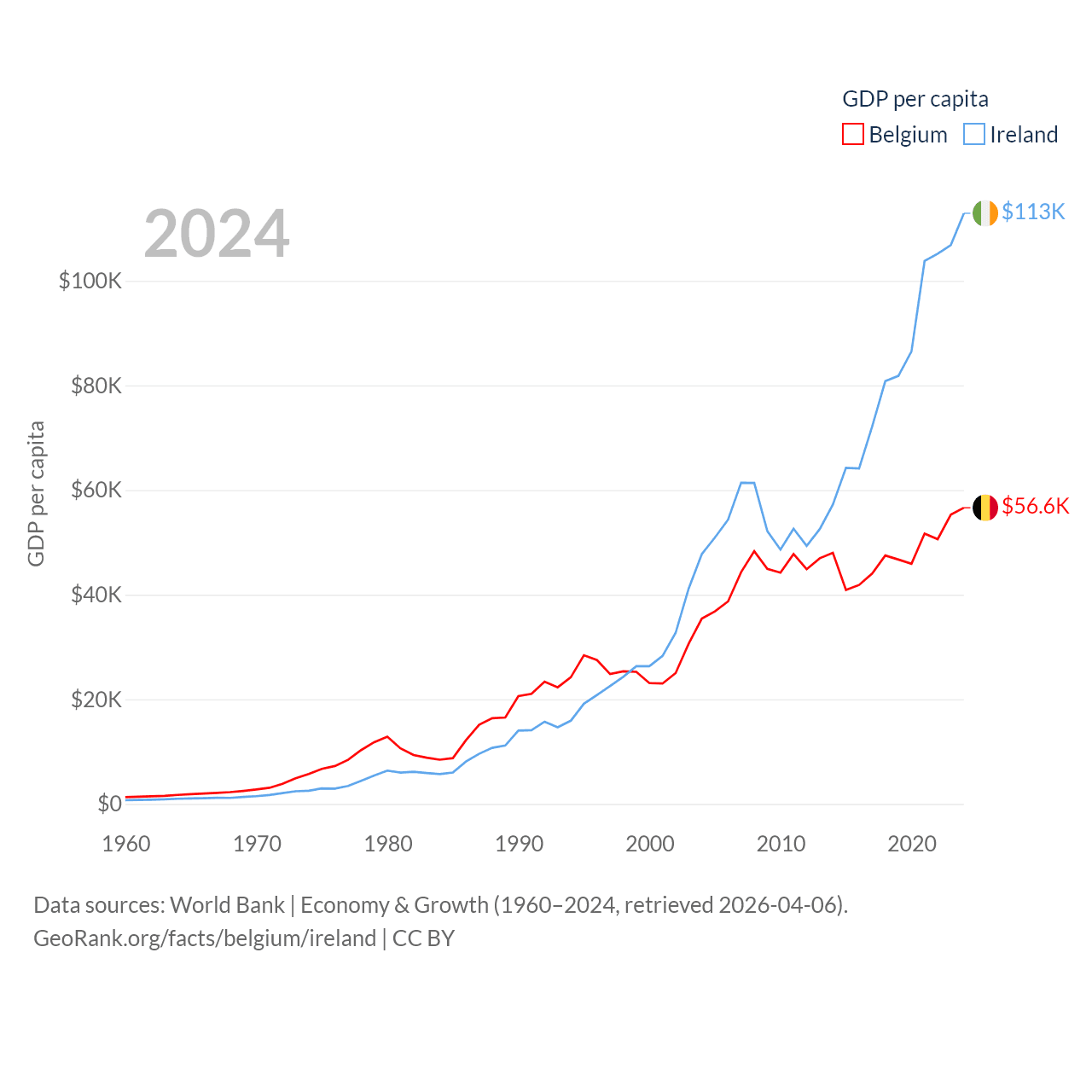 By GDP, Belgium ranks 23/197 ($671B) and Ireland ranks 25/197 ($609B). By GDP per capita, Belgium ranks 18/197 ($56,615), while Ireland ranks 4/197 ($112,895).