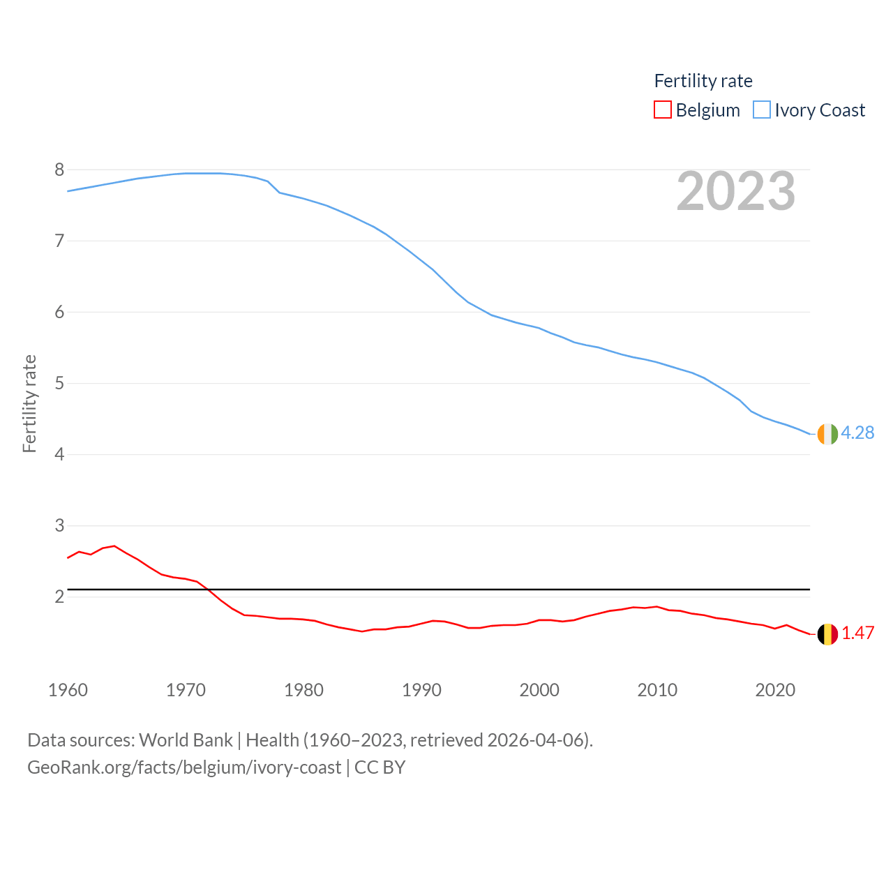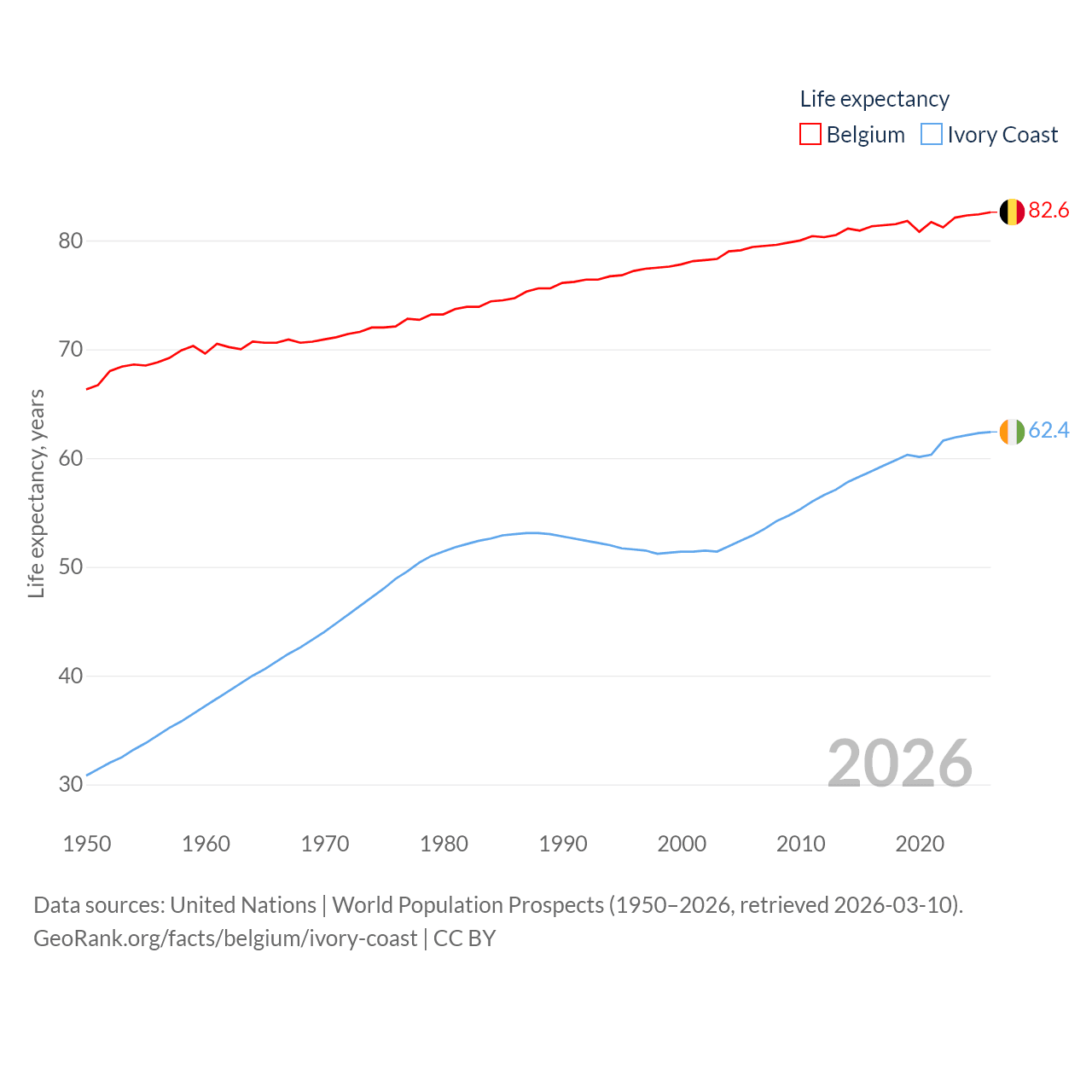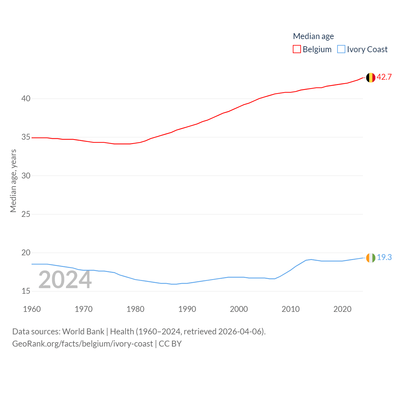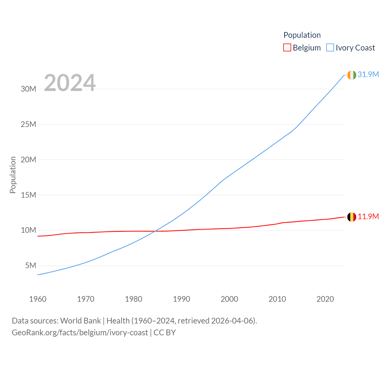 Belgium has a population of 11.9M (ranked 82/197), compared with 31.9M in Ivory Coast (ranked 50/197). Belgium's land area is 11,774 sq mi versus 122,780 sq mi for Ivory Coast (ranked 136th vs. 66th).