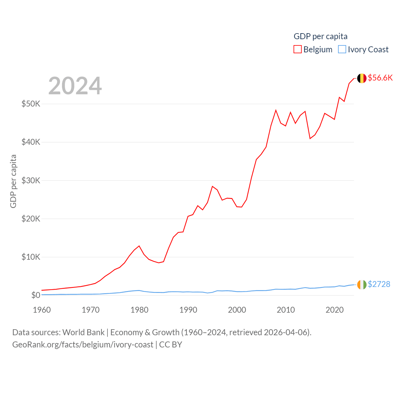 By GDP, Belgium ranks 23/197 ($671B) and Ivory Coast ranks 77/197 ($87.1B). By GDP per capita, Belgium ranks 18/197 ($56,615), while Ivory Coast ranks 142/197 ($2,728).