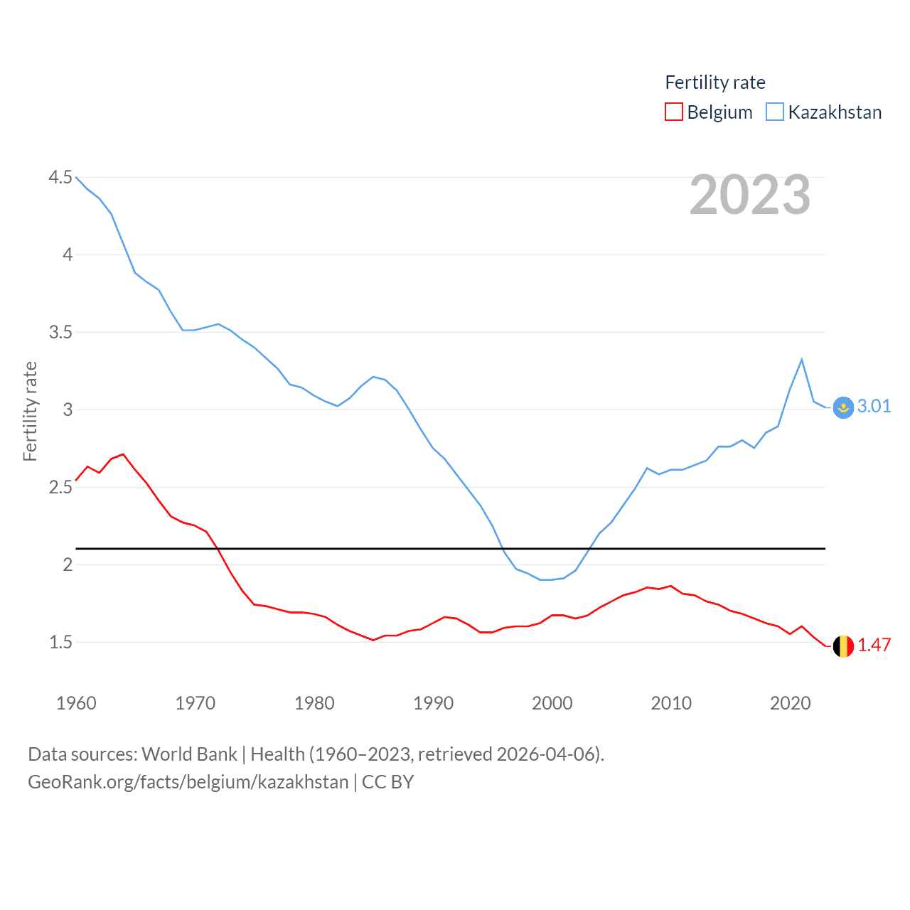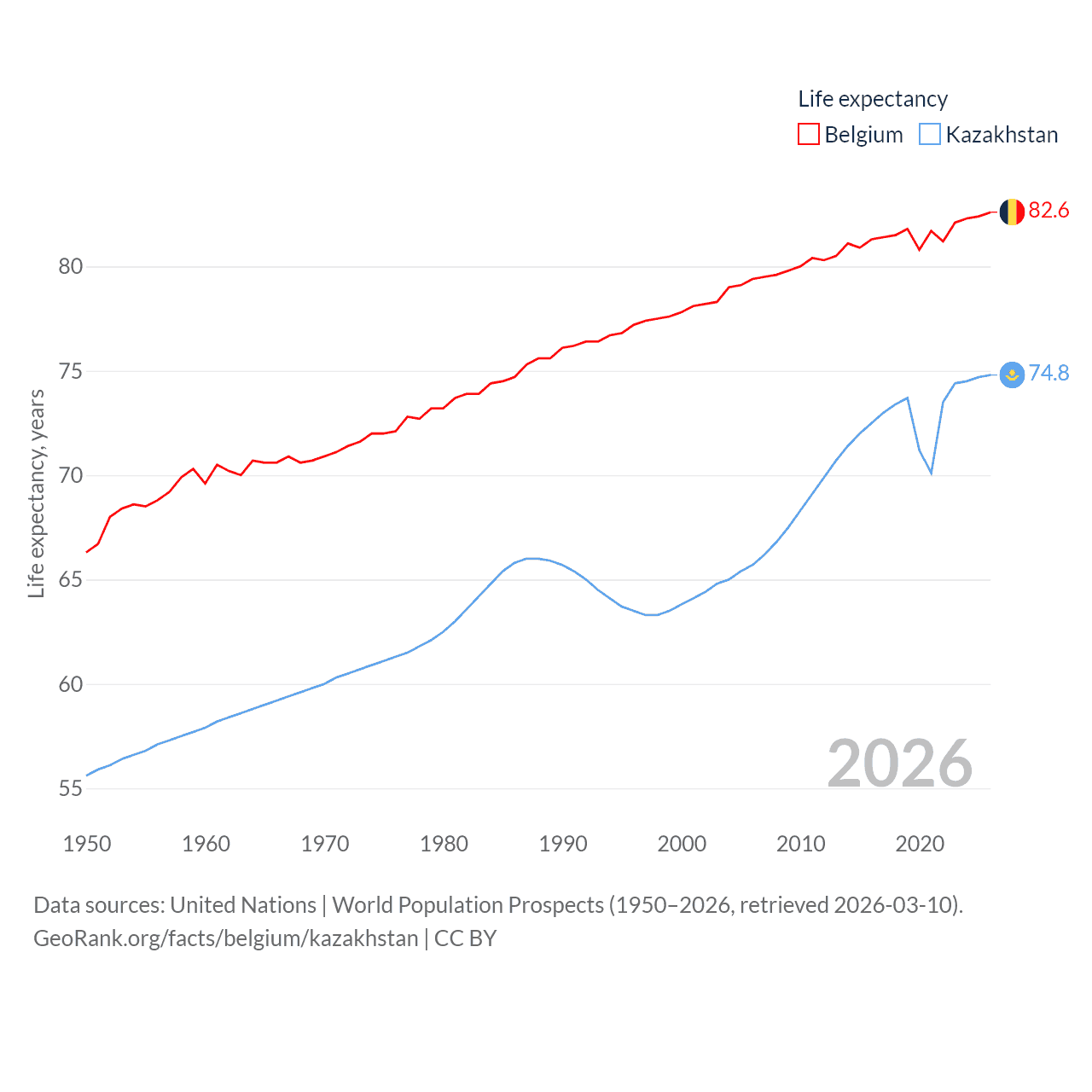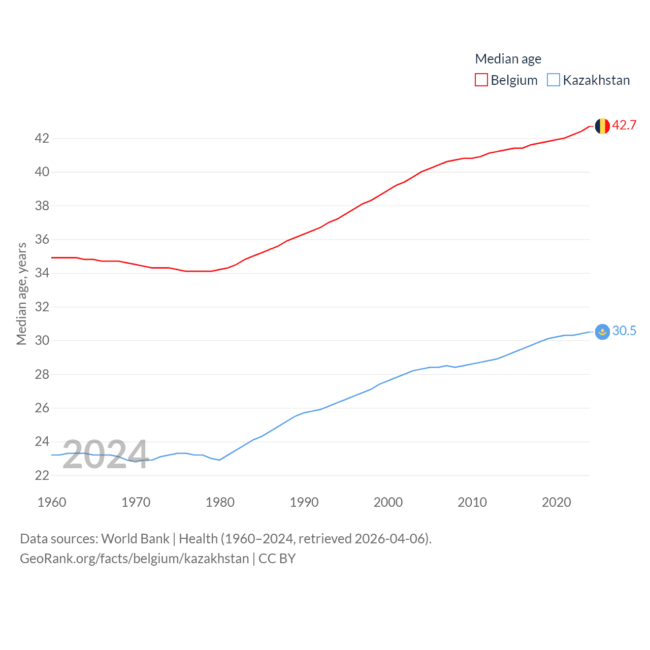 Belgium has a population of 11.9M (ranked 82/197), compared with 20.6M in Kazakhstan (ranked 64/197). Belgium's land area is 11,774 sq mi versus 1,042,360 sq mi for Kazakhstan (ranked 136th vs. 9th).