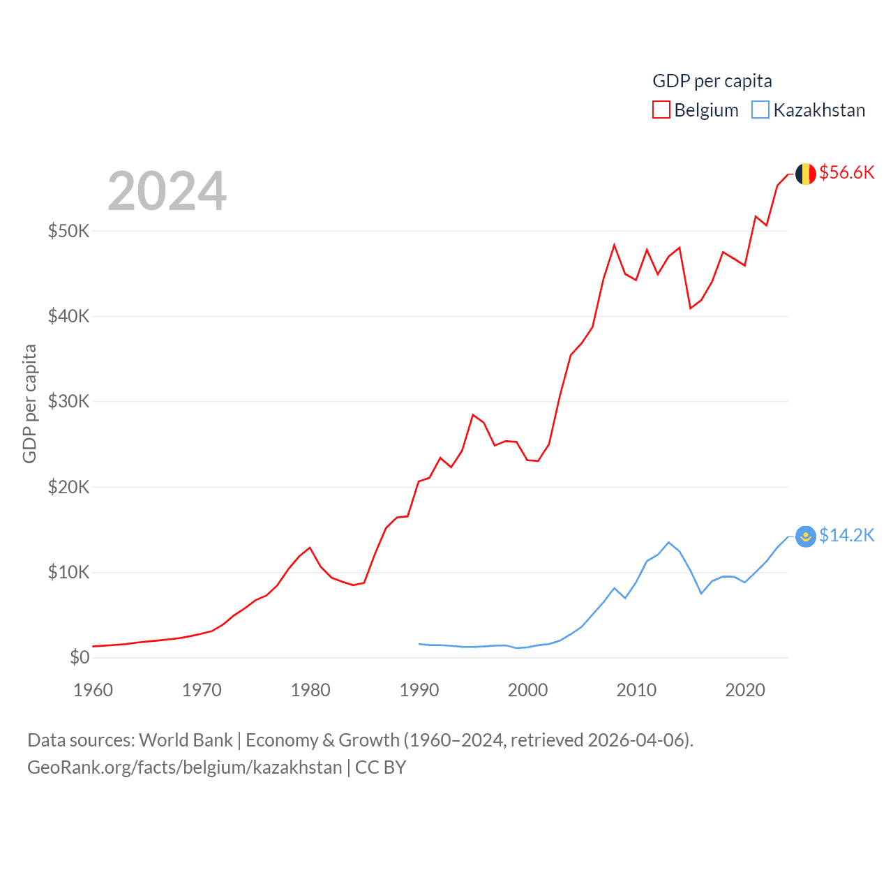 By GDP, Belgium ranks 23/197 ($671B) and Kazakhstan ranks 48/197 ($291B). By GDP per capita, Belgium ranks 18/197 ($56,615), while Kazakhstan ranks 71/197 ($14,155).