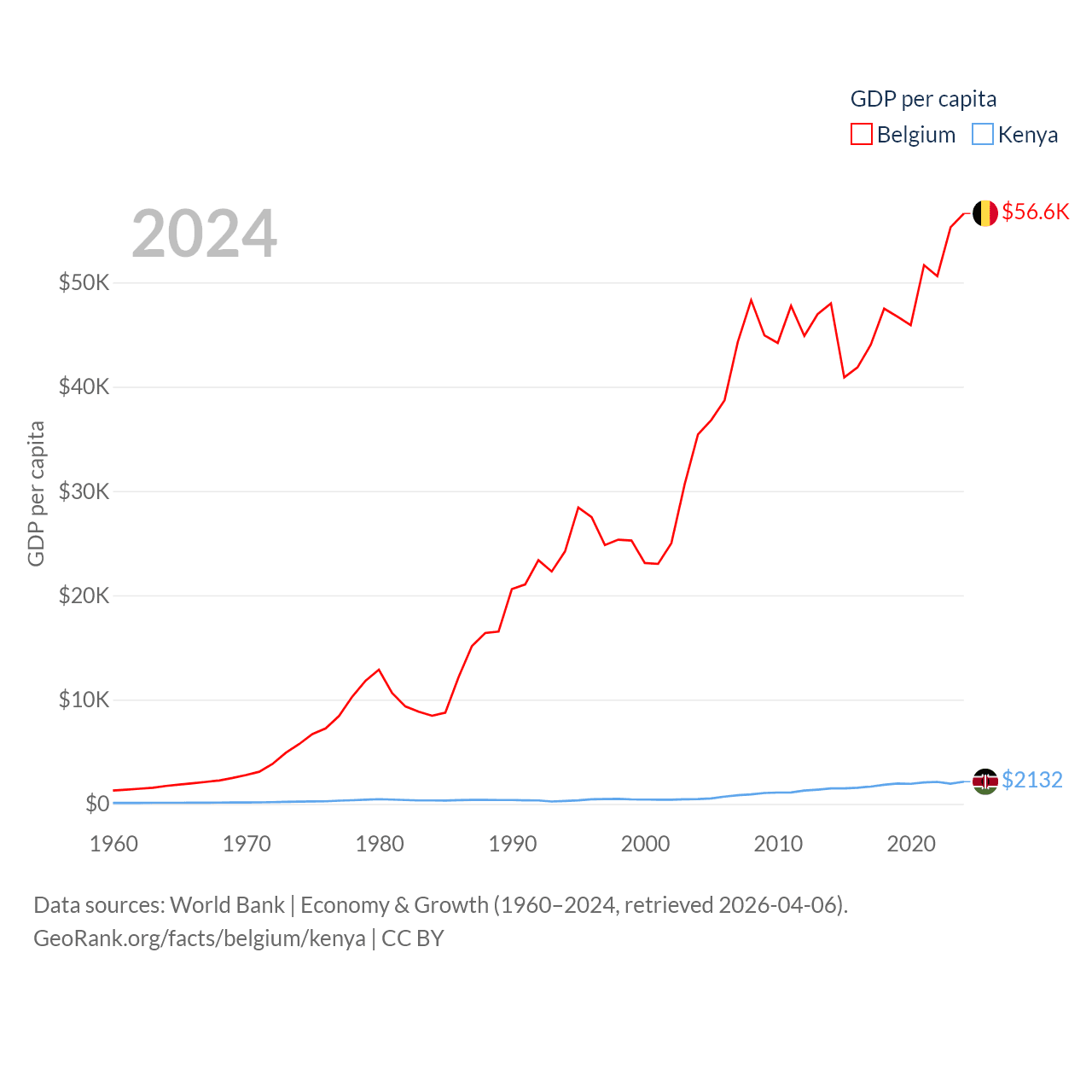 By GDP, Belgium ranks 23/197 ($671B) and Kenya ranks 64/197 ($120B). By GDP per capita, Belgium ranks 18/197 ($56,615), while Kenya ranks 154/197 ($2,132).