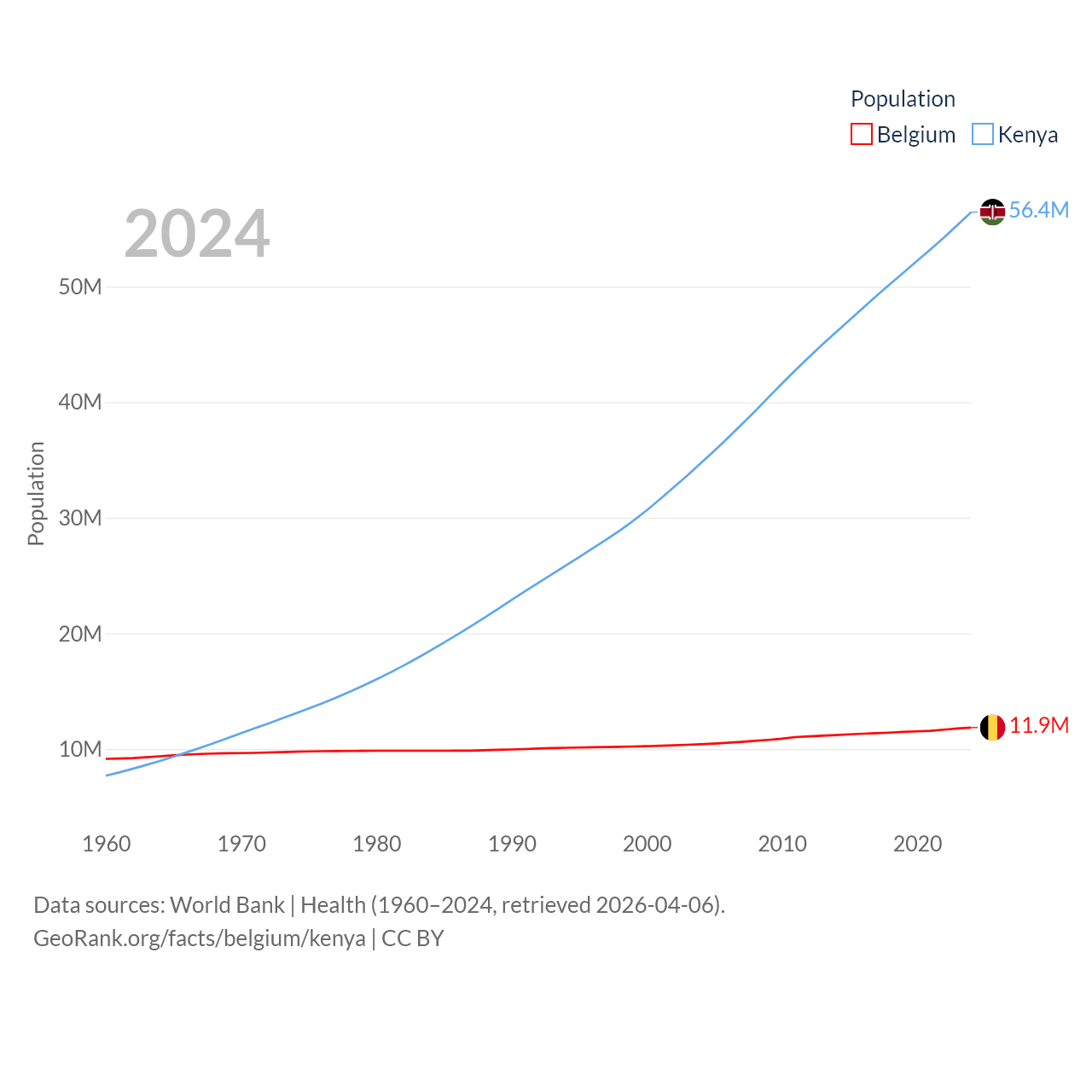Belgium has a population of 11.9M (ranked 82/197), compared with 56.4M in Kenya (ranked 26/197). Belgium's land area is 11,774 sq mi versus 224,278 sq mi for Kenya (ranked 136th vs. 45th).