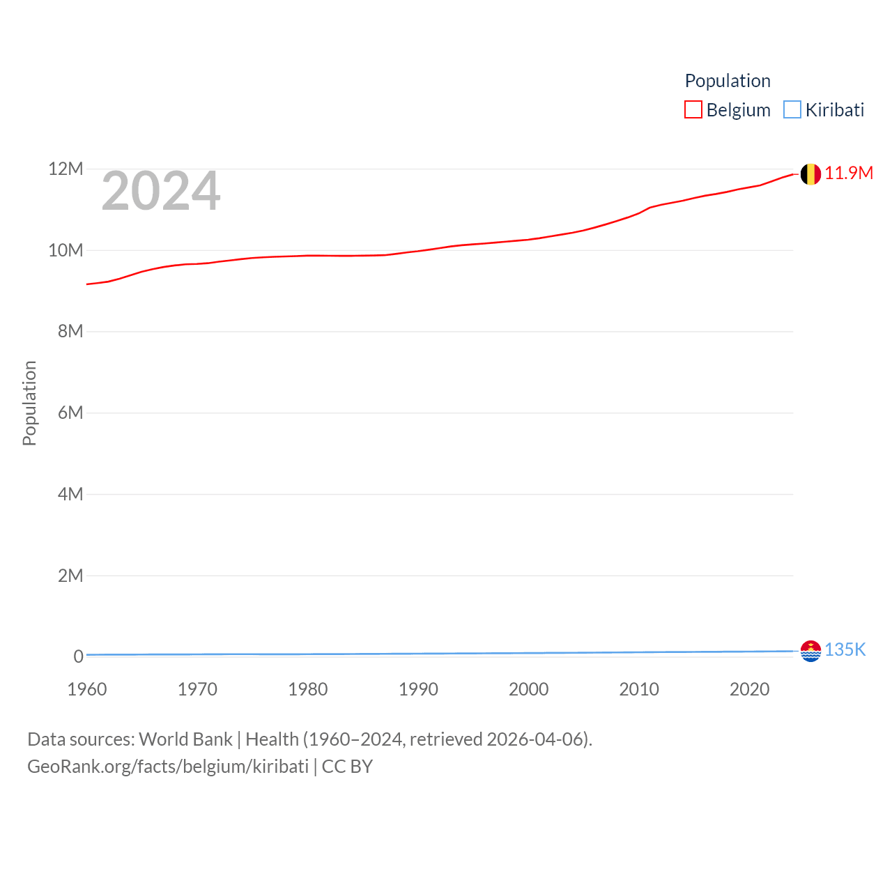 Belgium has a population of 11.9M (ranked 82/197), compared with 135K in Kiribati (ranked 180/197). Belgium's land area is 11,774 sq mi versus 313 sq mi for Kiribati (ranked 136th vs. 173rd).
