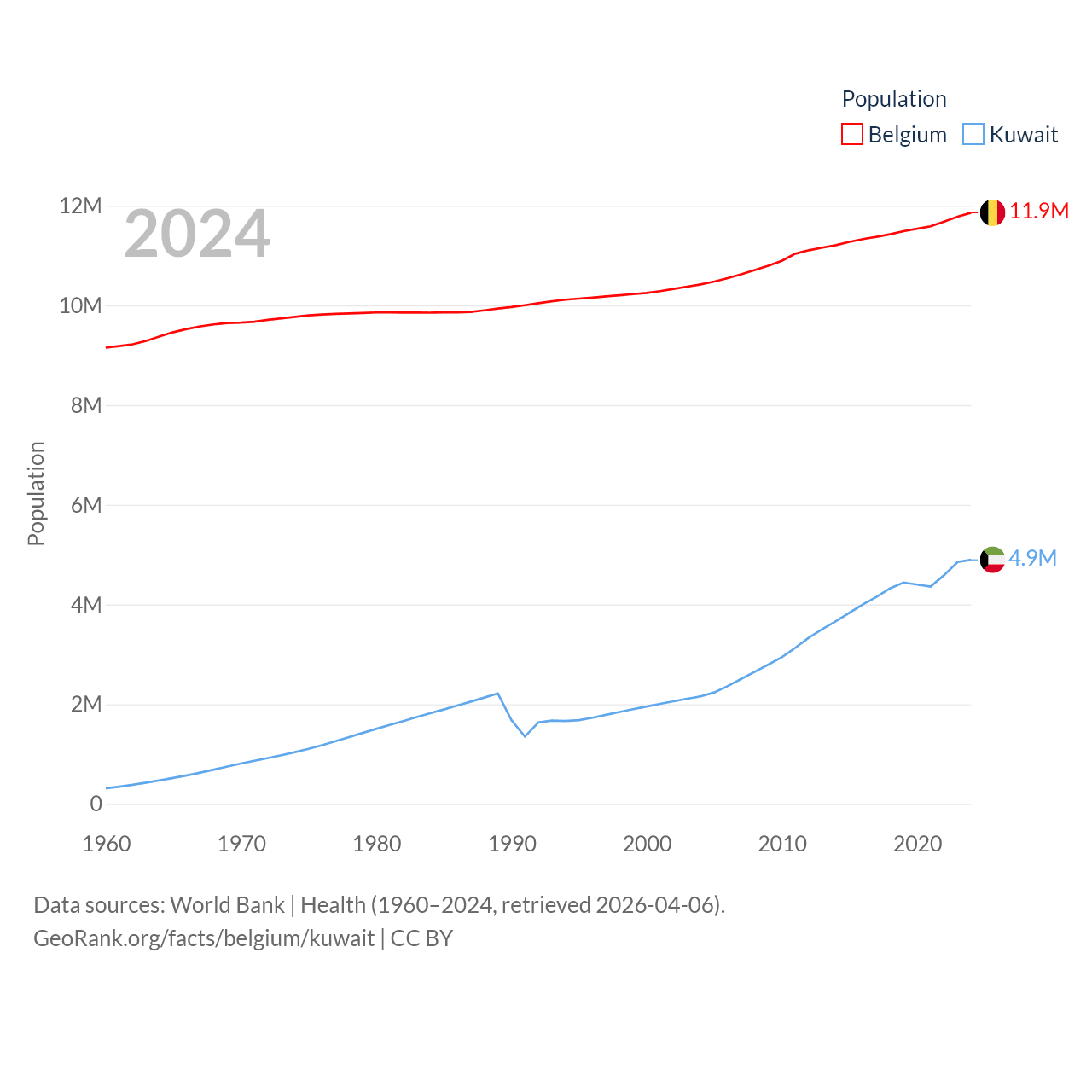 Belgium has a population of 11.9M (ranked 82/197), compared with 4.9M in Kuwait (ranked 127/197). Belgium's land area is 11,774 sq mi versus 6,880 sq mi for Kuwait (ranked 136th vs. 153rd).