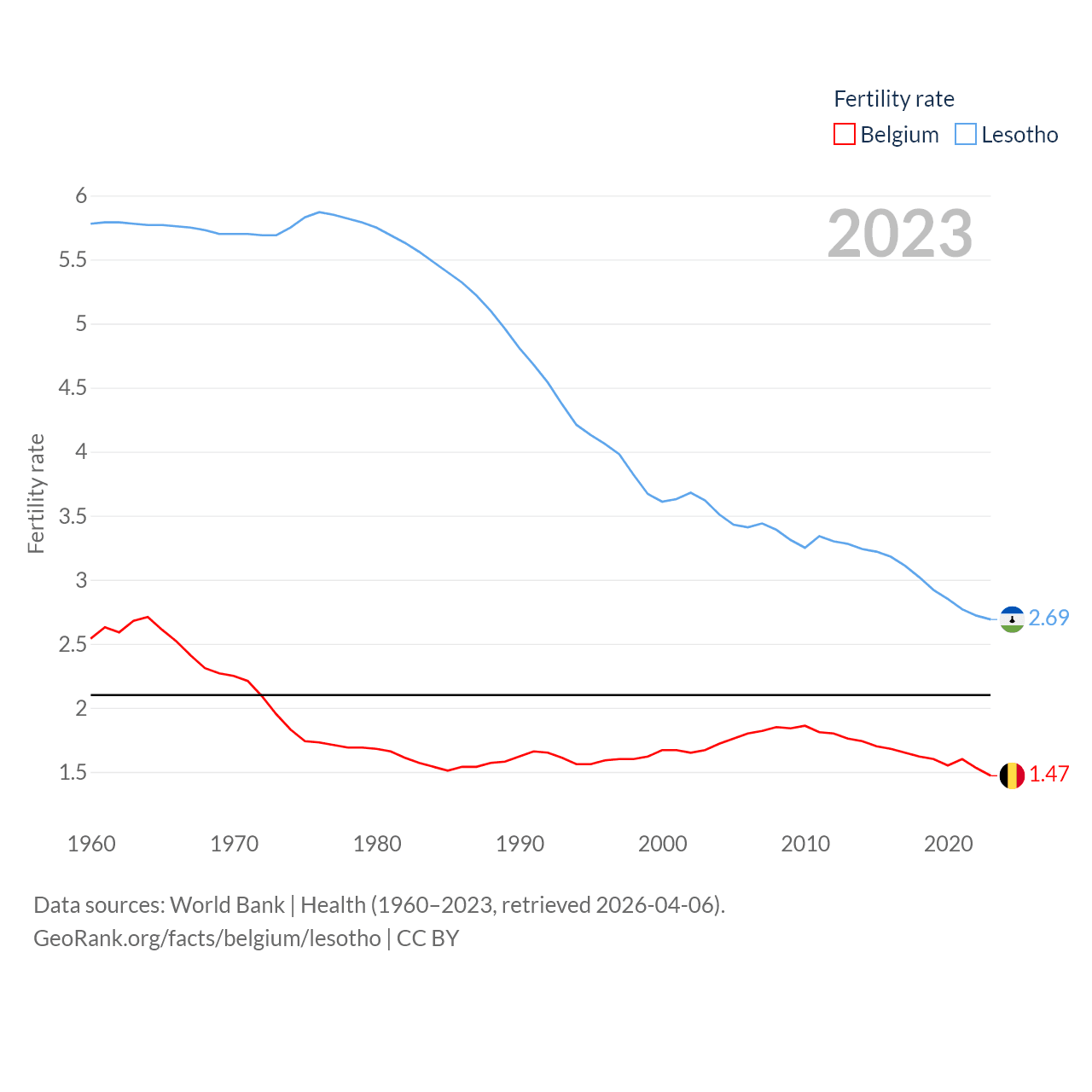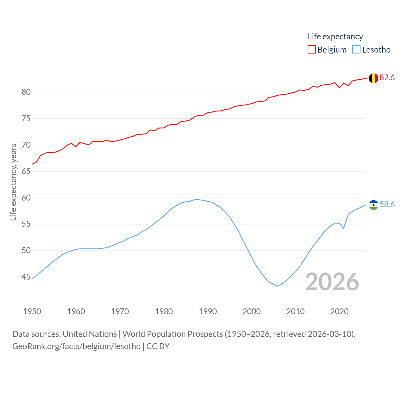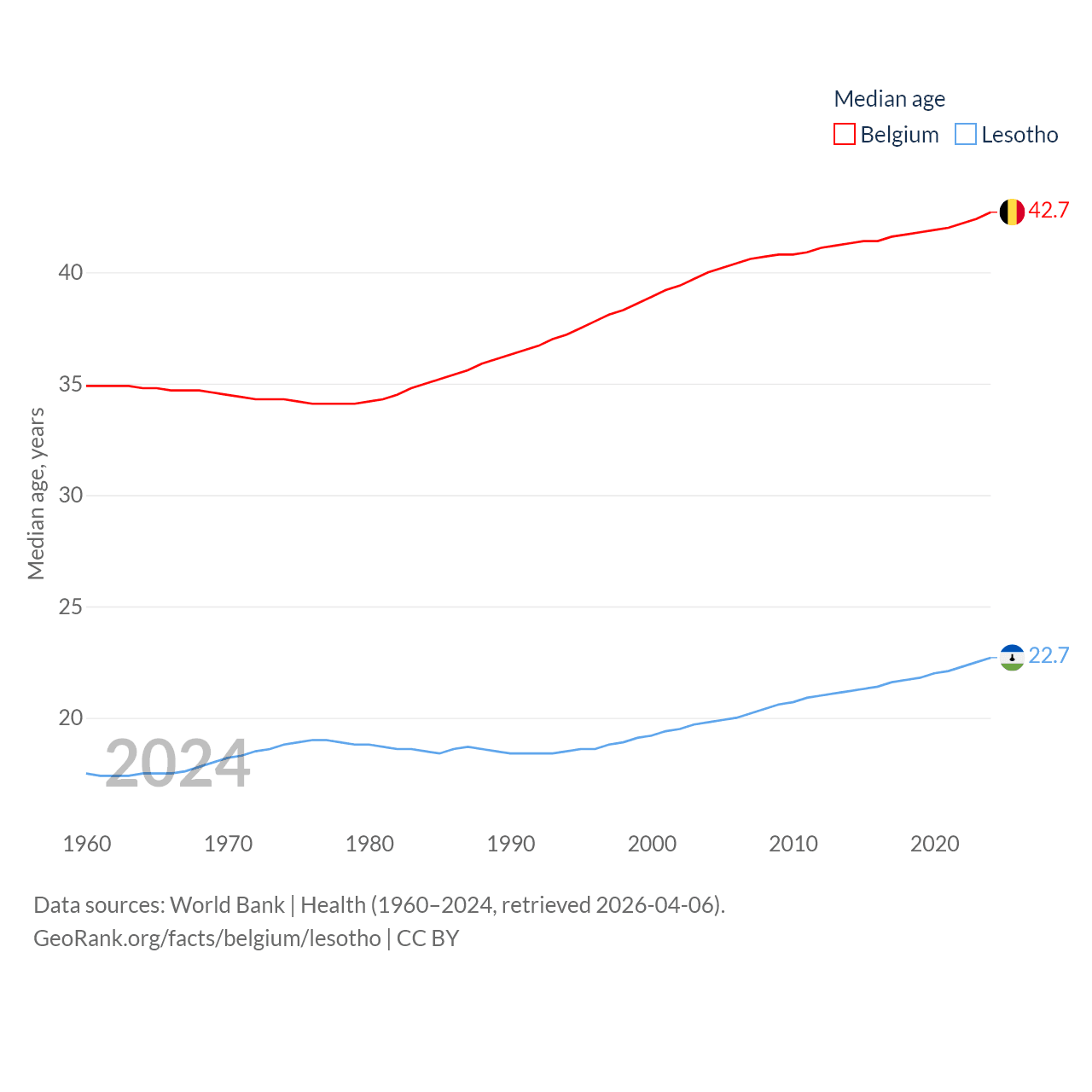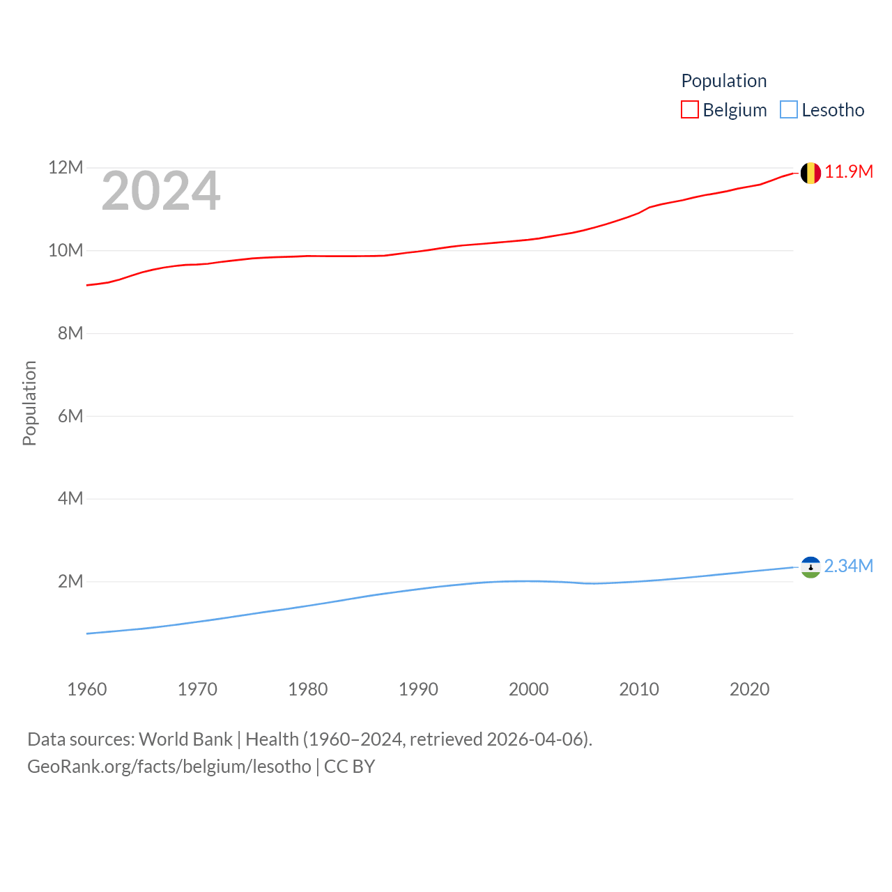 Belgium has a population of 11.9M (ranked 82/197), compared with 2.34M in Lesotho (ranked 145/197). Belgium's land area is 11,774 sq mi versus 11,722 sq mi for Lesotho (ranked 136th vs. 137th).