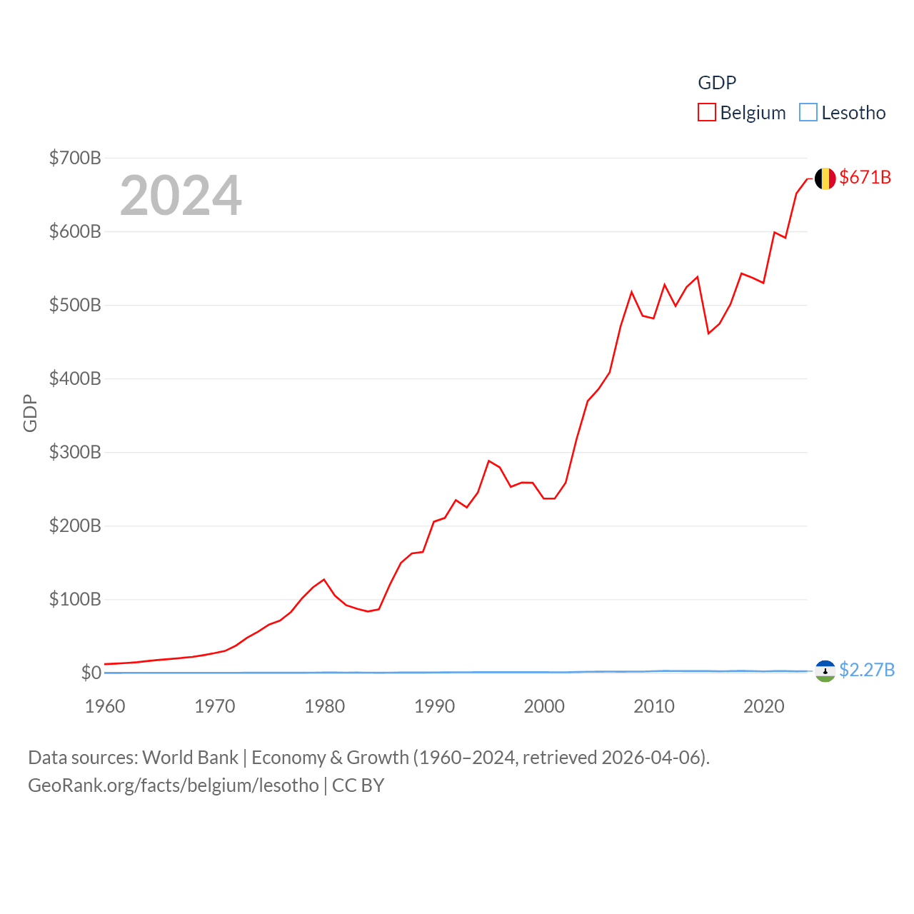 By GDP, Belgium ranks 23/197 ($671B) and Lesotho ranks 175/197 ($2.27B). By GDP per capita, Belgium ranks 18/197 ($56,615), while Lesotho ranks 181/197 ($972).