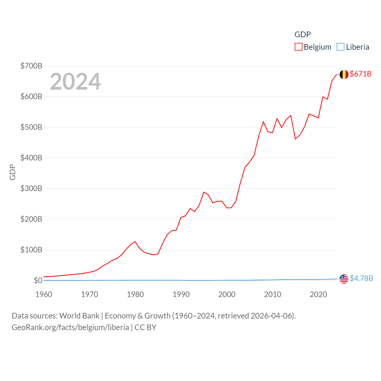 By GDP, Belgium ranks 23/197 ($671B) and Liberia ranks 163/197 ($4.78B). By GDP per capita, Belgium ranks 18/197 ($56,615), while Liberia ranks 184/197 ($851).