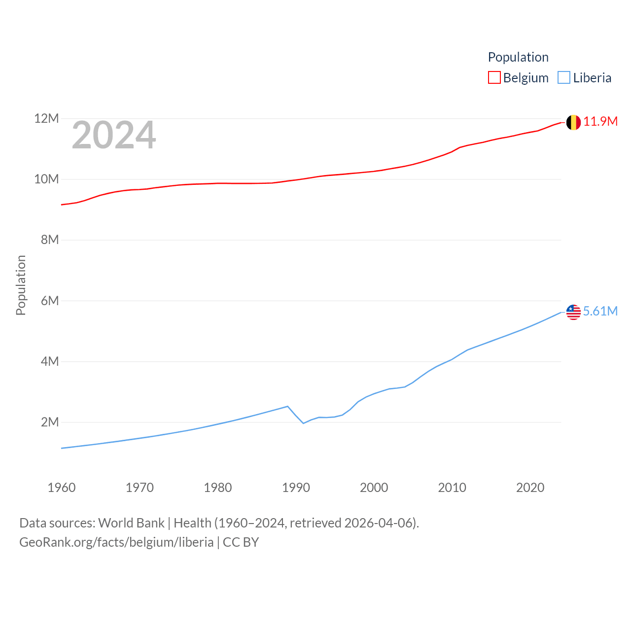 Belgium has a population of 11.9M (ranked 82/197), compared with 5.61M in Liberia (ranked 117/197). Belgium's land area is 11,774 sq mi versus 37,189 sq mi for Liberia (ranked 136th vs. 106th).
