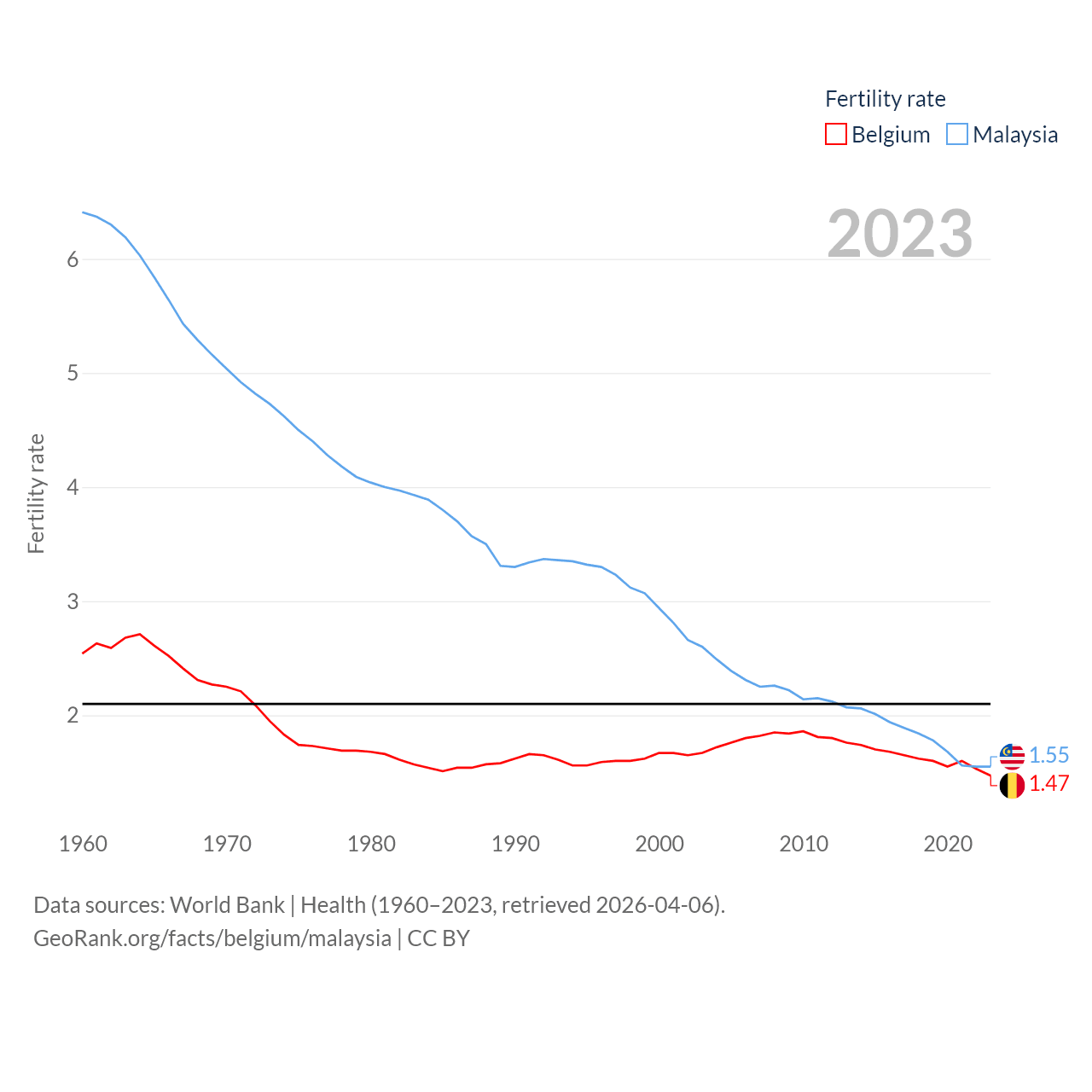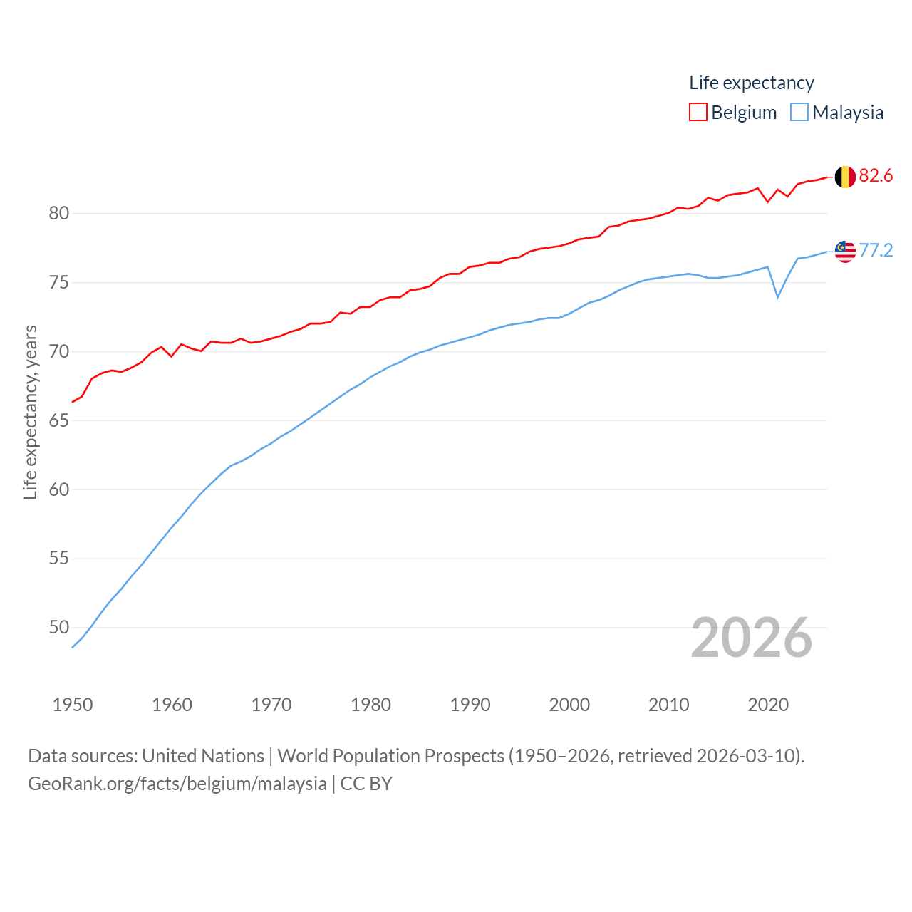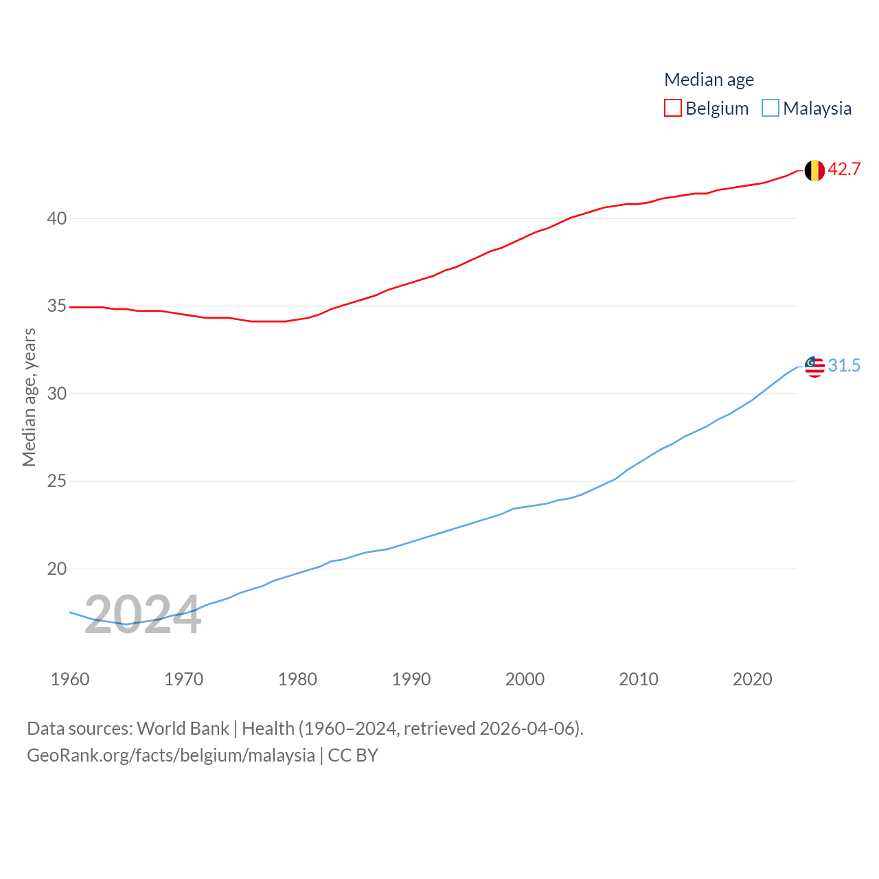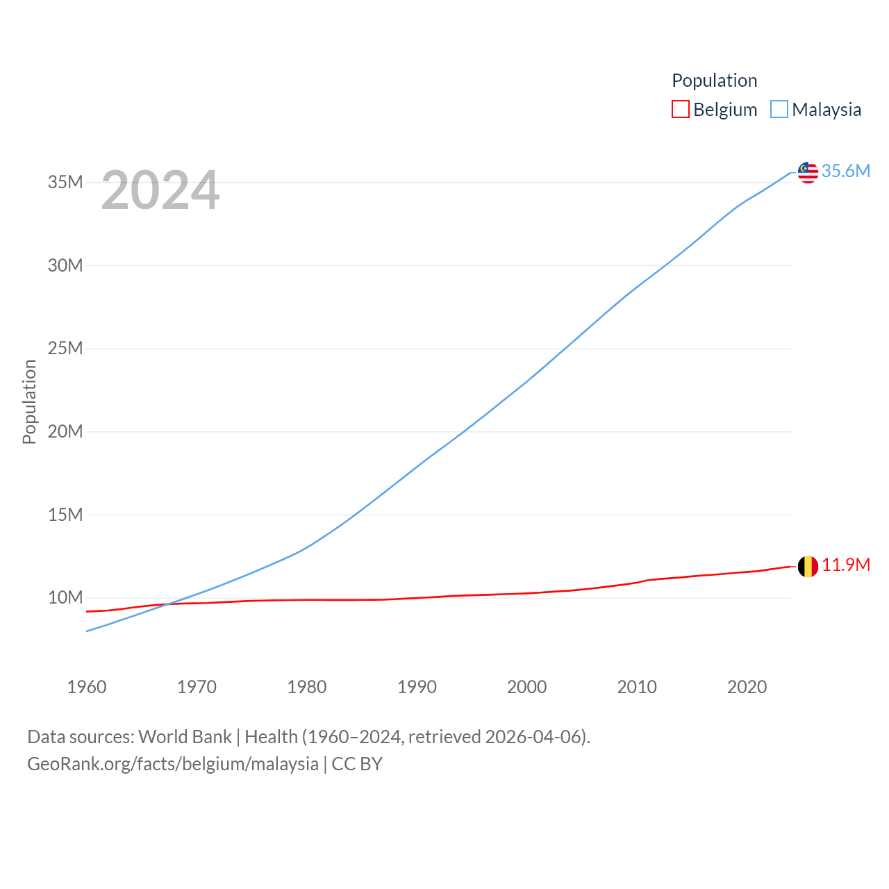 Belgium has a population of 11.9M (ranked 82/197), compared with 35.6M in Malaysia (ranked 44/197). Belgium's land area is 11,774 sq mi versus 126,854 sq mi for Malaysia (ranked 136th vs. 65th).