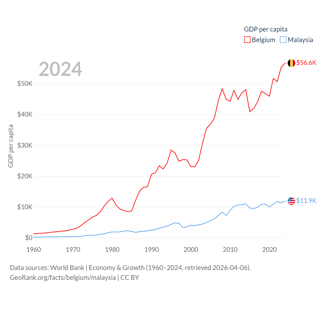By GDP, Belgium ranks 23/197 ($671B) and Malaysia ranks 38/197 ($422B). By GDP per capita, Belgium ranks 18/197 ($56,615), while Malaysia ranks 79/197 ($11,874).