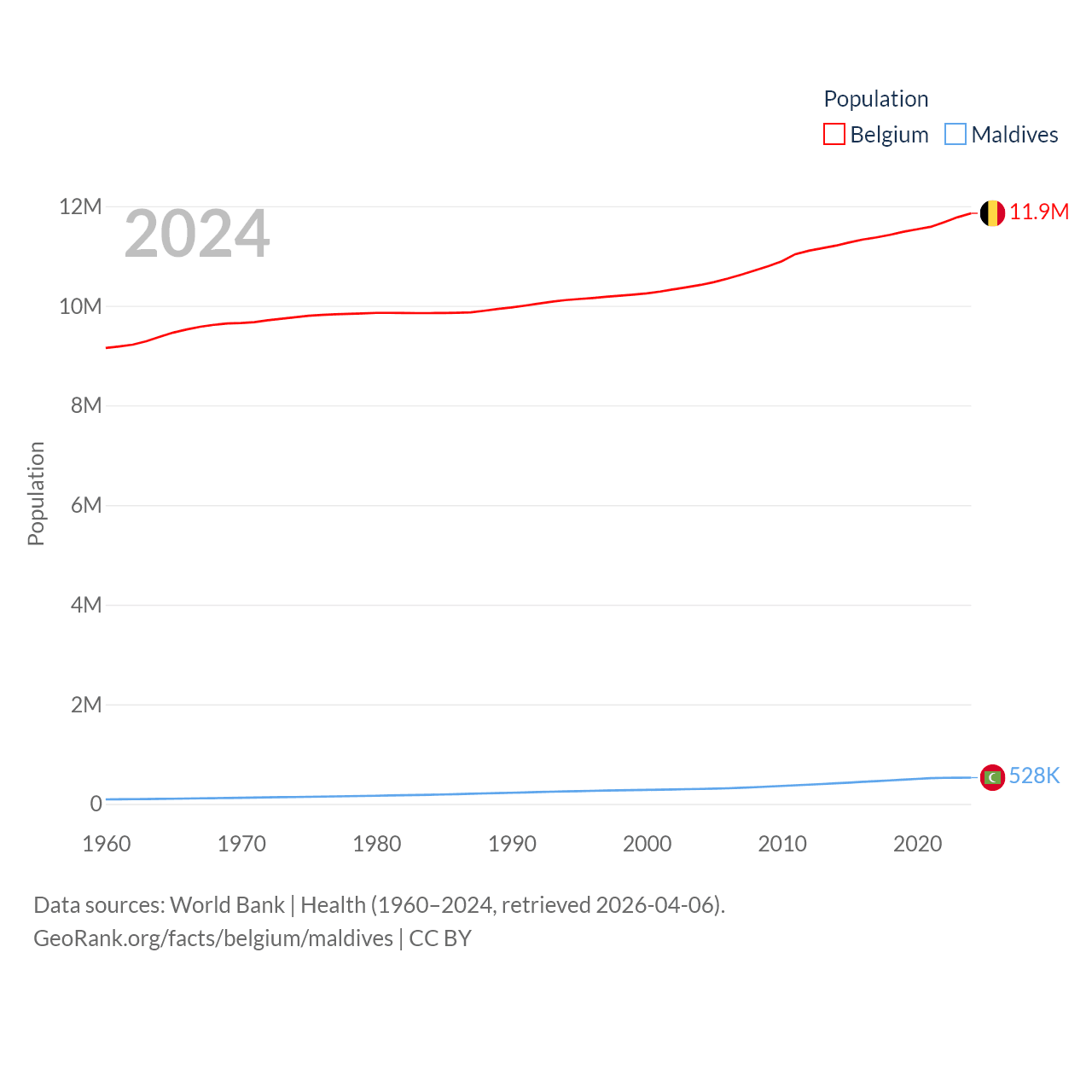 Belgium has a population of 11.9M (ranked 82/197), compared with 528K in Maldives (ranked 168/197). Belgium's land area is 11,774 sq mi versus 115.1 sq mi for Maldives (ranked 136th vs. 188th).