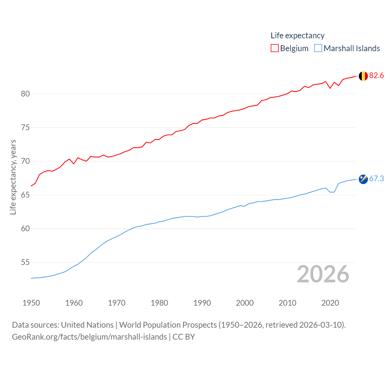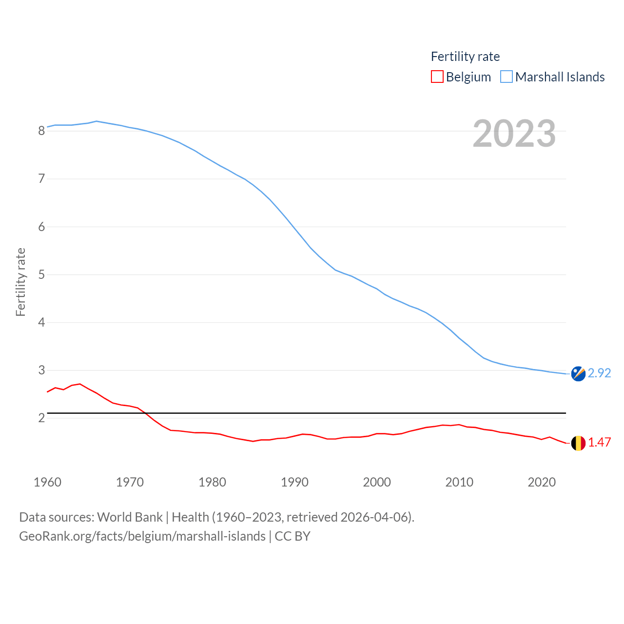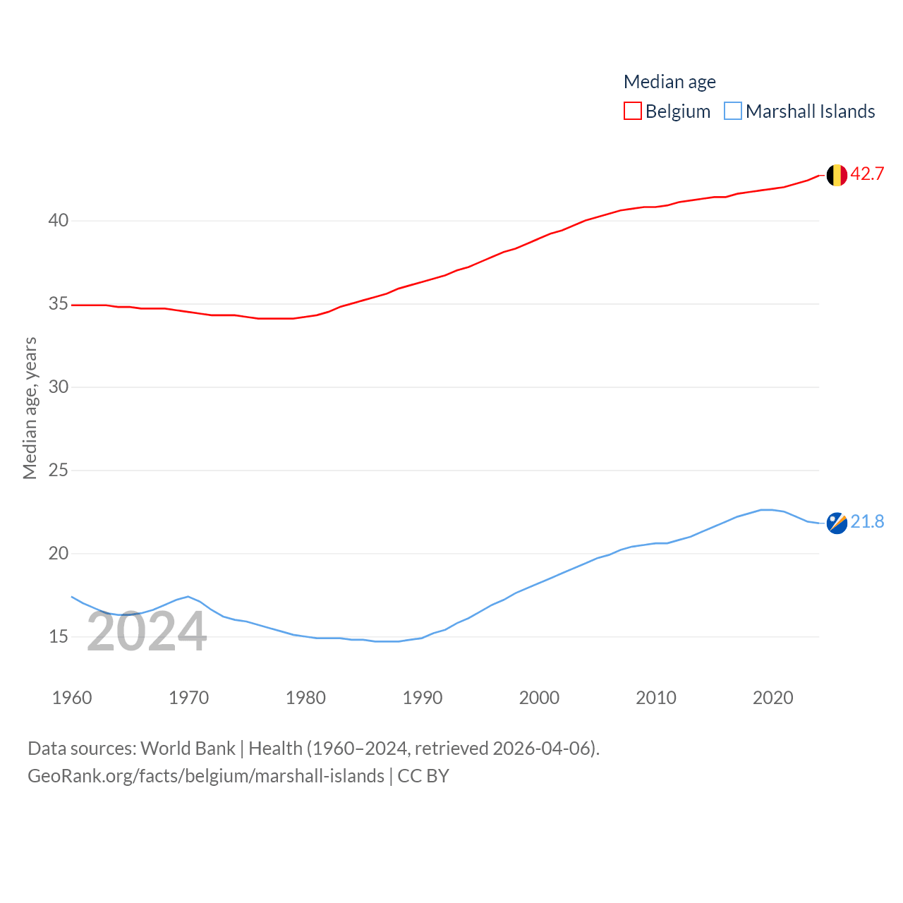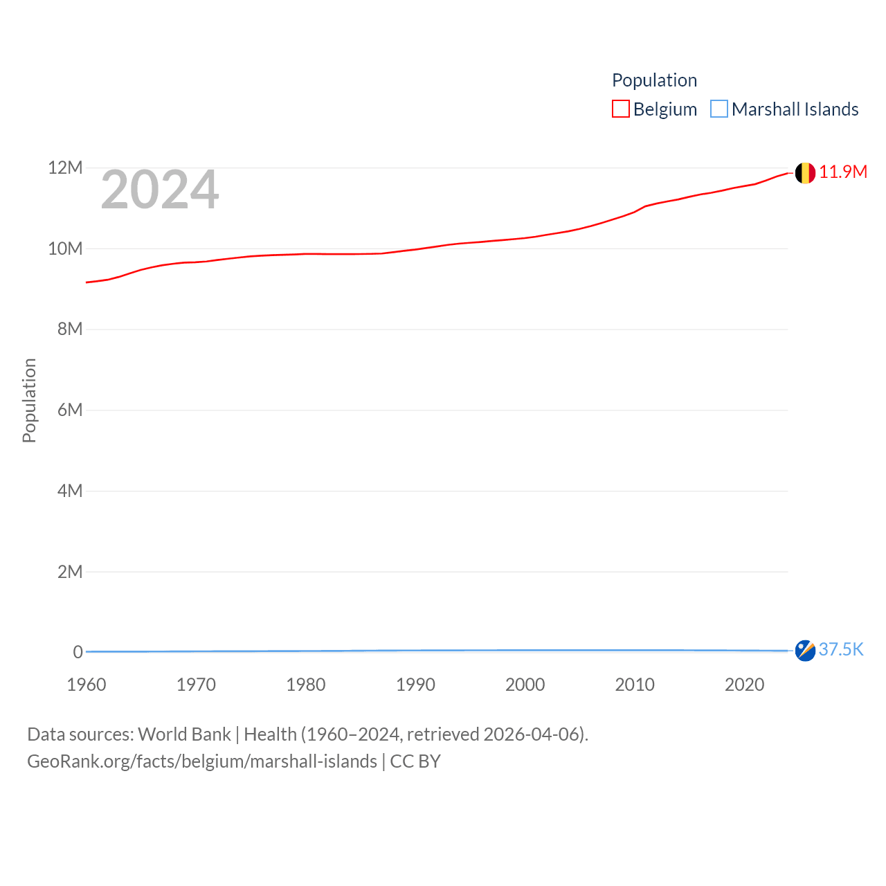 Belgium has a population of 11.9M (ranked 82/197), compared with 37.5K in The Marshall Islands (ranked 192/197). Belgium's land area is 11,774 sq mi versus 69.5 sq mi for The Marshall Islands (ranked 136th vs. 191st).