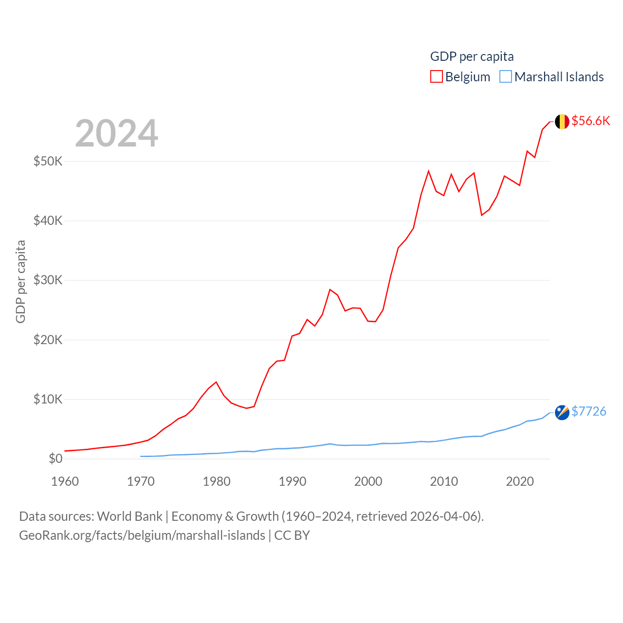 By GDP, Belgium ranks 23/197 ($671B) and The Marshall Islands ranks 193/197 ($290M). By GDP per capita, Belgium ranks 18/197 ($56,615), while The Marshall Islands ranks 96/197 ($7,726).