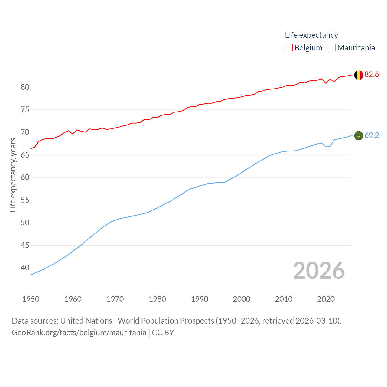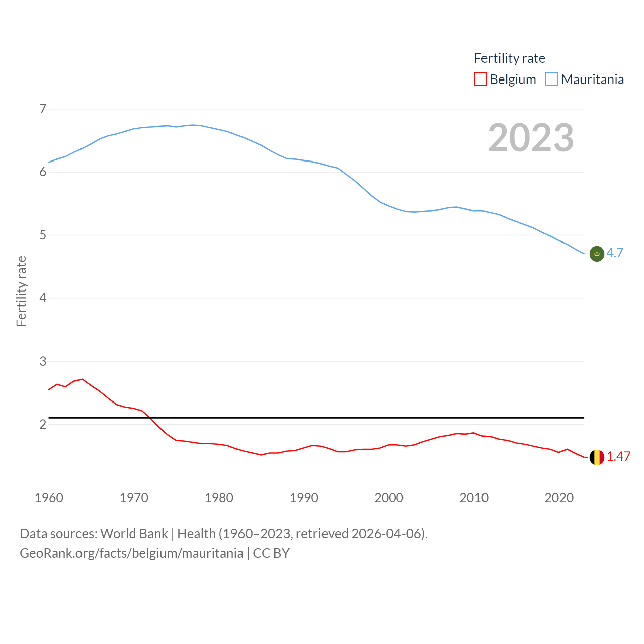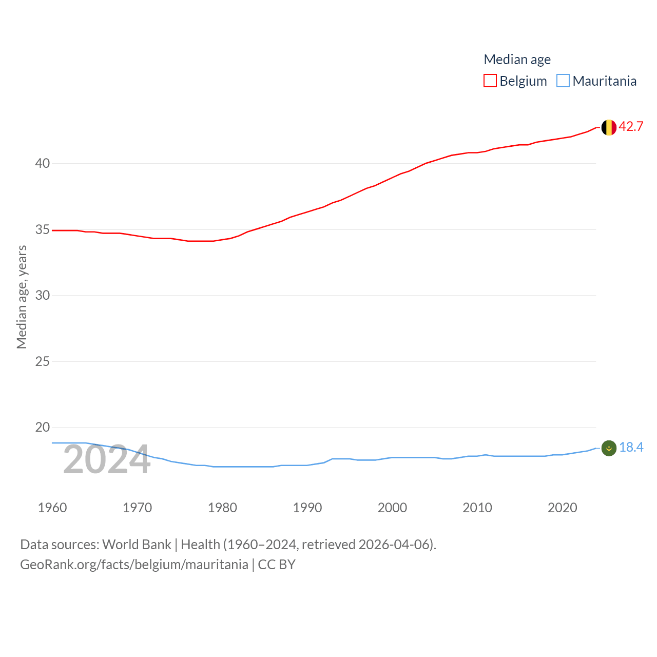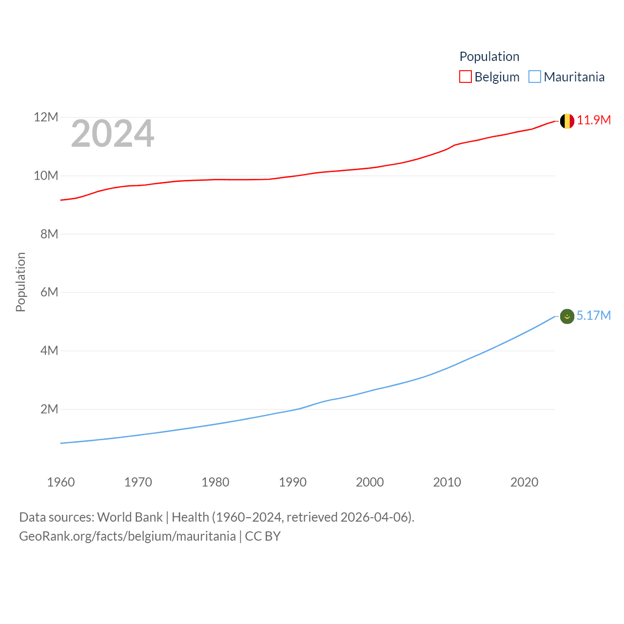 Belgium has a population of 11.9M (ranked 82/197), compared with 5.17M in Mauritania (ranked 125/197). Belgium's land area is 11,774 sq mi versus 397,955 sq mi for Mauritania (ranked 136th vs. 28th).