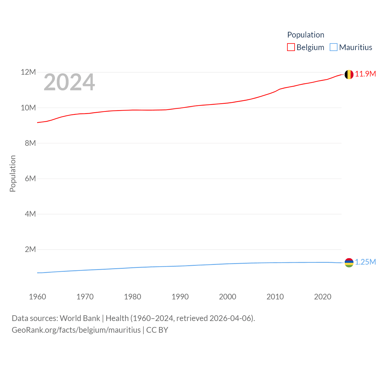 Belgium has a population of 11.9M (ranked 82/197), compared with 1.25M in Mauritius (ranked 156/197). Belgium's land area is 11,774 sq mi versus 771 sq mi for Mauritius (ranked 136th vs. 170th).