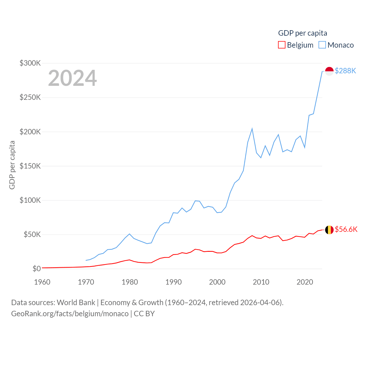 By GDP, Belgium ranks 23/197 ($671B) and Monaco ranks 152/197 ($11.1B). By GDP per capita, Belgium ranks 18/197 ($56,615), while Monaco ranks 1/197 ($288,001).