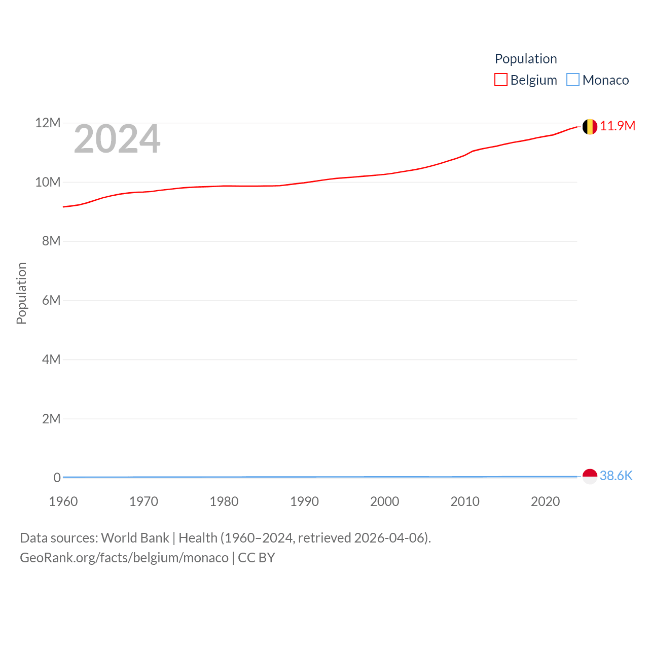 Belgium has a population of 11.9M (ranked 82/197), compared with 38.6K in Monaco (ranked 191/197). Belgium's land area is 11,774 sq mi versus 0.8 sq mi for Monaco (ranked 136th vs. 196th).