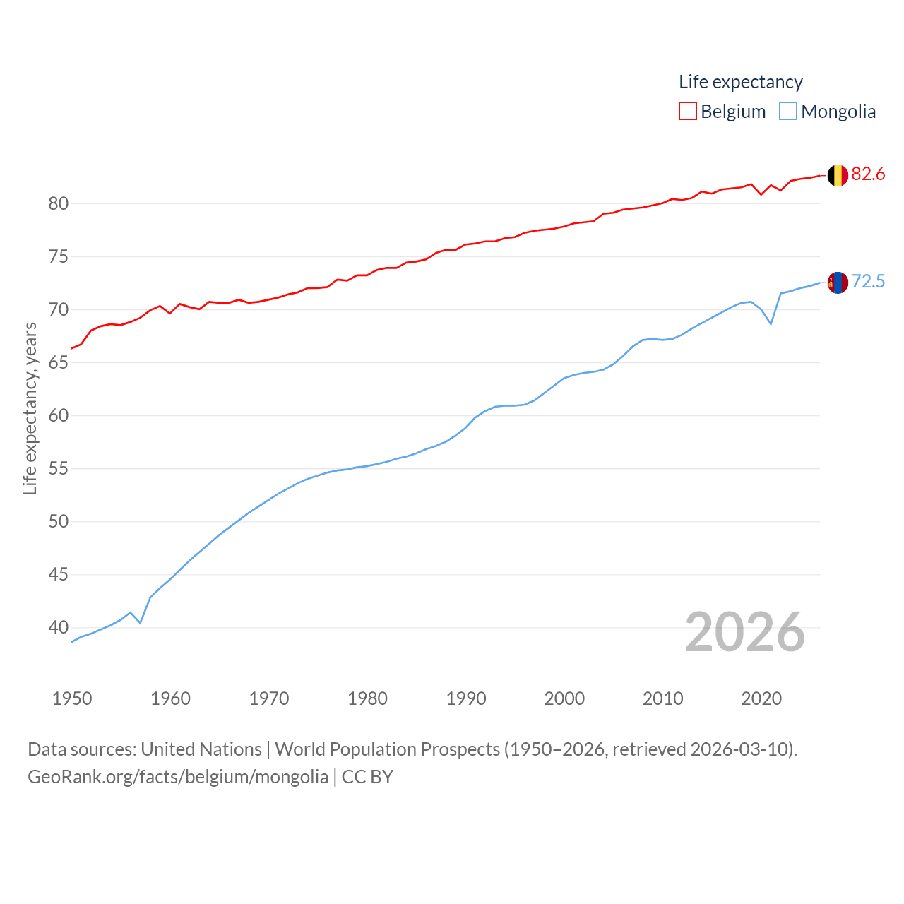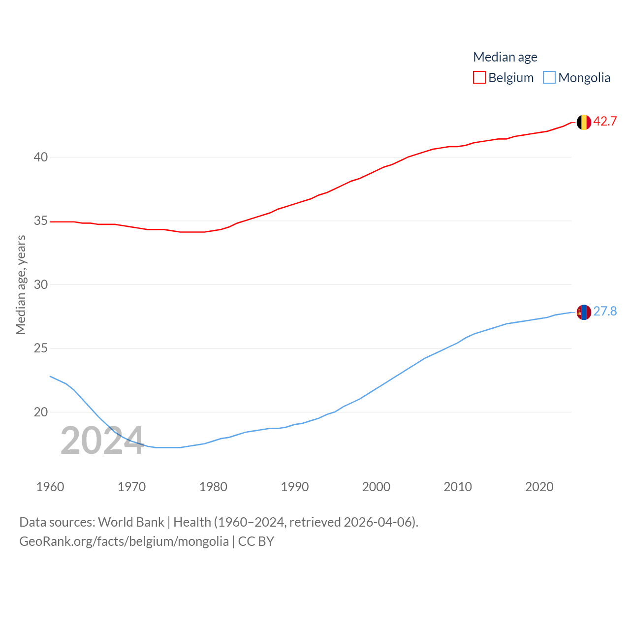 Belgium has a population of 11.9M (ranked 82/197), compared with 3.52M in Mongolia (ranked 132/197). Belgium's land area is 11,774 sq mi versus 601,740 sq mi for Mongolia (ranked 136th vs. 18th).