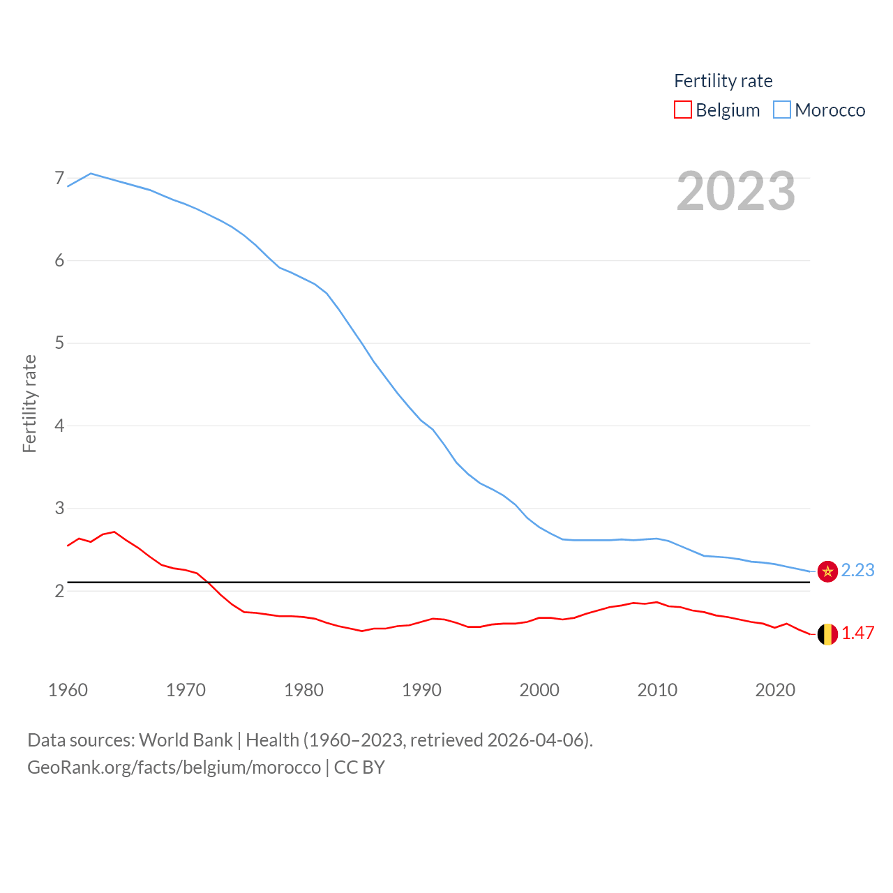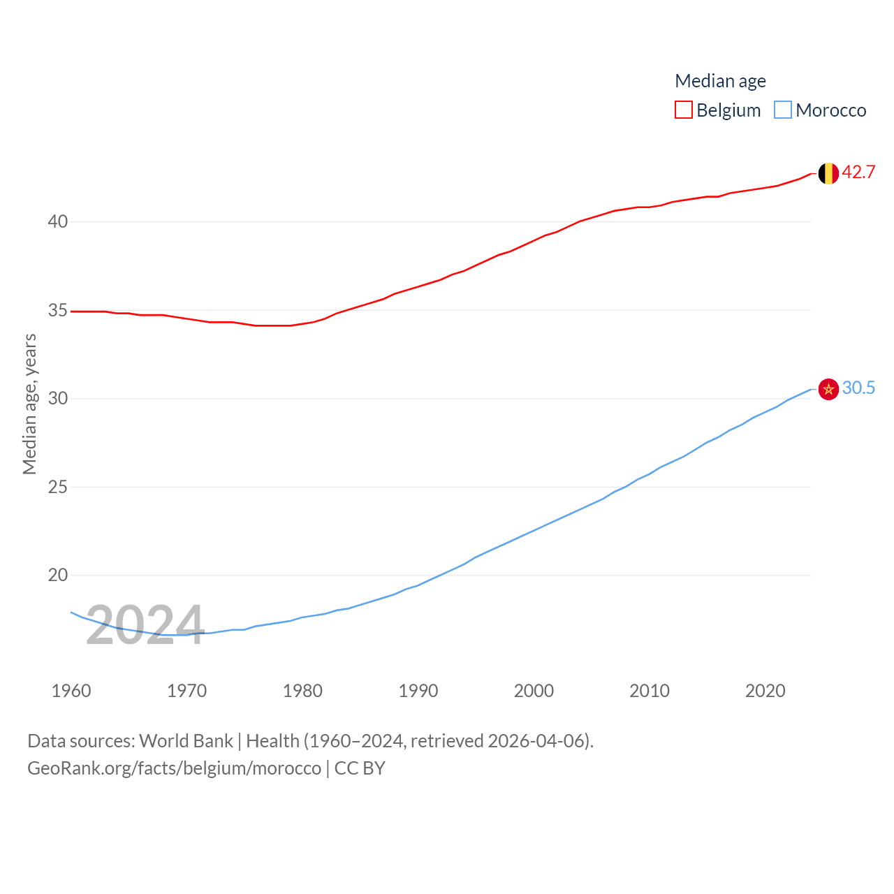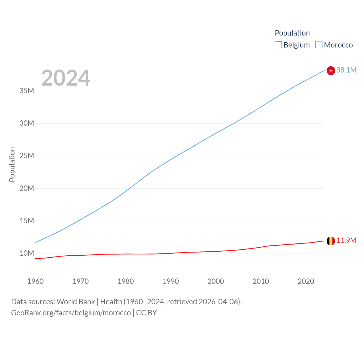 Belgium has a population of 11.9M (ranked 82/197), compared with 38.1M in Morocco (ranked 39/197). Belgium's land area is 11,774 sq mi versus 172,317 sq mi for Morocco (ranked 136th vs. 55th).