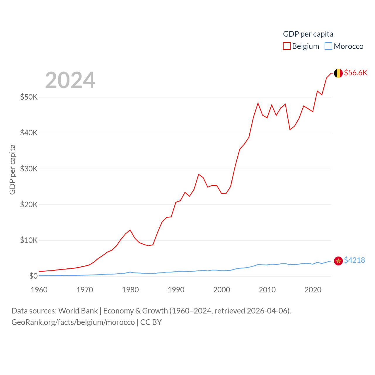 By GDP, Belgium ranks 23/197 ($671B) and Morocco ranks 58/197 ($161B). By GDP per capita, Belgium ranks 18/197 ($56,615), while Morocco ranks 127/197 ($4,218).