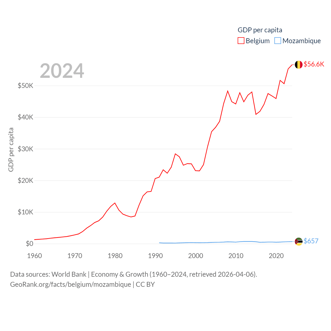 By GDP, Belgium ranks 23/197 ($671B) and Mozambique ranks 123/197 ($22.7B). By GDP per capita, Belgium ranks 18/197 ($56,615), while Mozambique ranks 189/197 ($657).