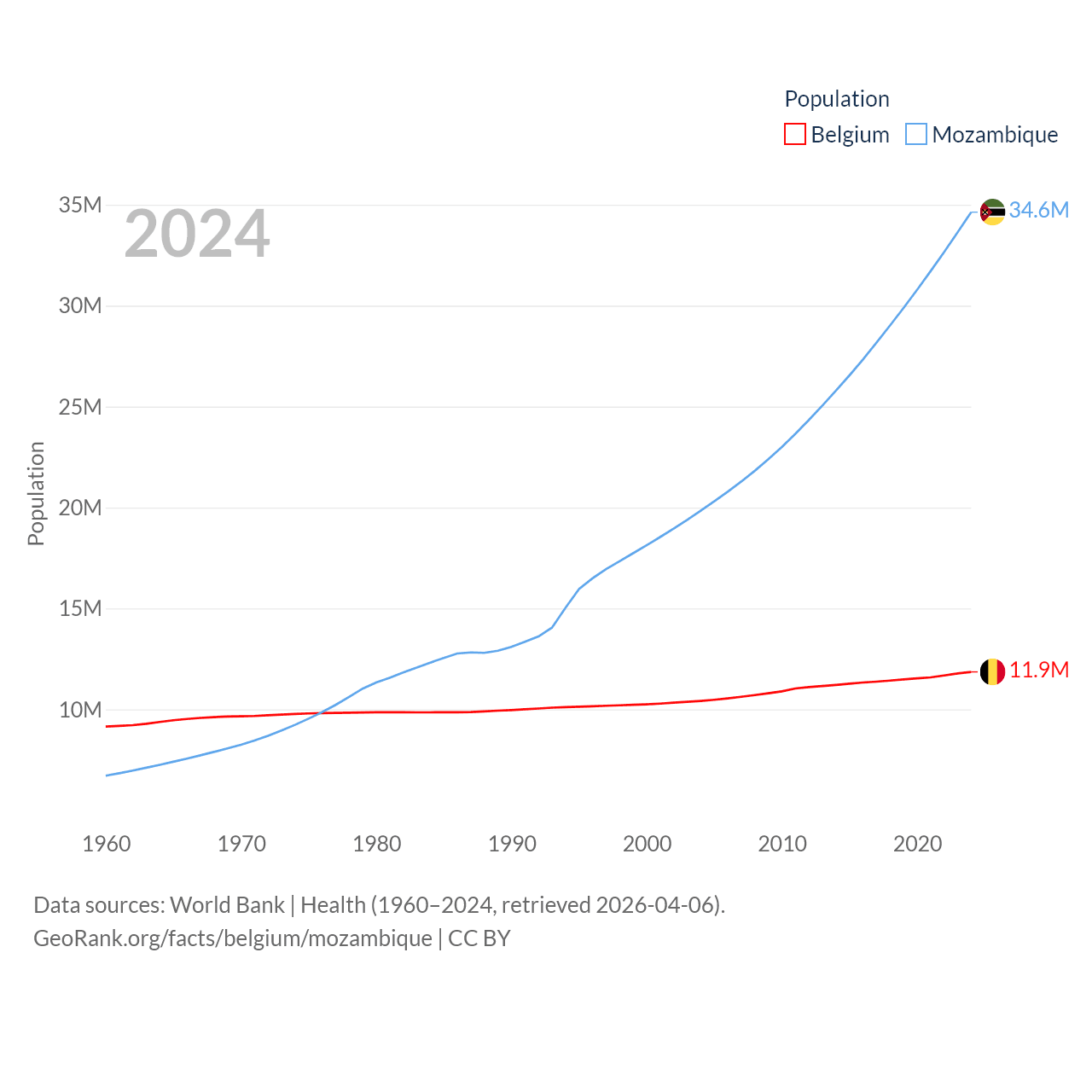Belgium has a population of 11.9M (ranked 82/197), compared with 34.6M in Mozambique (ranked 46/197). Belgium's land area is 11,774 sq mi versus 303,623 sq mi for Mozambique (ranked 136th vs. 34th).
