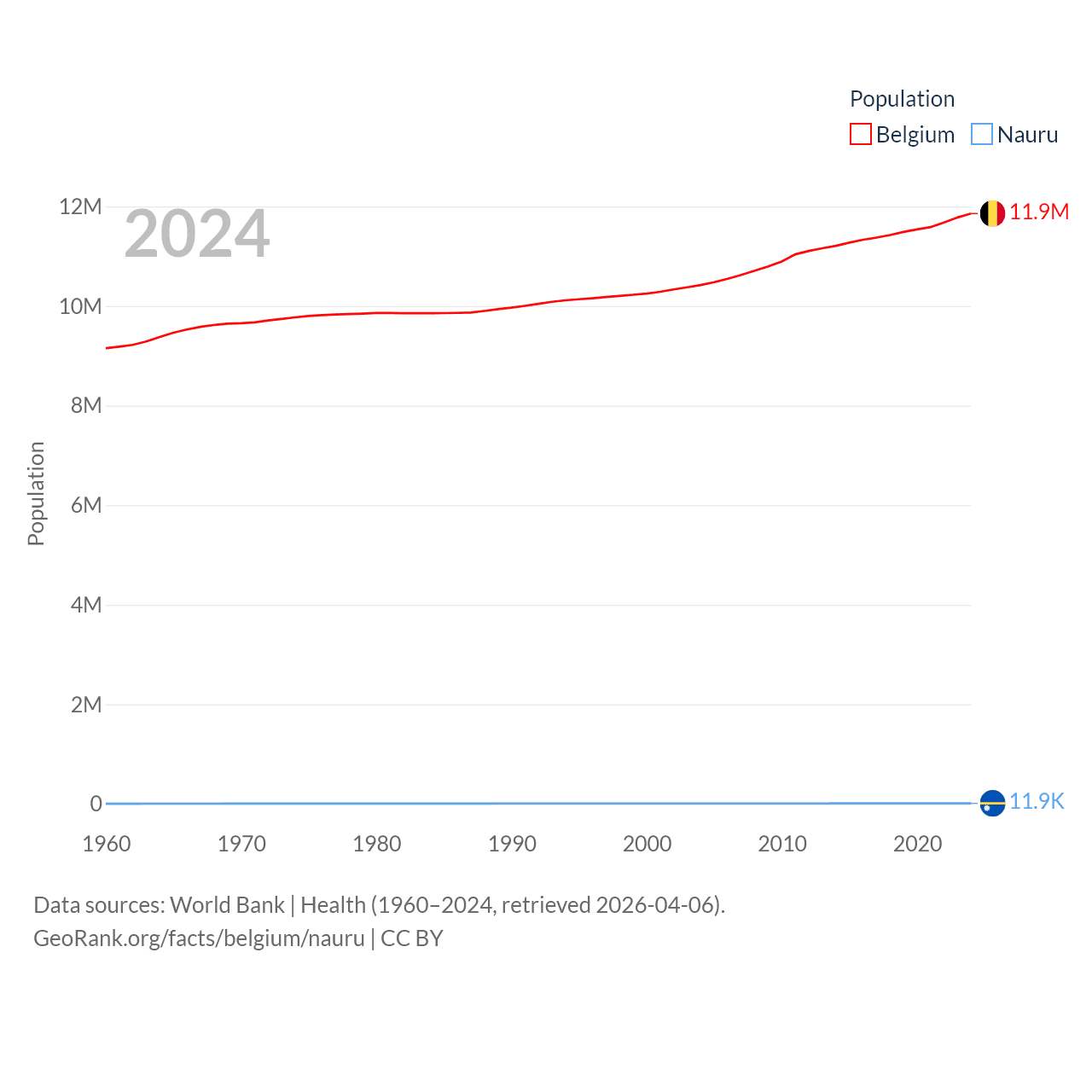 Belgium has a population of 11.9M (ranked 82/197), compared with 11.9K in Nauru (ranked 195/197). Belgium's land area is 11,774 sq mi versus 7.72 sq mi for Nauru (ranked 136th vs. 195th).