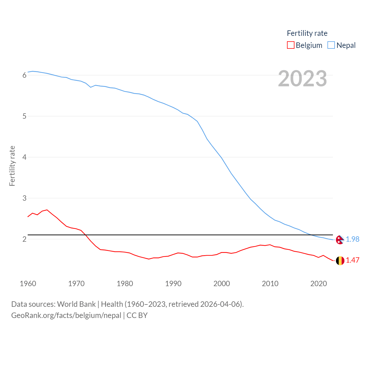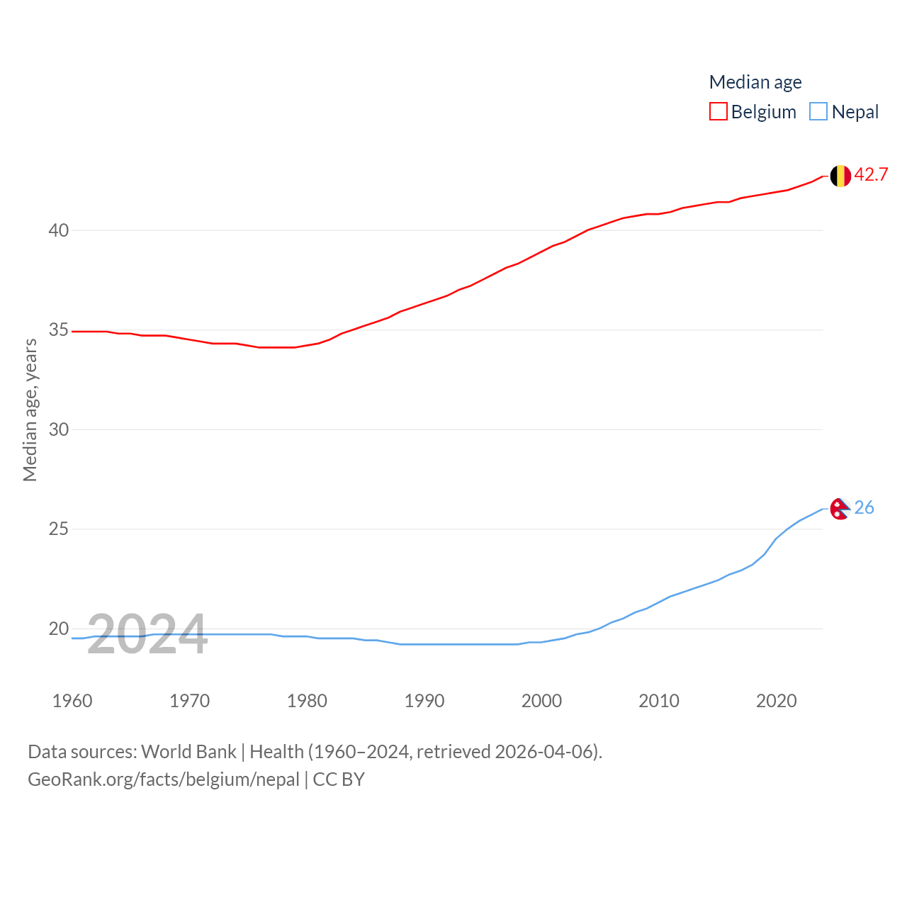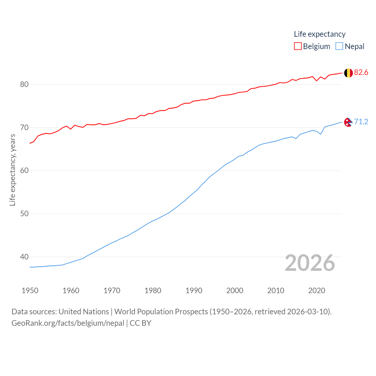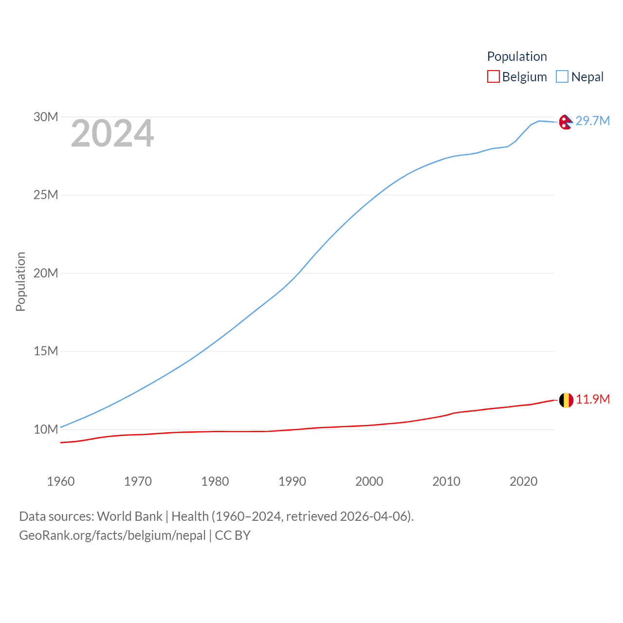 Belgium has a population of 11.9M (ranked 82/197), compared with 29.7M in Nepal (ranked 51/197). Belgium's land area is 11,774 sq mi versus 55,348 sq mi for Nepal (ranked 136th vs. 92nd).
