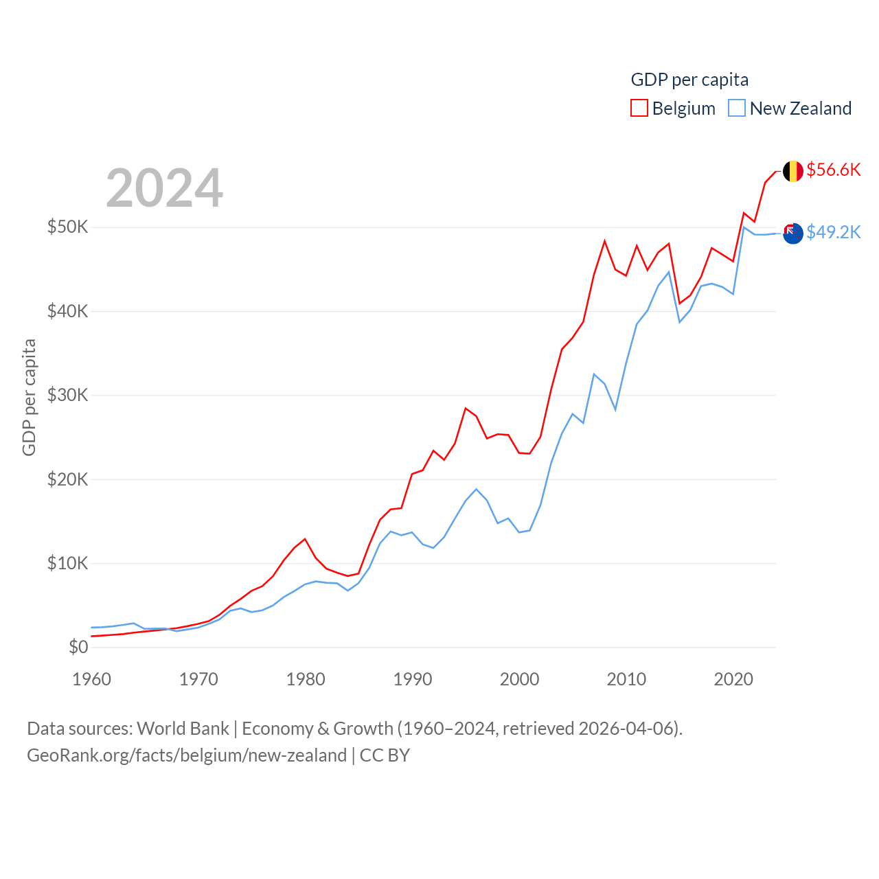 By GDP, Belgium ranks 23/197 ($671B) and New Zealand ranks 52/197 ($260B). By GDP per capita, Belgium ranks 18/197 ($56,615), while New Zealand ranks 26/197 ($49,205).