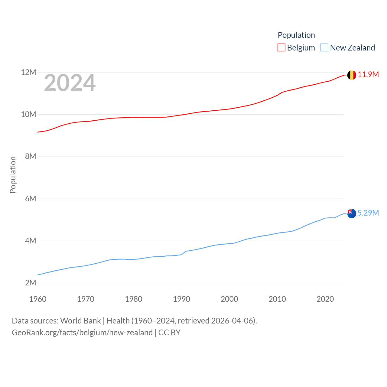 Belgium has a population of 11.9M (ranked 82/197), compared with 5.29M in New Zealand (ranked 123/197). Belgium's land area is 11,774 sq mi versus 101,665 sq mi for New Zealand (ranked 136th vs. 74th).