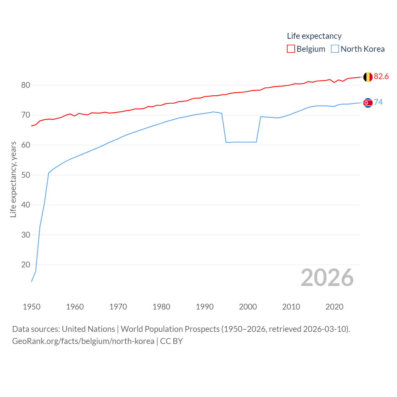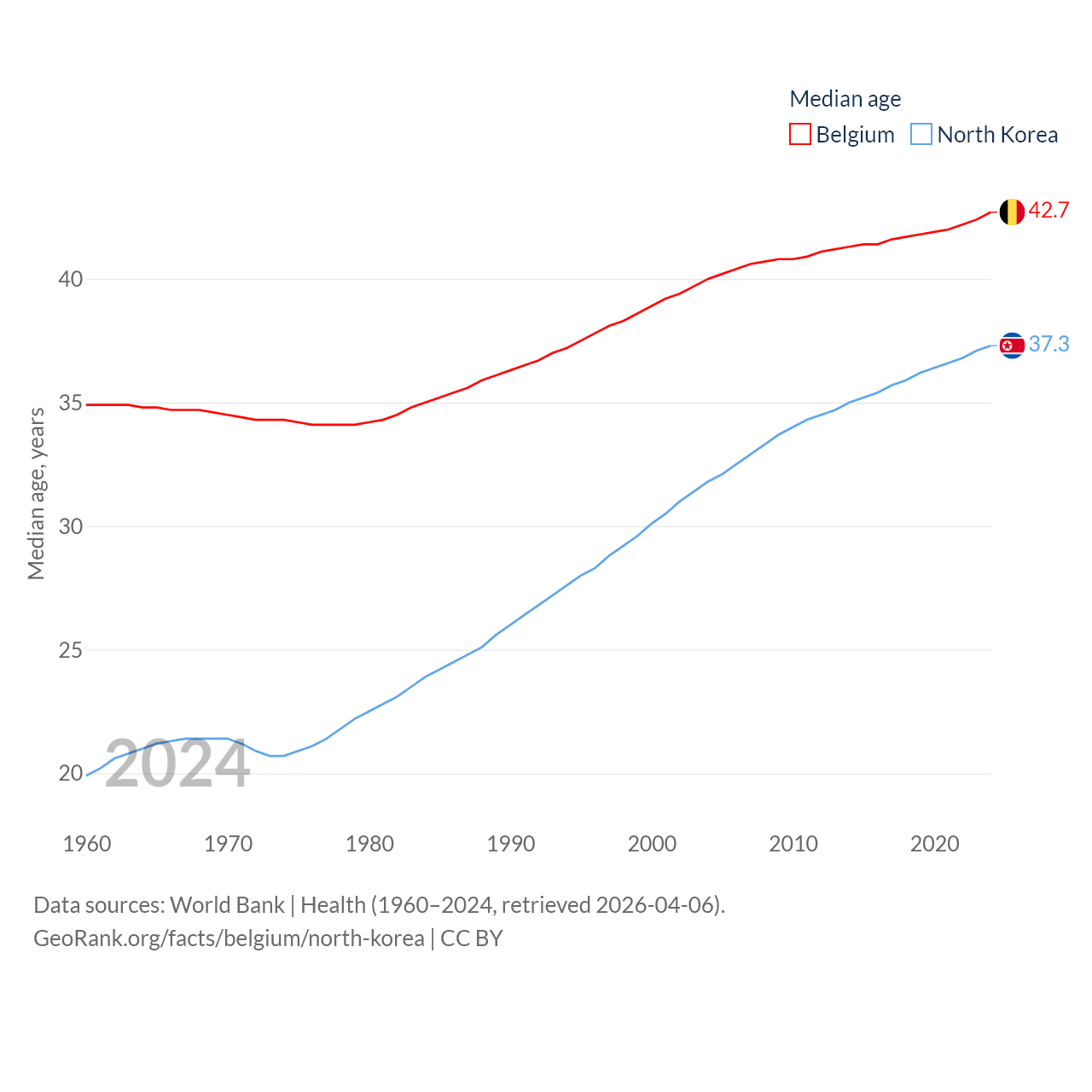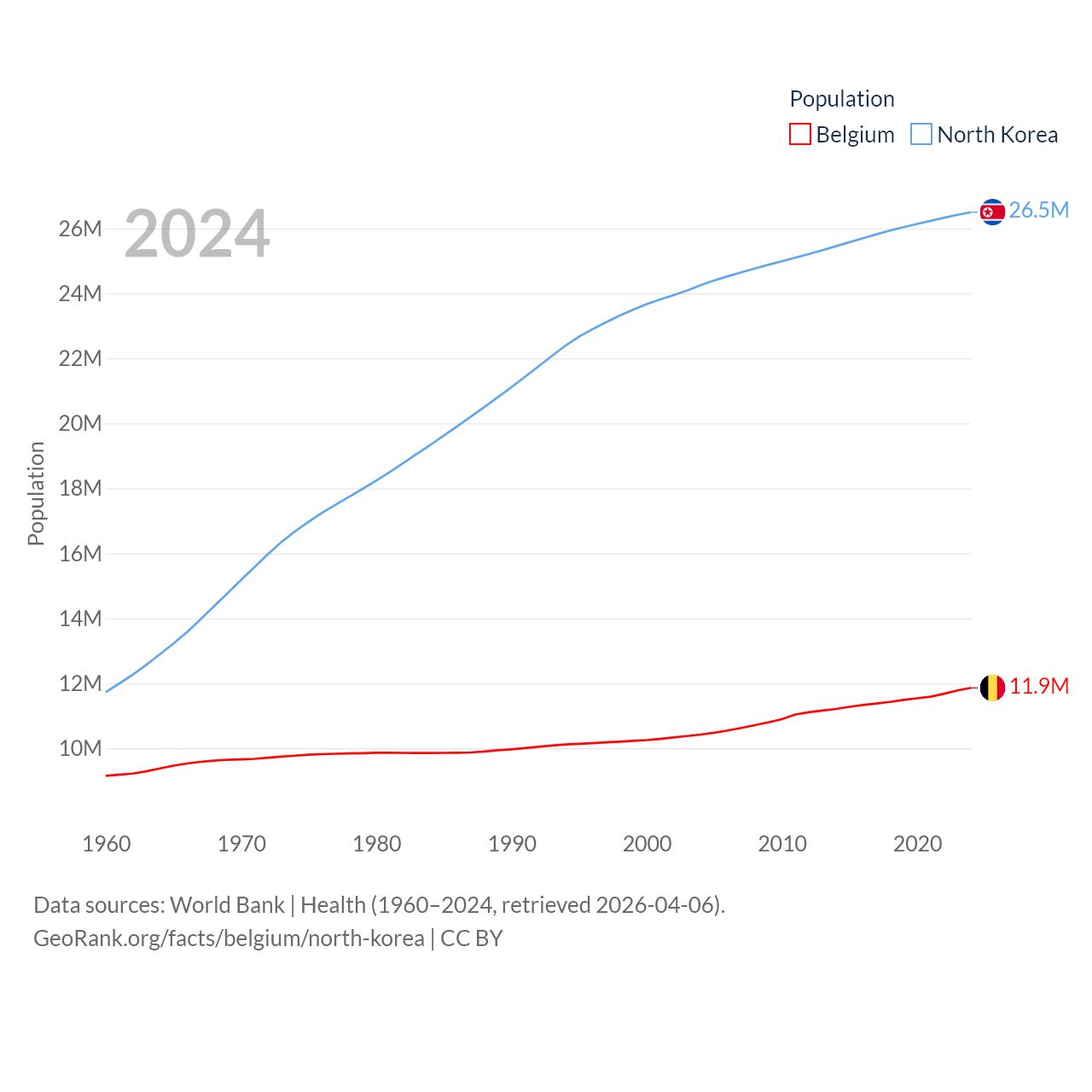 Belgium has a population of 11.9M (ranked 82/197), compared with 26.5M in North Korea (ranked 56/197). Belgium's land area is 11,774 sq mi versus 46,491 sq mi for North Korea (ranked 136th vs. 97th).